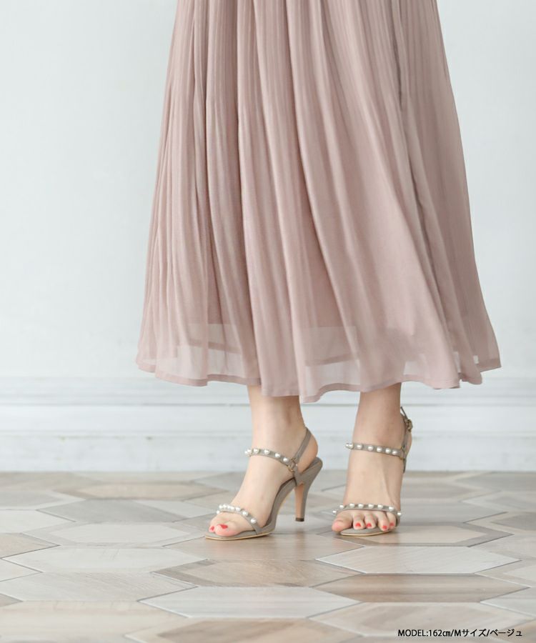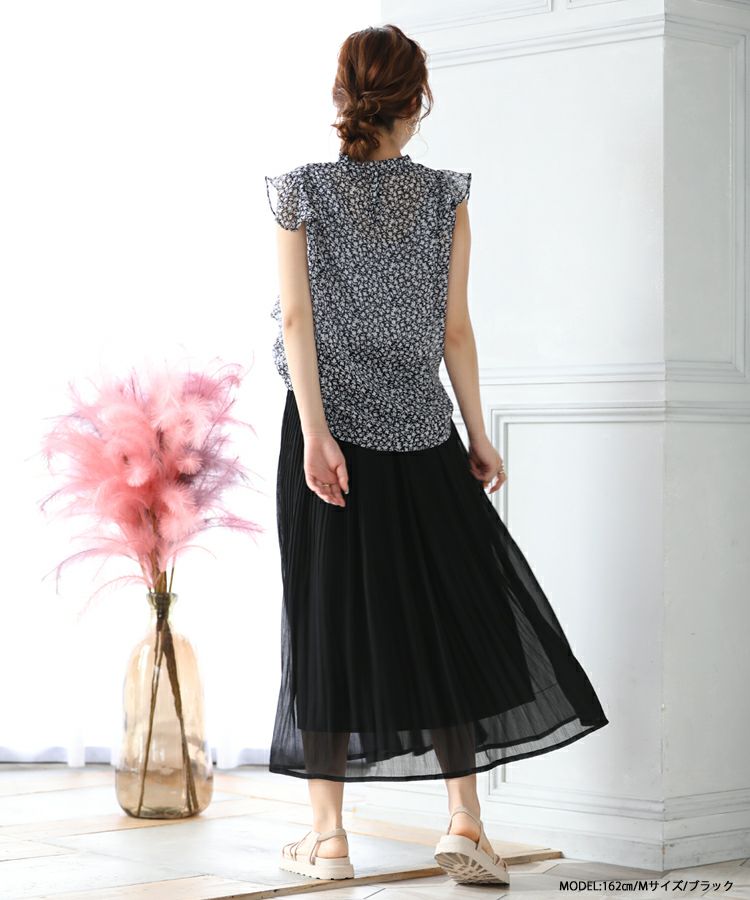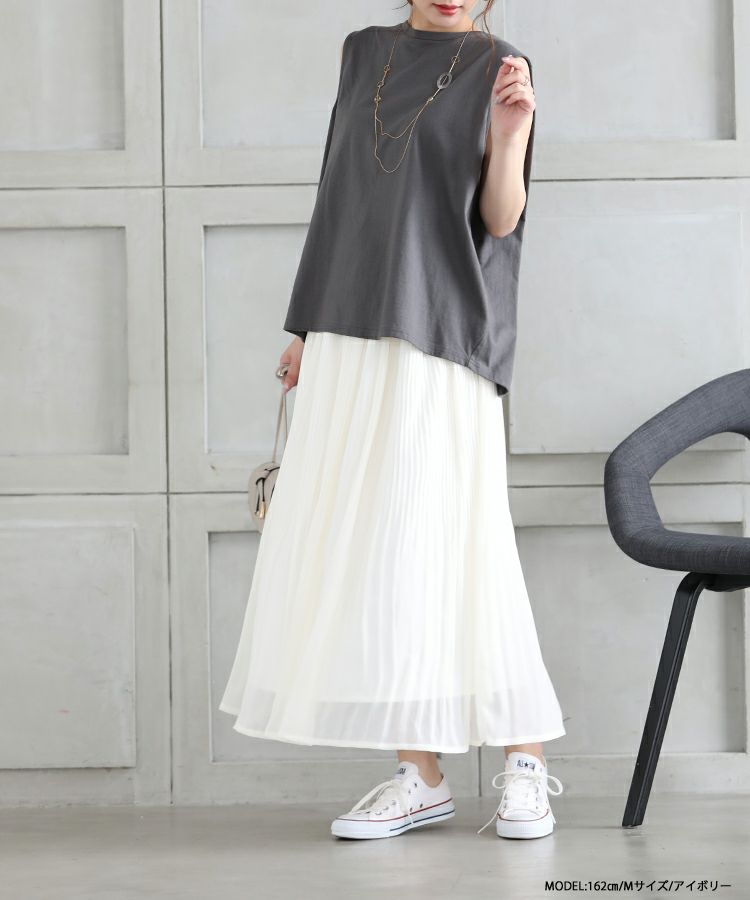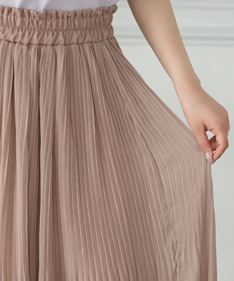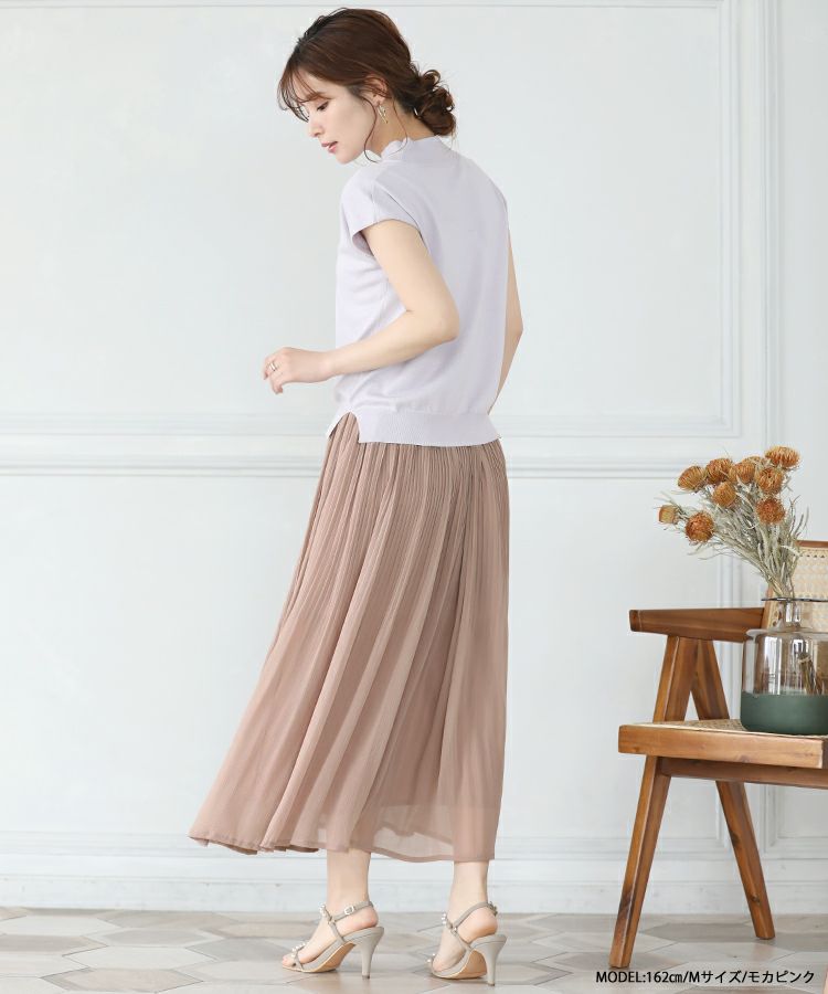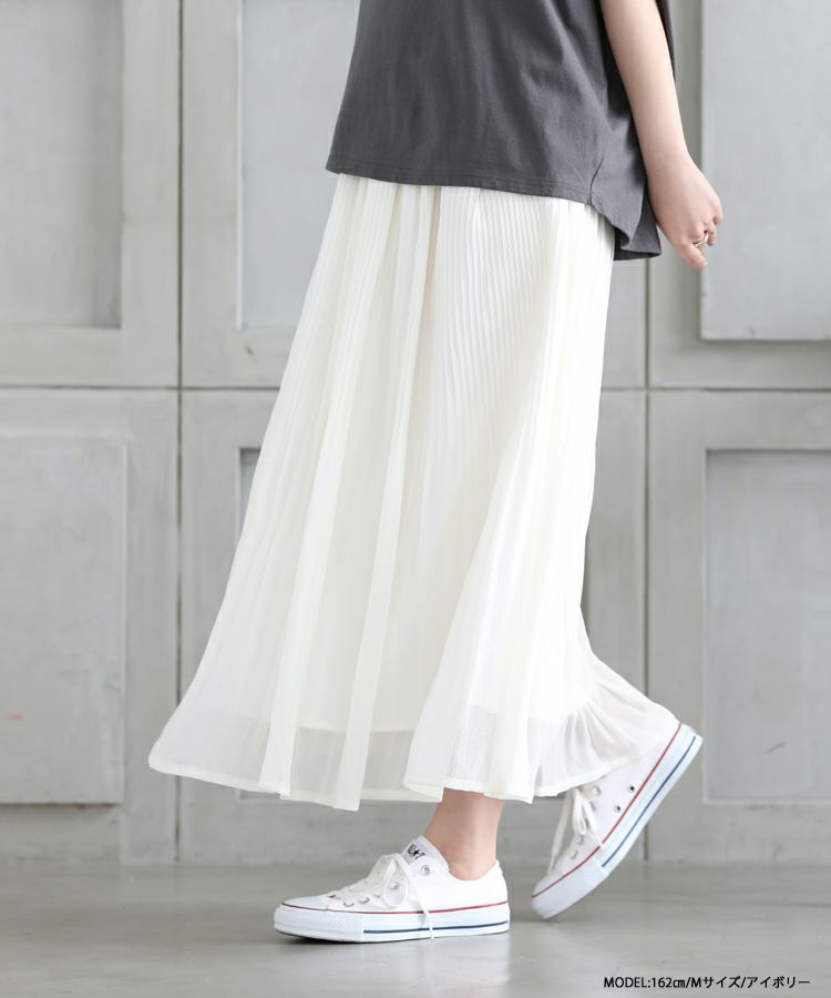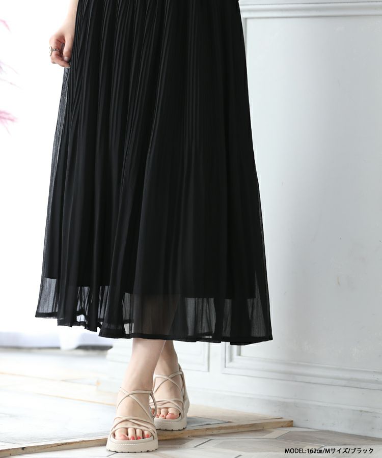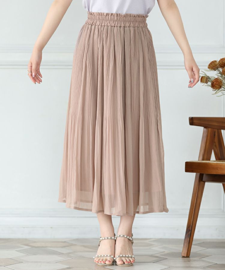 軽くシアーな素材シフォン楊柳に消しプリーツを加工したプリーツスカート 今や定番商品のプリーツスカートはシフォン素材で着心地がよく これからの季節にピッタリのスカートです。