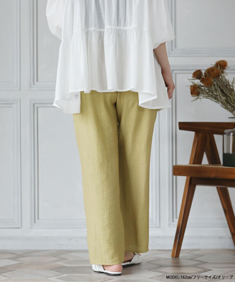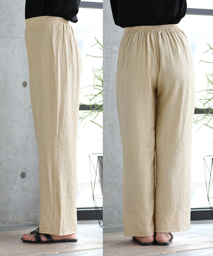 サイズ感に拘り、程よくゆるいラインで履くだけでこなれた印象に仕上げます ストレートシルエットのパンツは、一本あれば重宝する便利ボトム 凹凸のある生地感がこれからの季節にピッタリです◎ 同素材のジレワンピースとセットアップ着用すれば、さらに鮮度の高いコーディネートに♪ トップスを選ばない、様々なコーディネートに対応する万能ボトムです◎