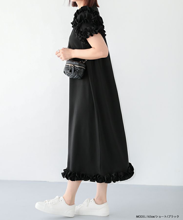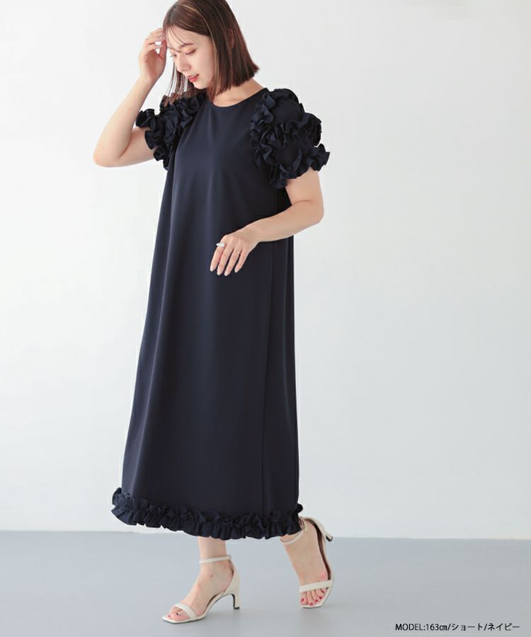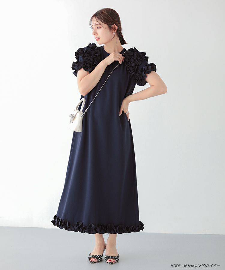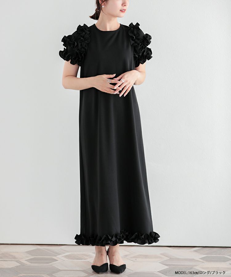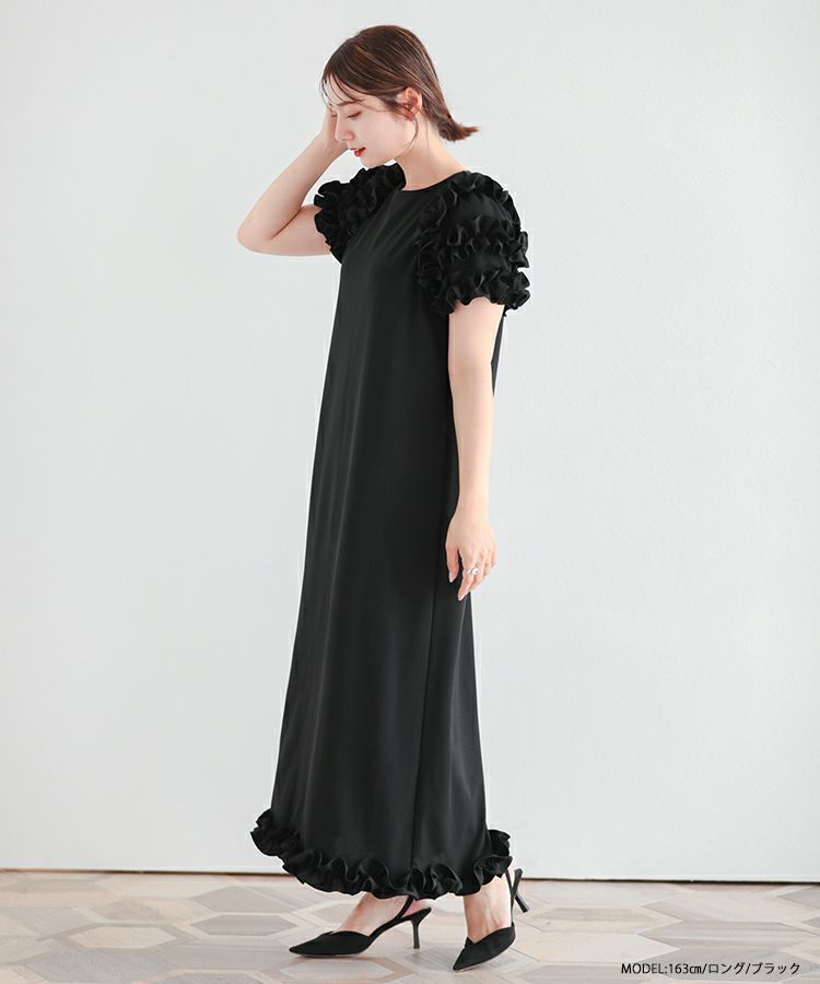 1枚で華やかに着用できるフリルたっぷりのロングワンピースが登場。