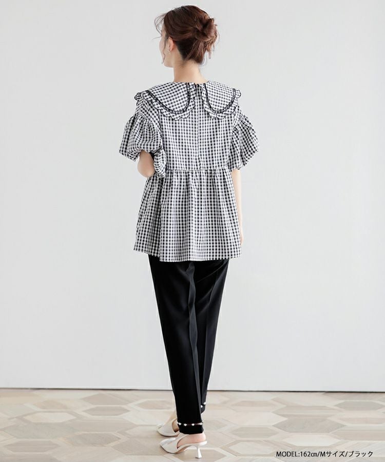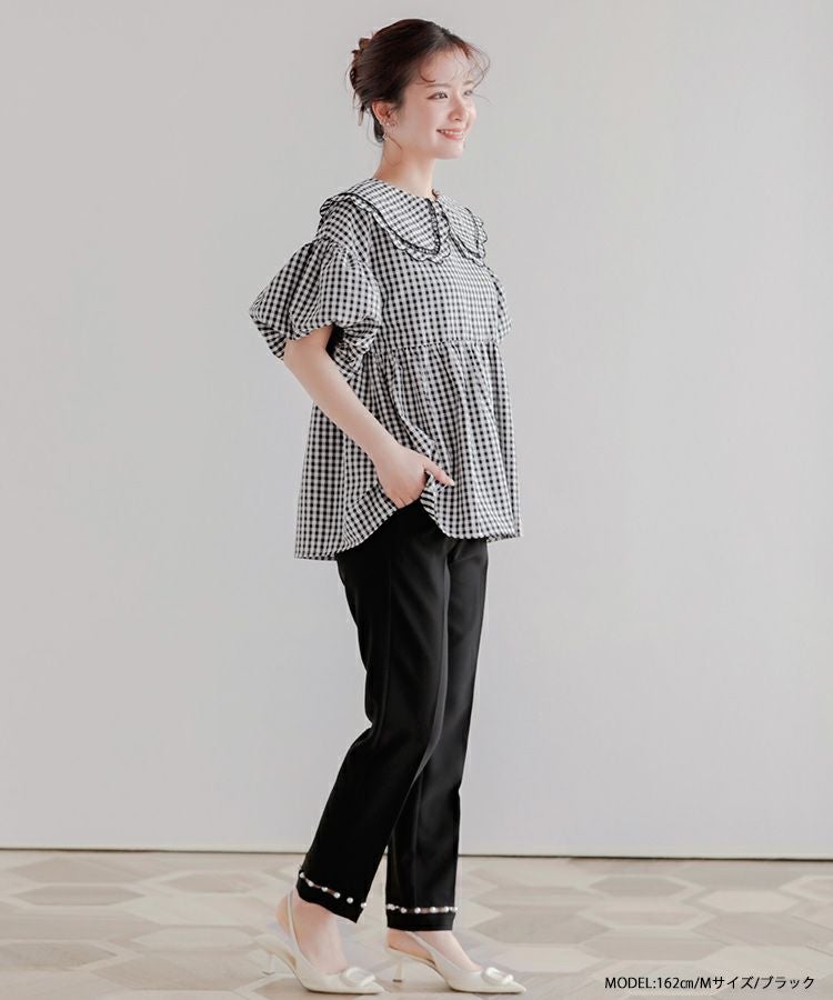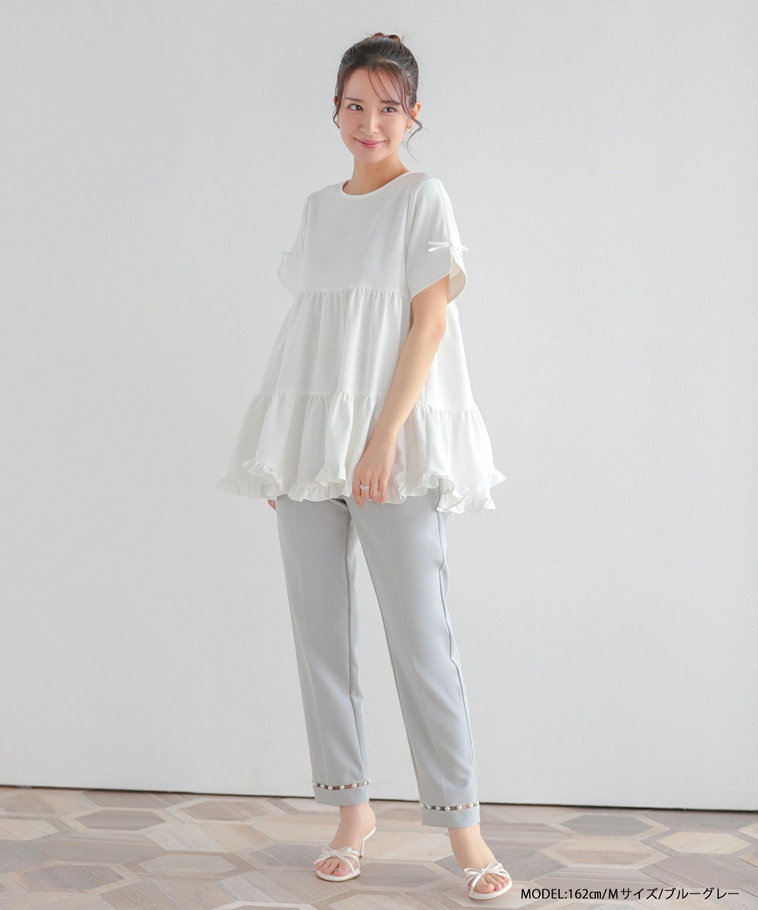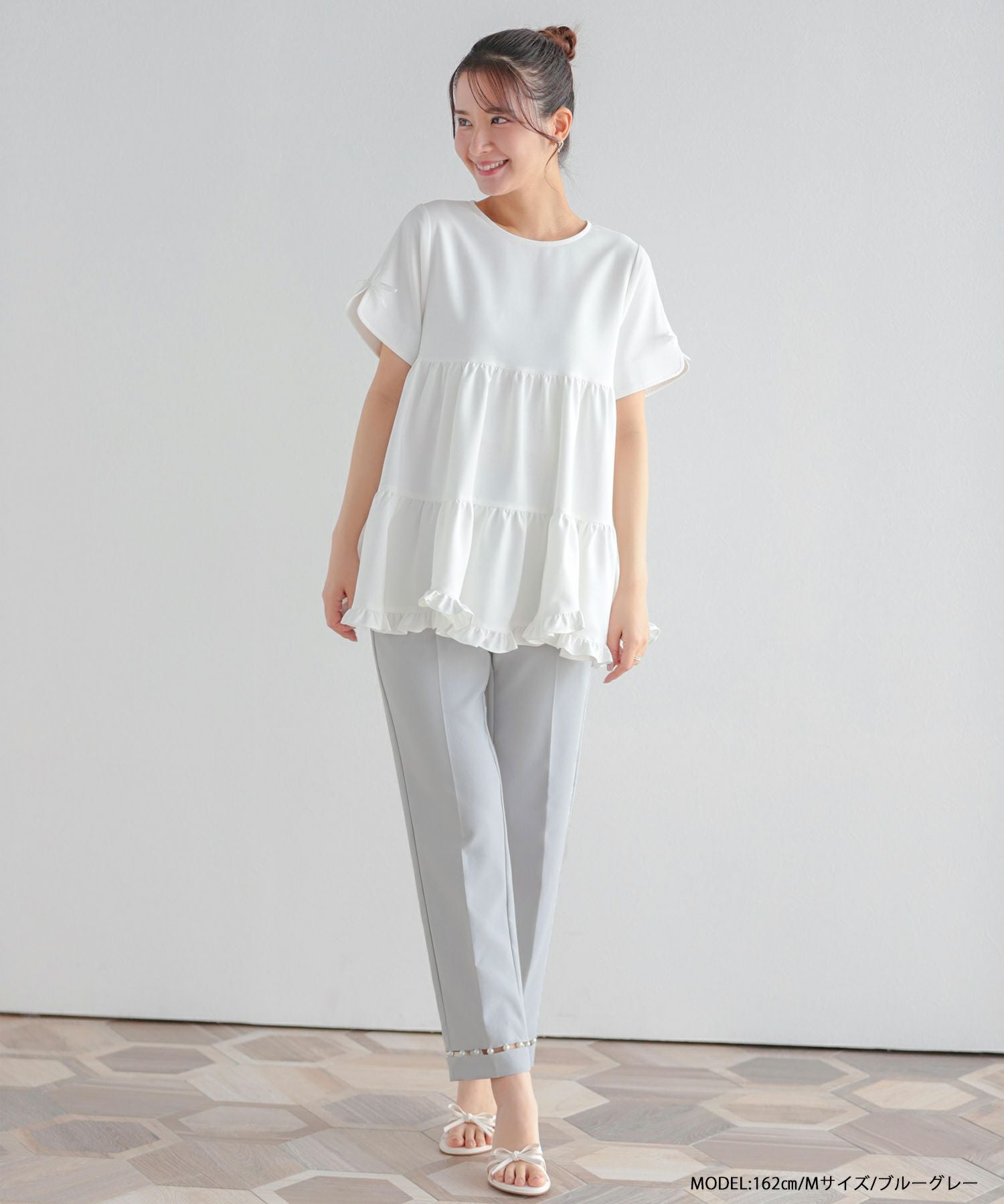 パールが高見えするし、綺麗めコーデにぴったりです。 脚もすらっと綺麗に見せてくれるパンツだと思います。 オケージョンとしても着れそうです。