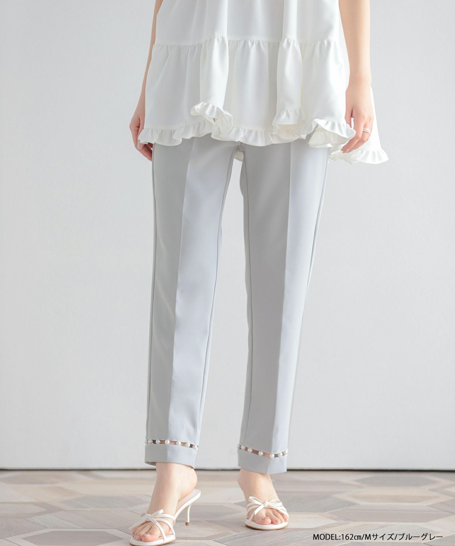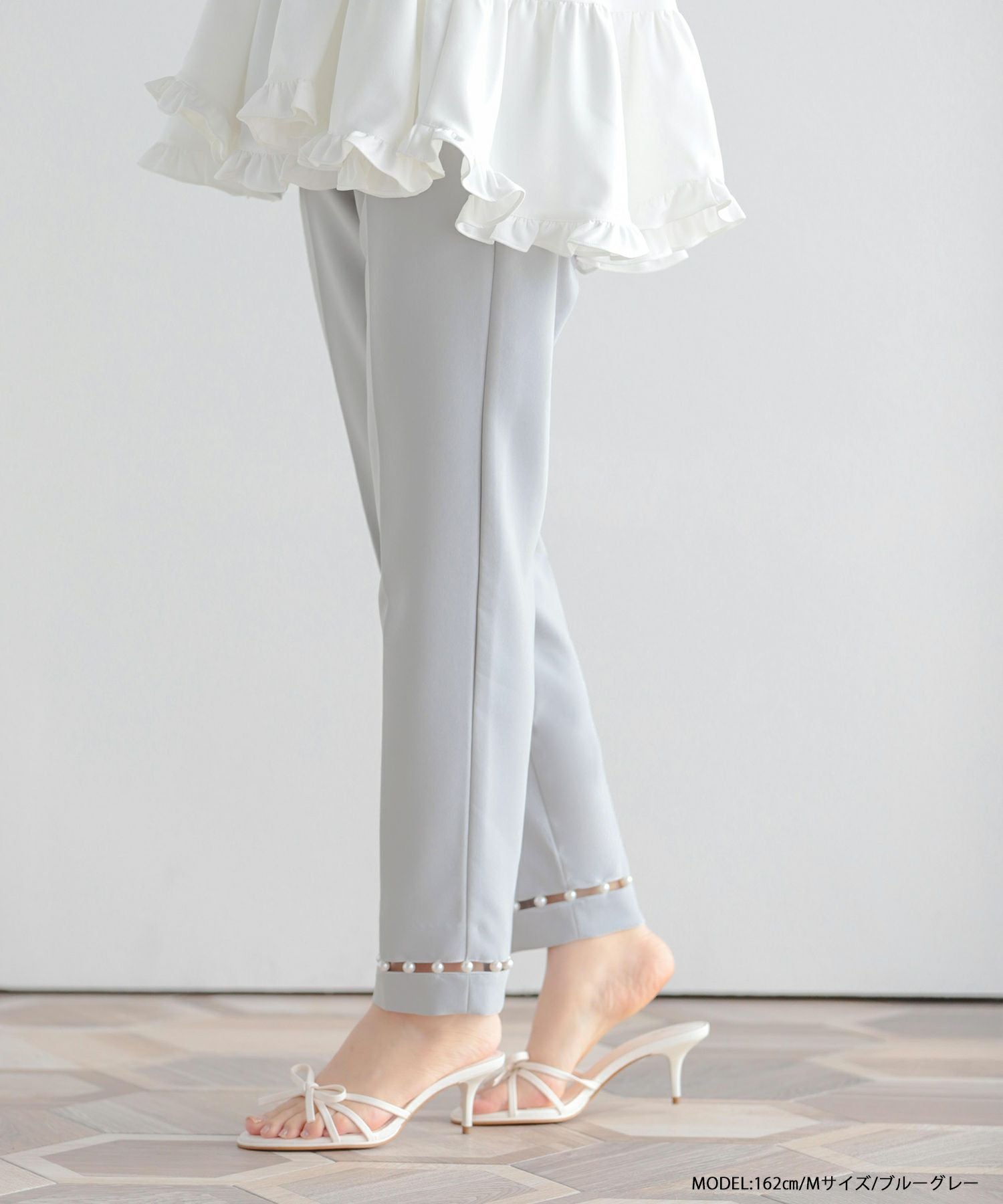 裾にあしらわれたパールのデザインが華やかな足元に。