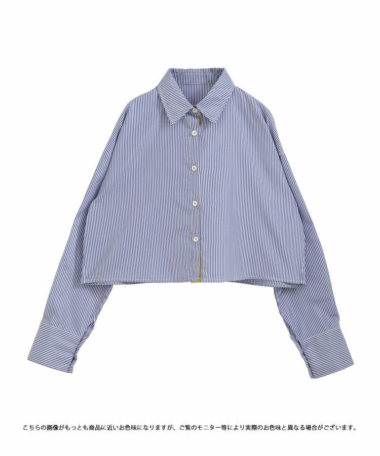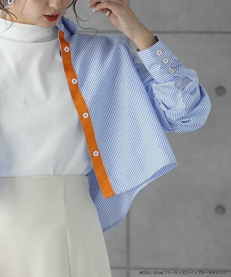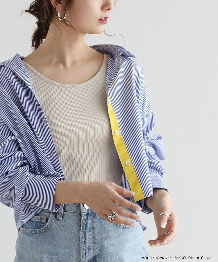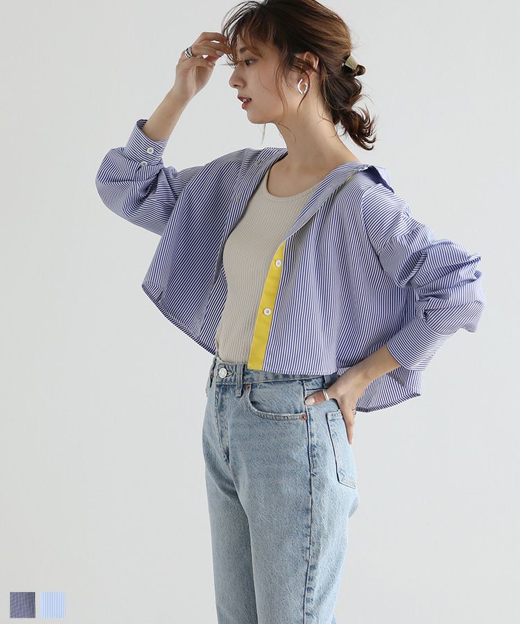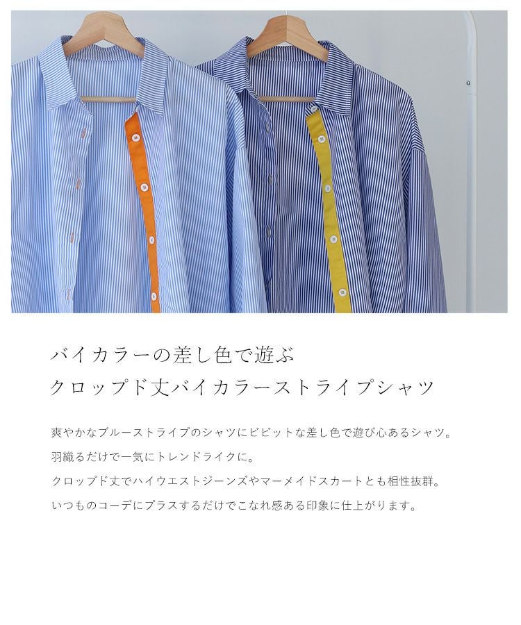 春コレクション 2022春 2022ss 春新作 春秋 春物  シャツ ストライプ ストライプシャツ クロップド丈 バイカラー クロップド丈バイカラーストライプシャツ【メール便】