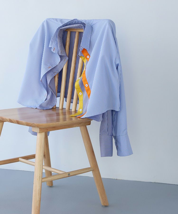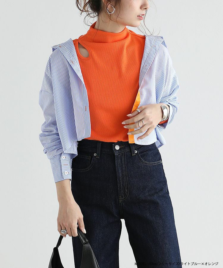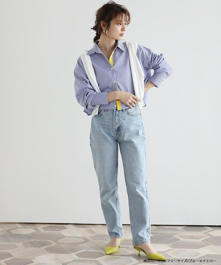 爽やかなストライプシャツをショート丈にし、一気に旬顔アイテムに。