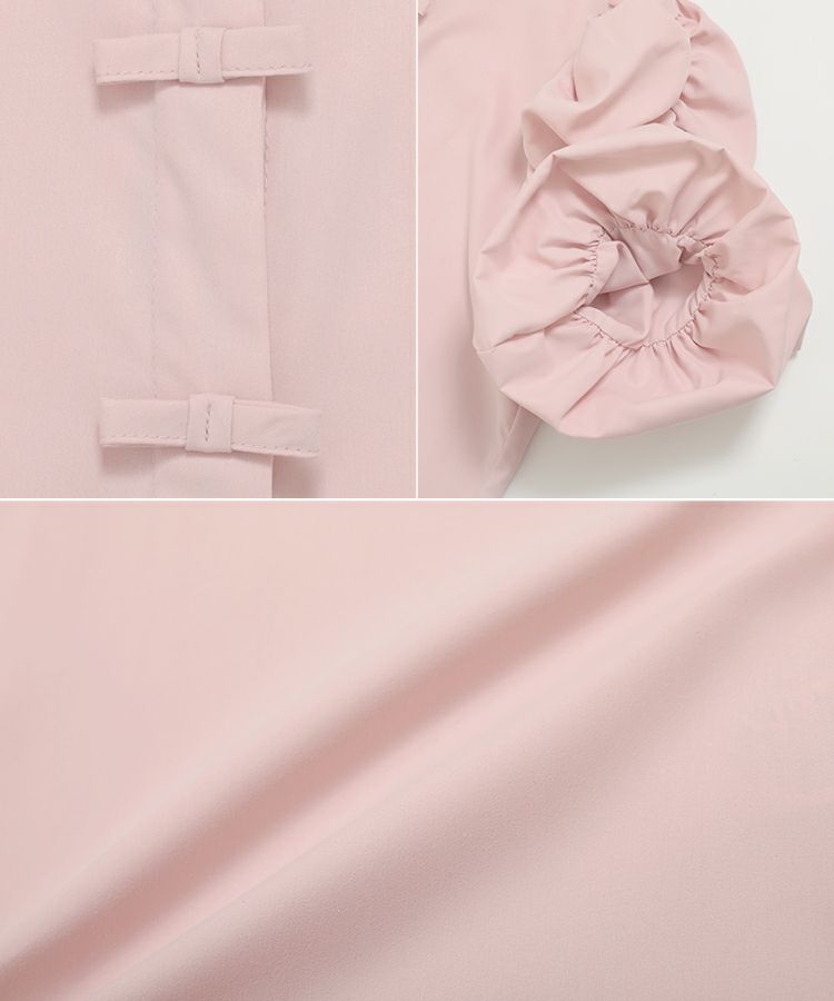 首元はバンドカラーでフロントに小ぶりなリボンを3つあしらい