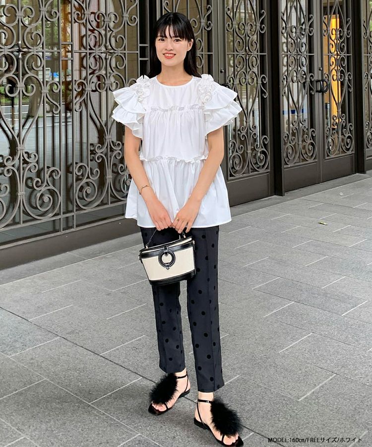 フリルをたっぷりとあしらった大人可愛いフレアトップスは