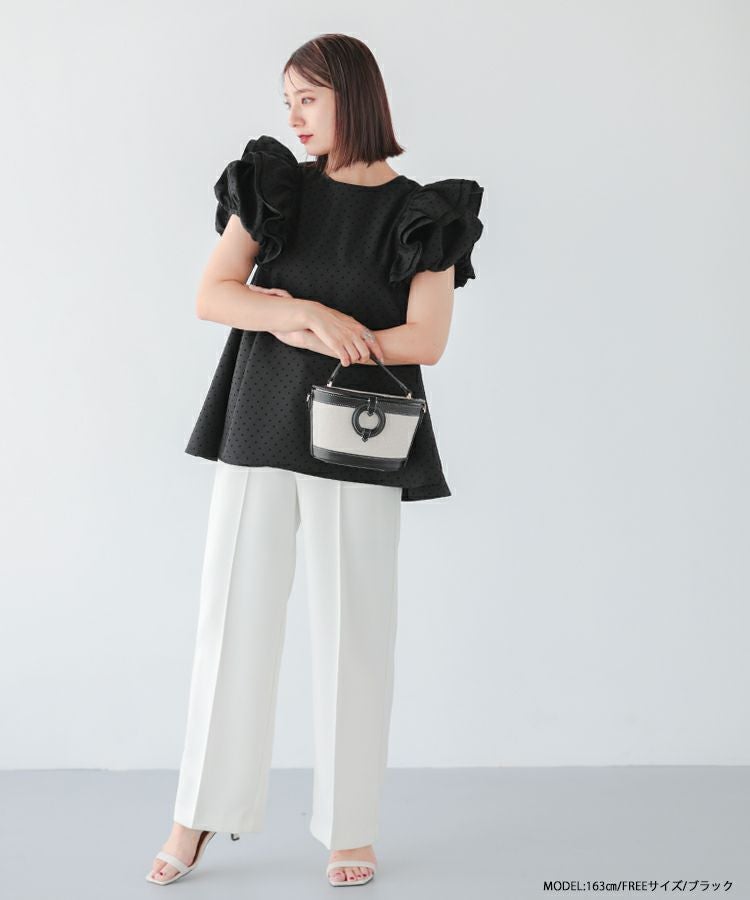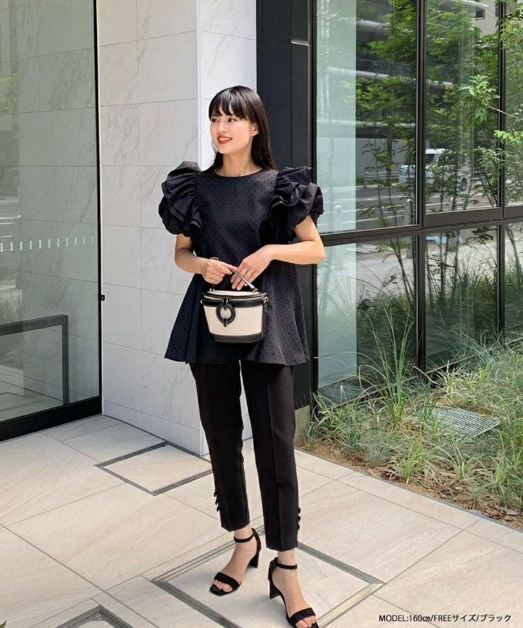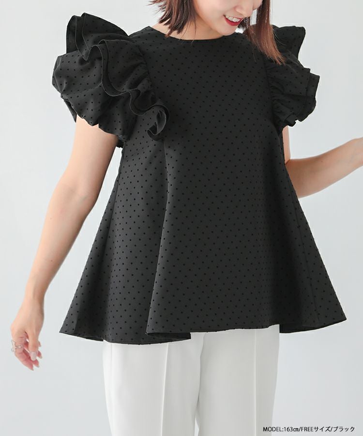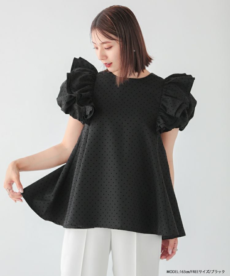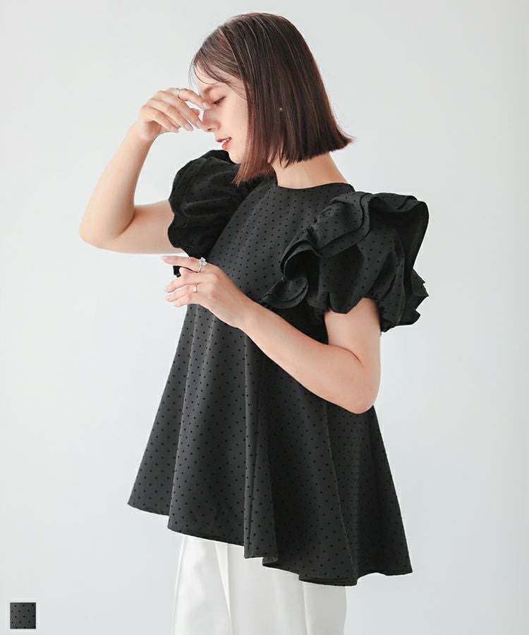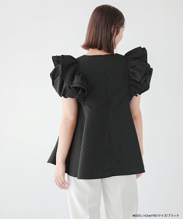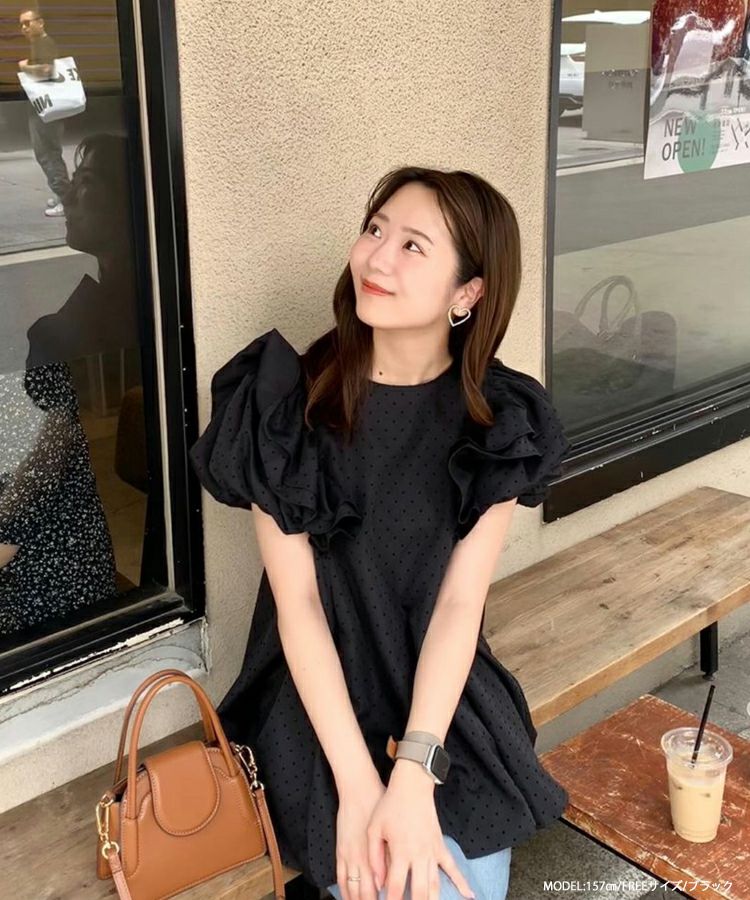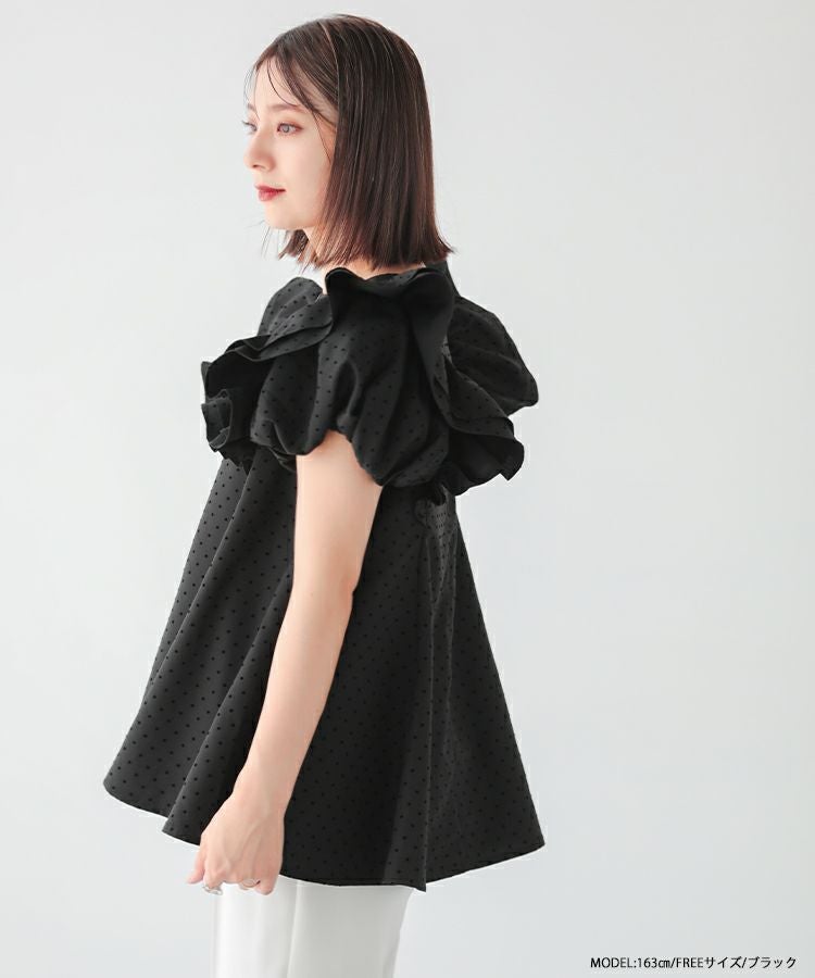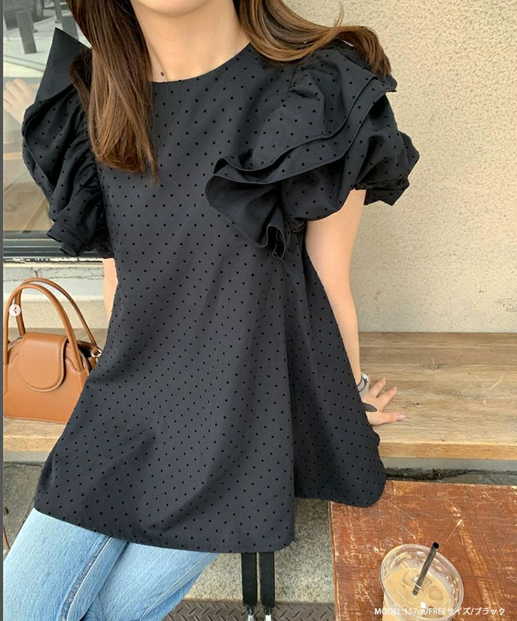 2023ss 夏新作 フロッキードット ブラウス ペプラム バルーンスリーブ フロッキードットバルーンスリーブトップス【宅配便】