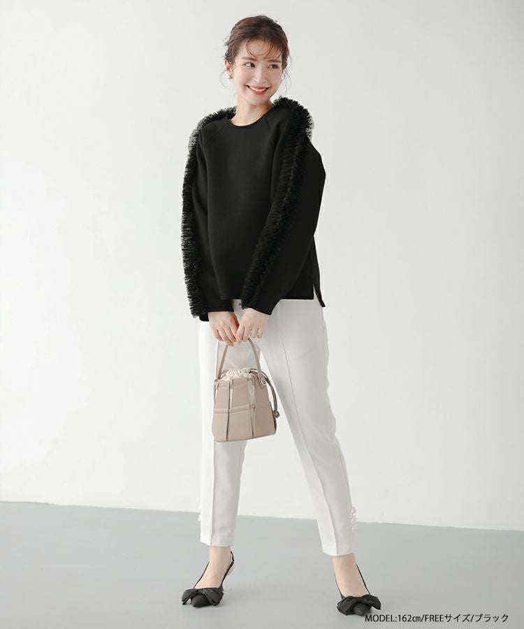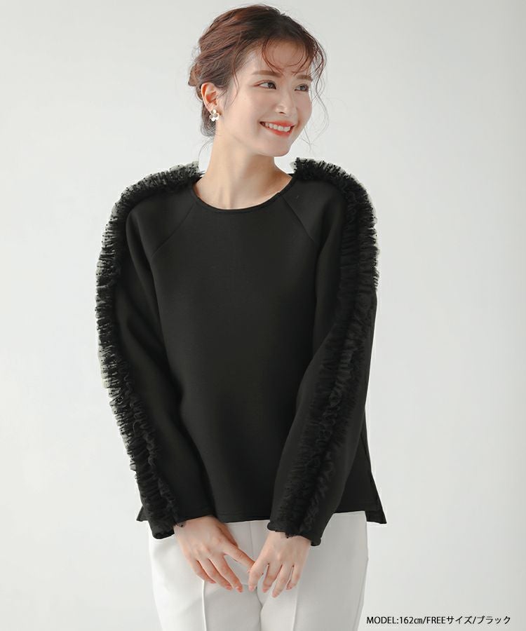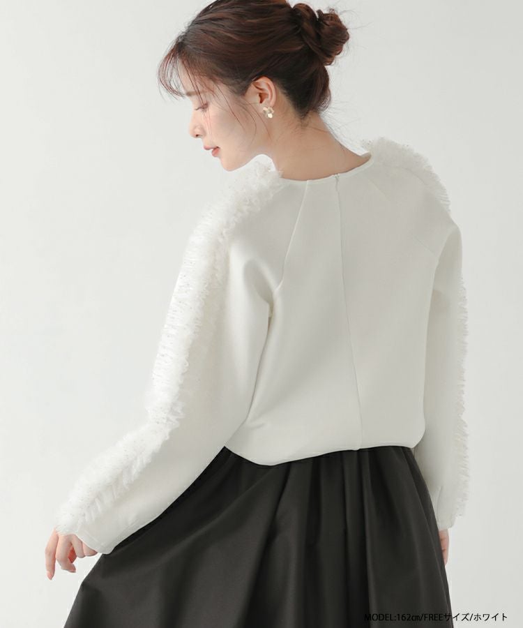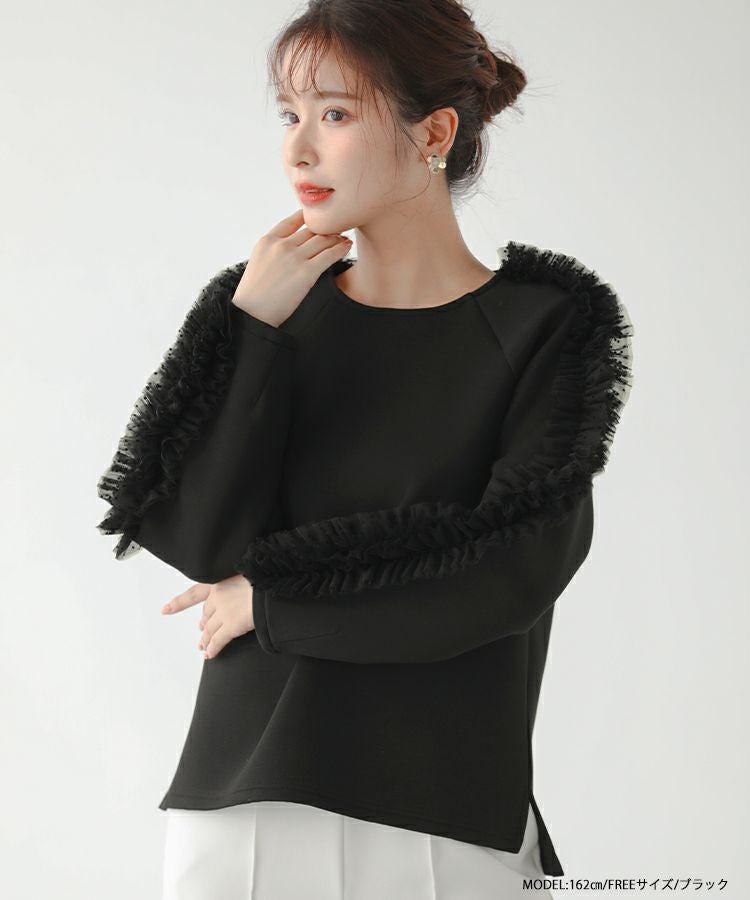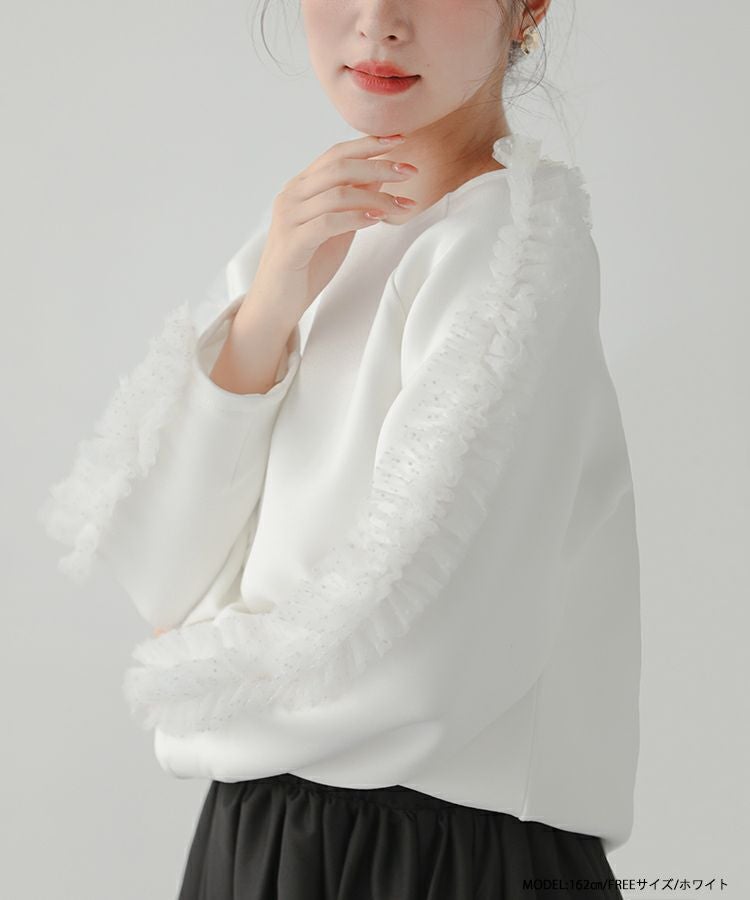 袖のドットチュールフリルが大人フェミニンなトップス。