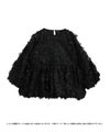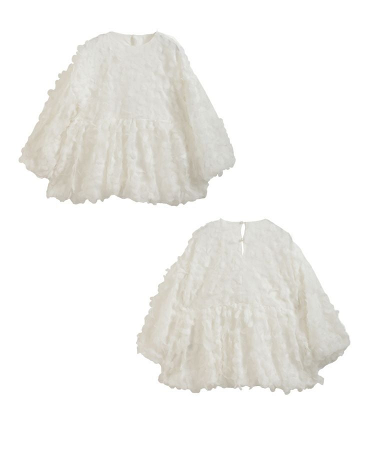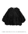 チュール生地のフラワーモチーフを重ねて縫い付けたトップスは