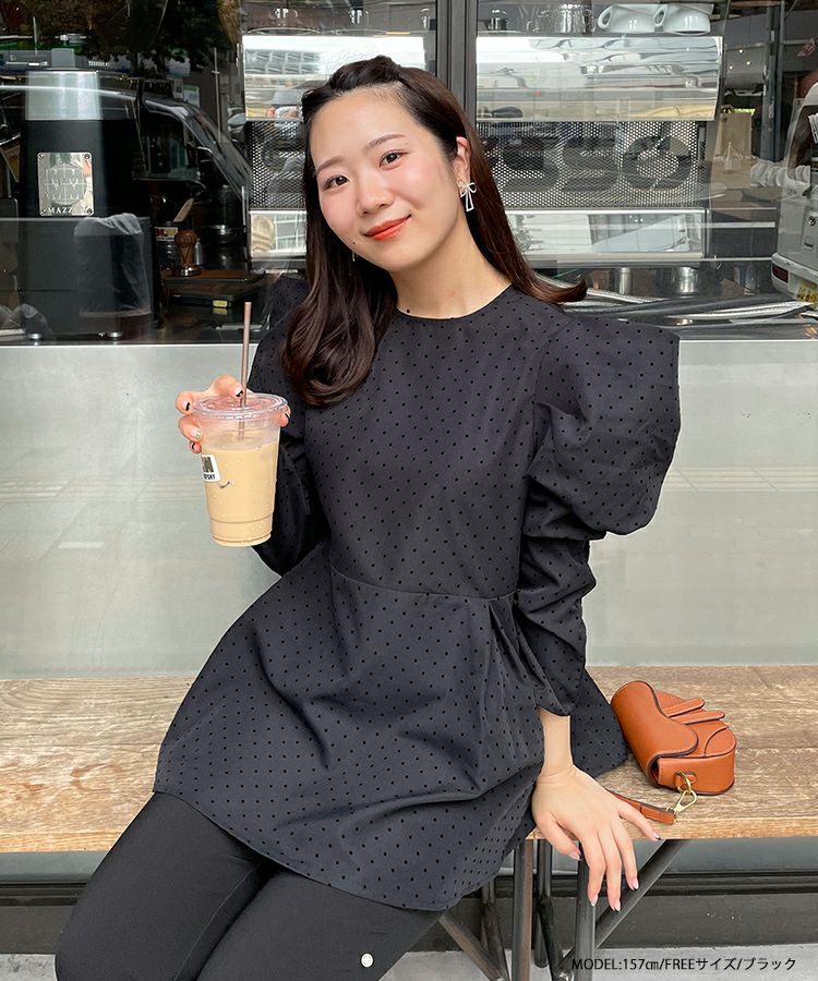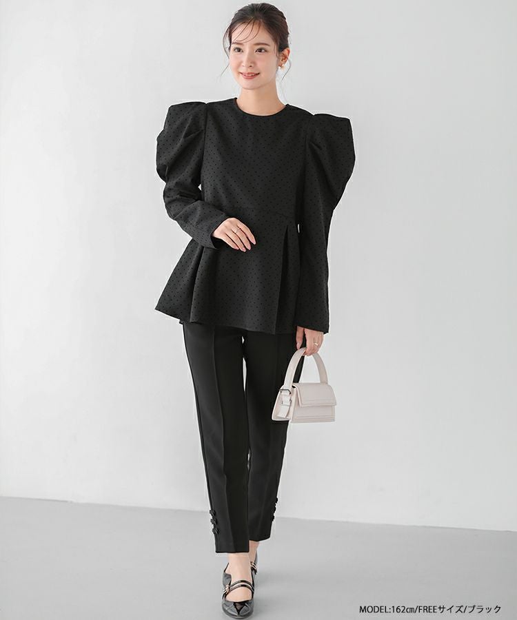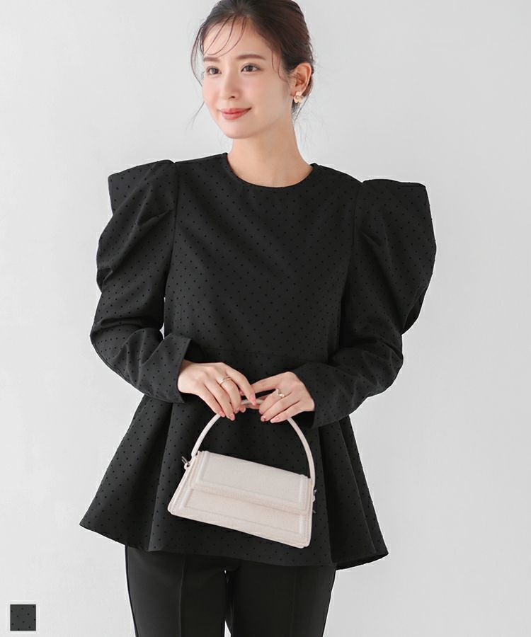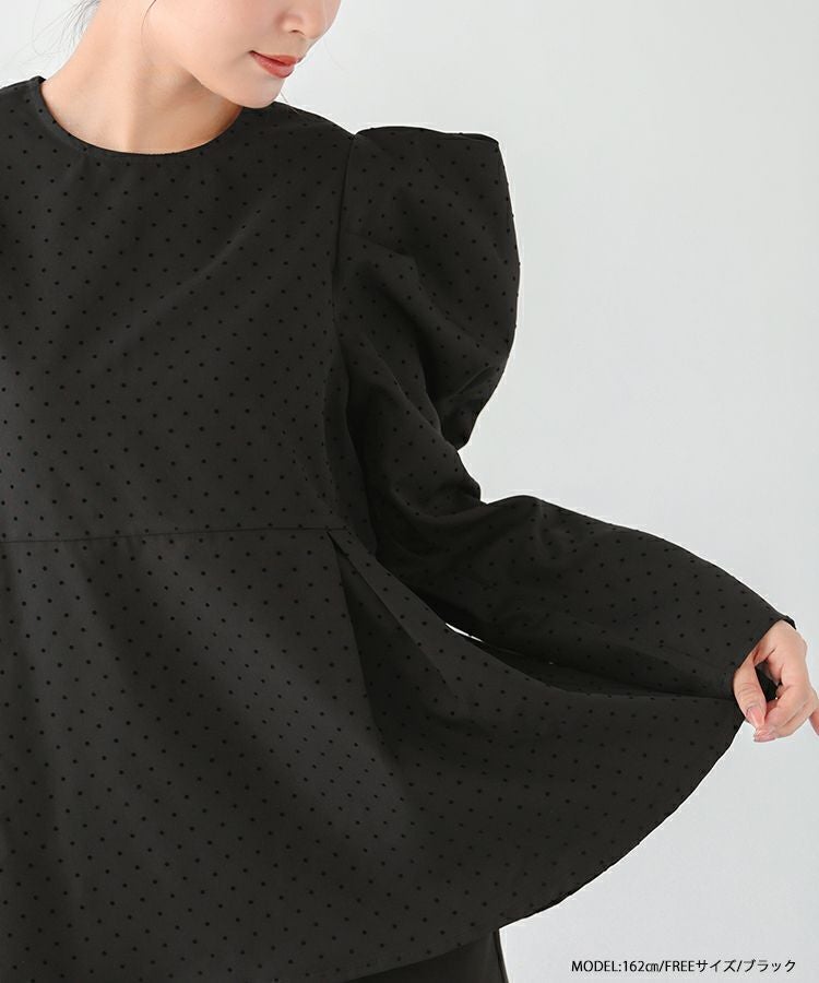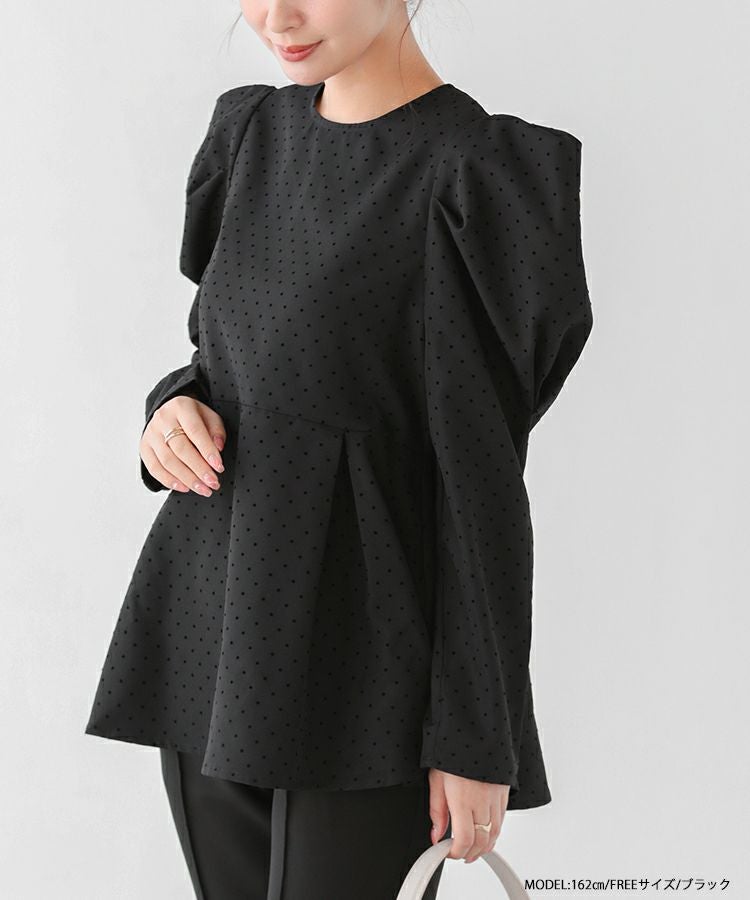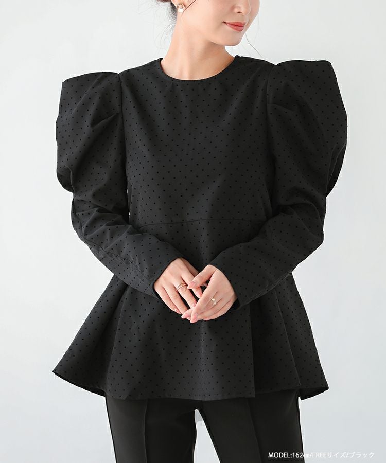 2023aw パワショル ドット フロッキードット ブラウス ペプラム バルーンスリーブ 長袖 フロッキードットパワショルブラウス【宅配便】