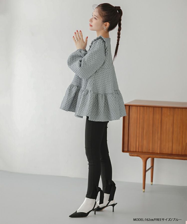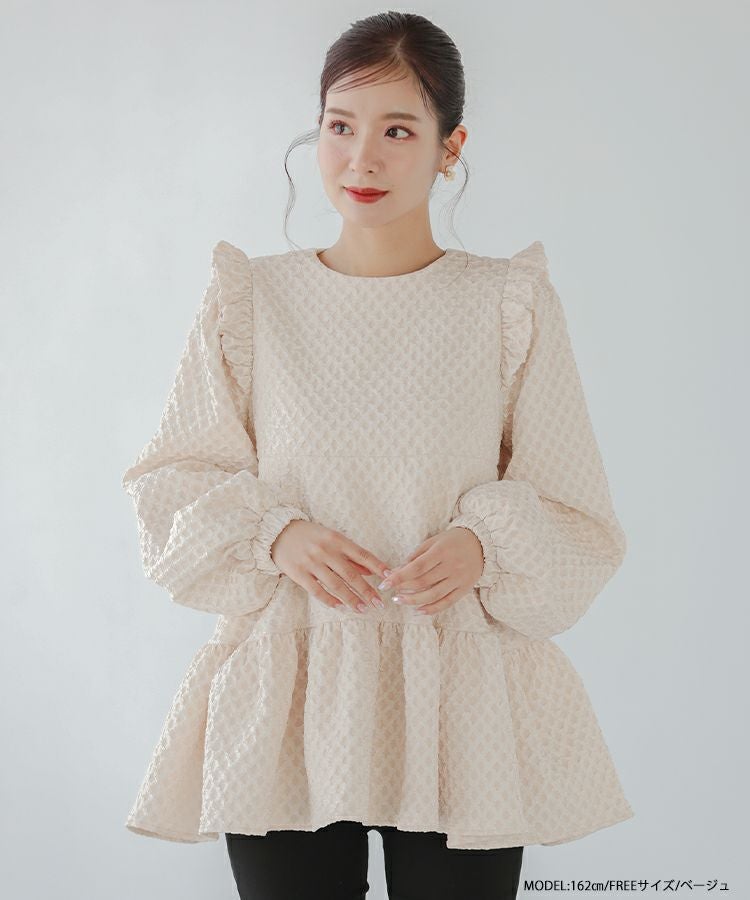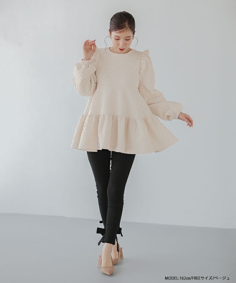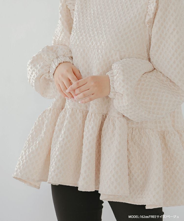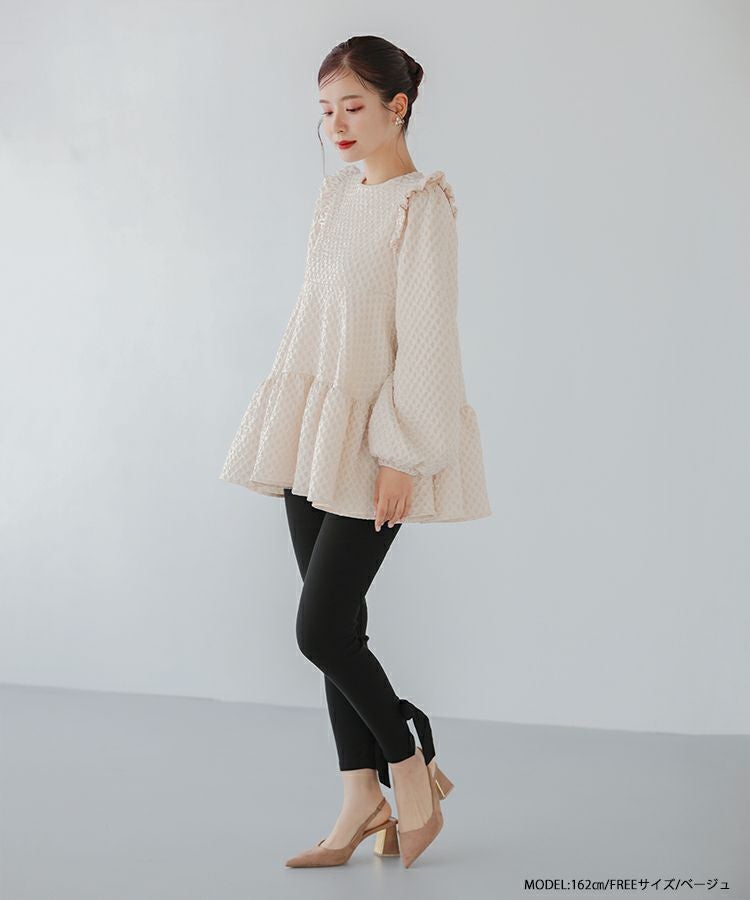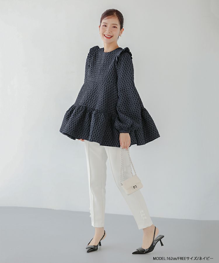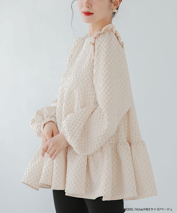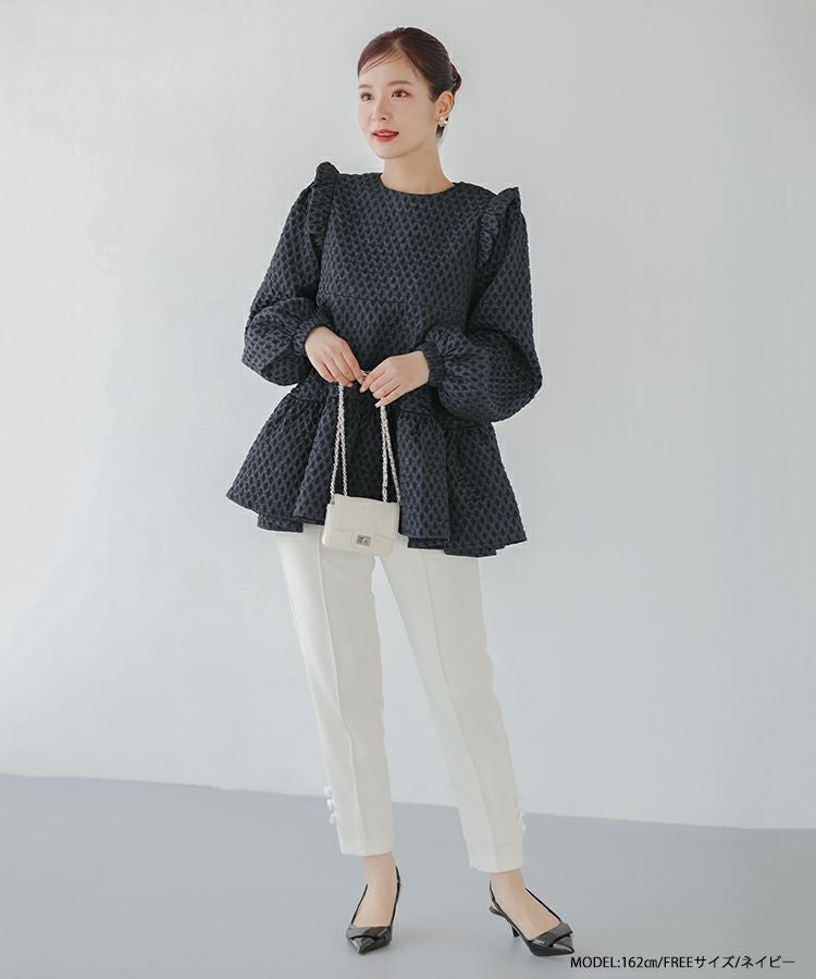 立体感のあるダイヤ柄のジャガード生地が高級感のあるトップス。