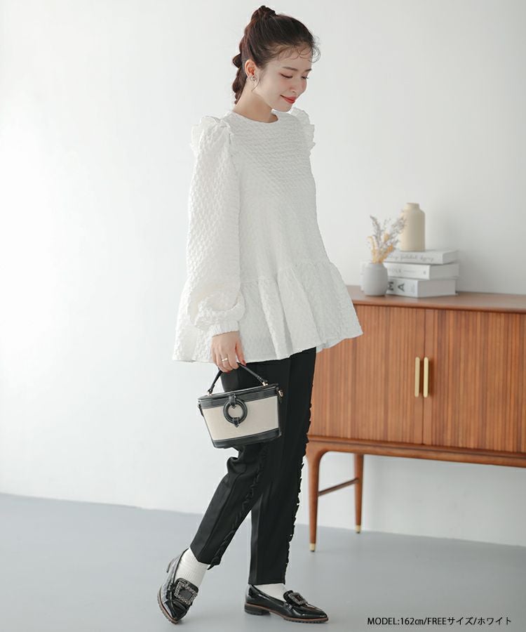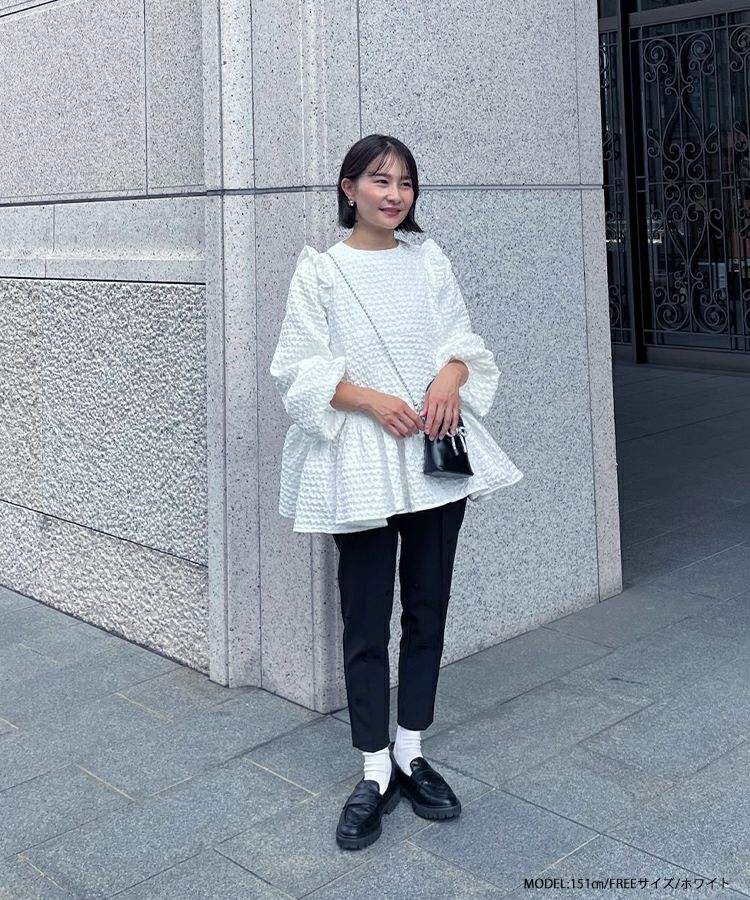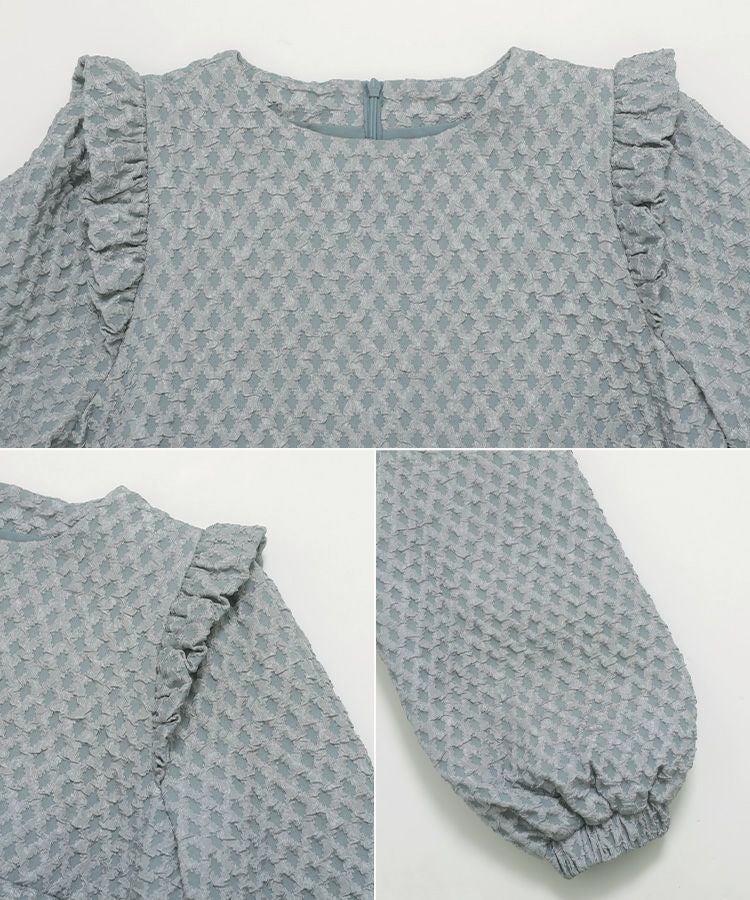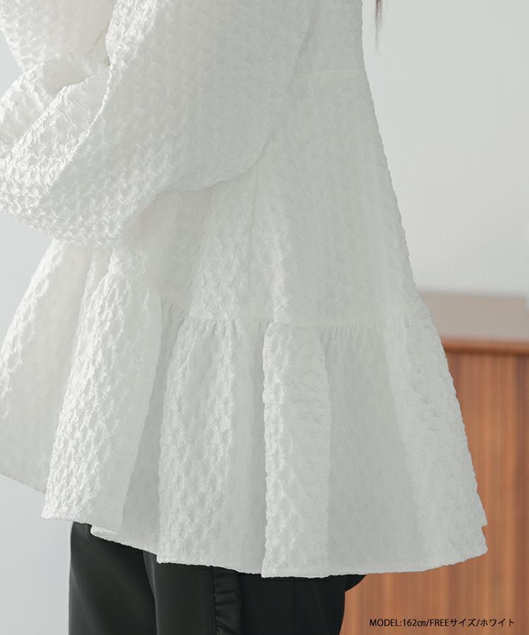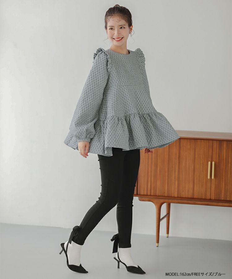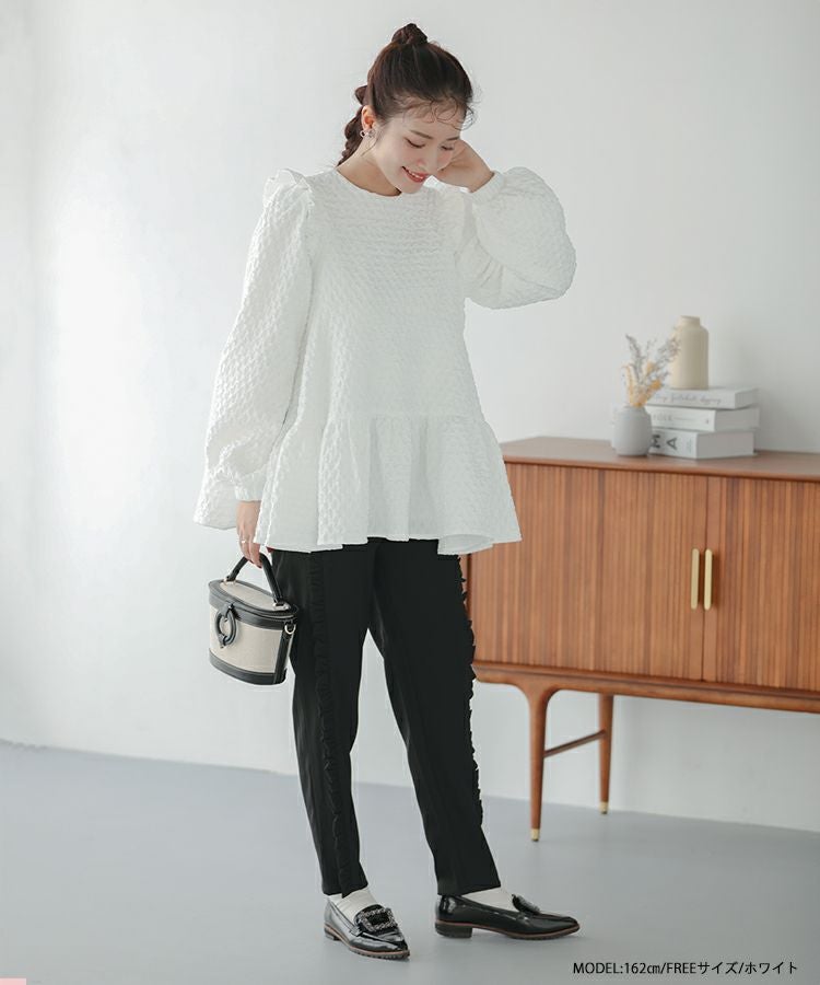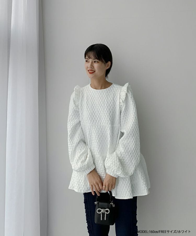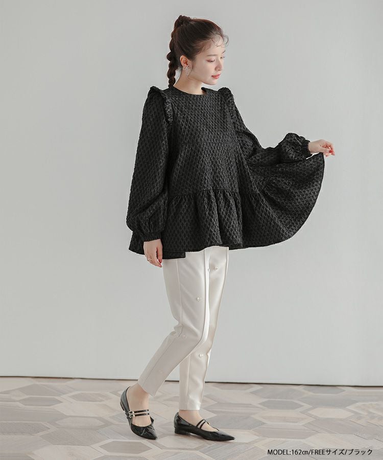 立体感のあるダイヤ柄のジャガード生地が高級感のあるトップス。