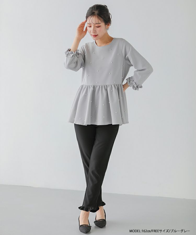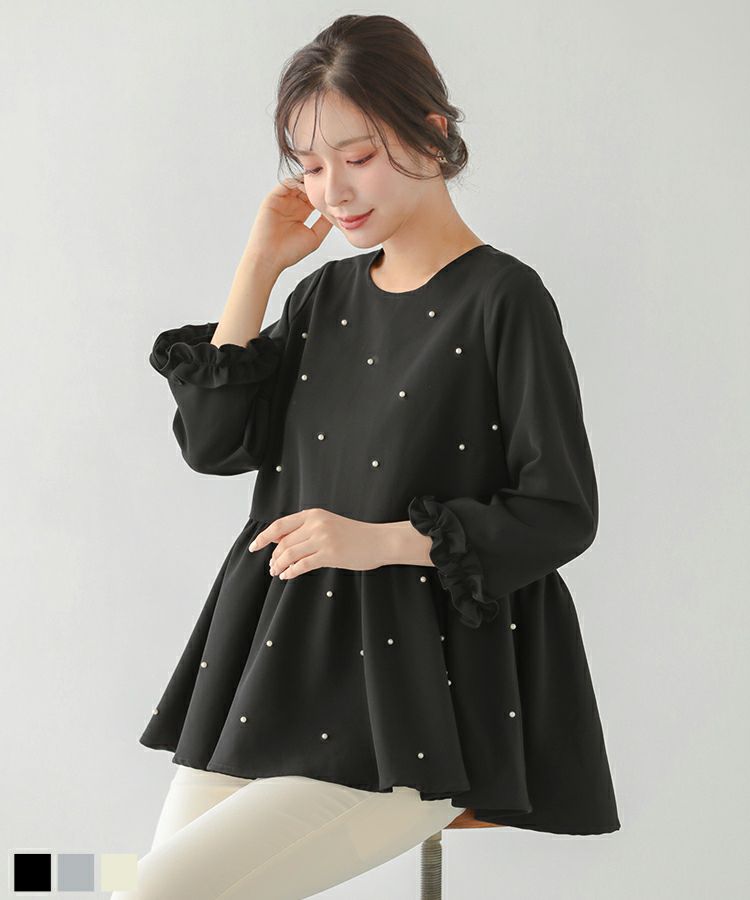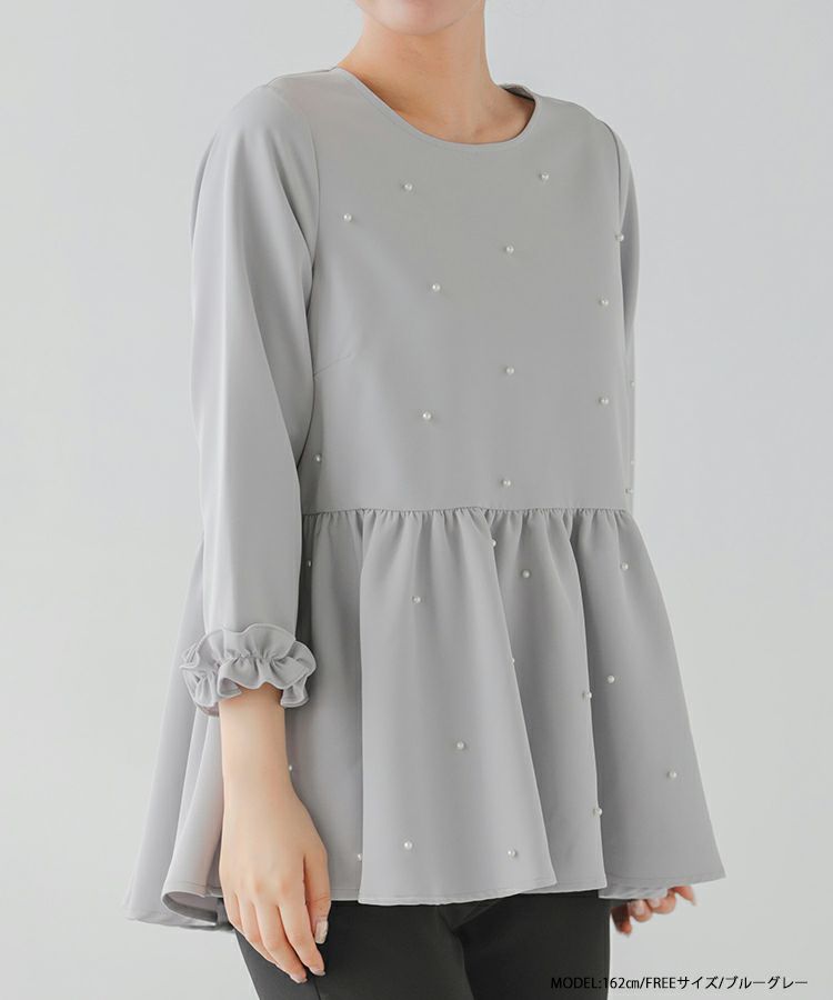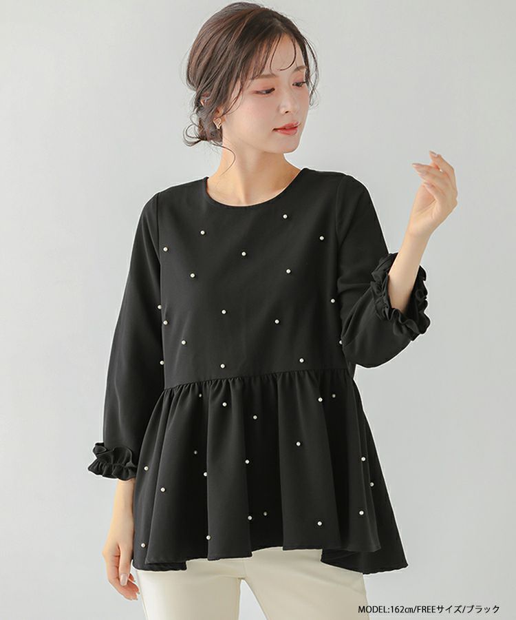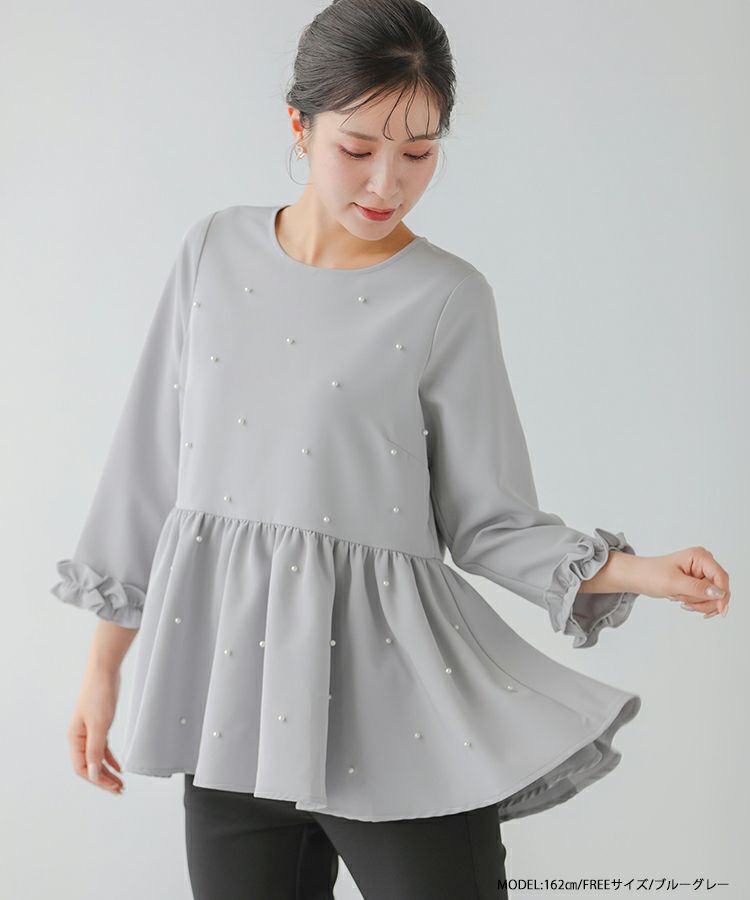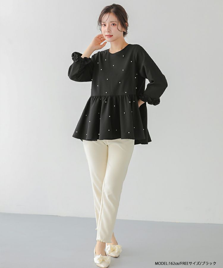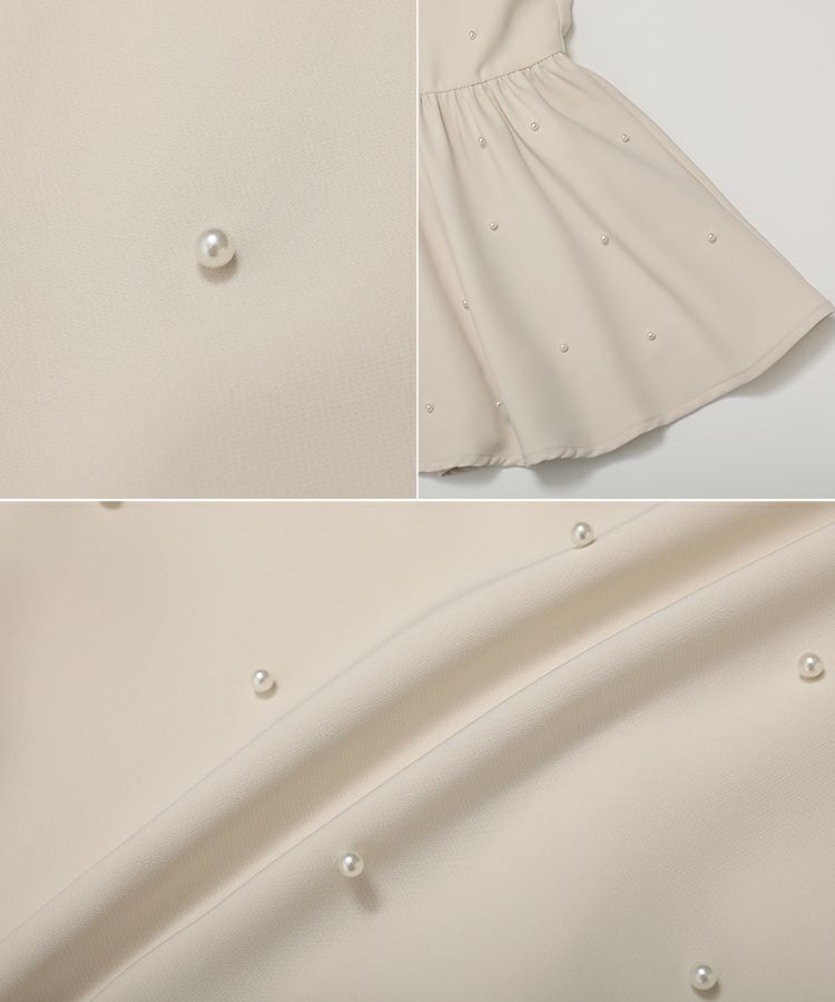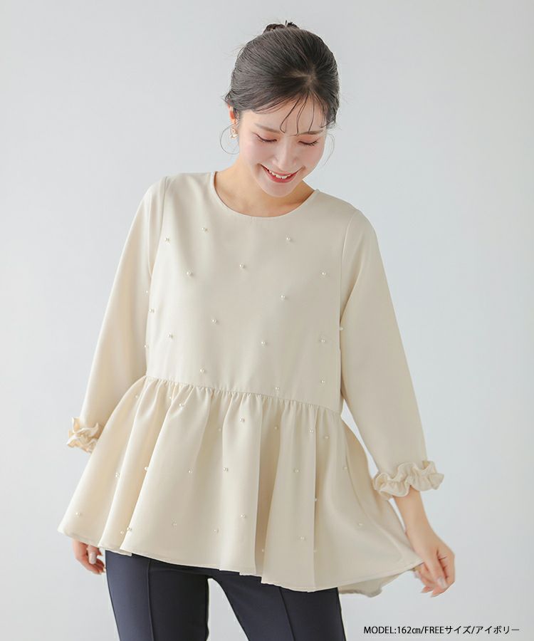 小ぶりのパールが前面に散りばめられたペプラムトップスで
