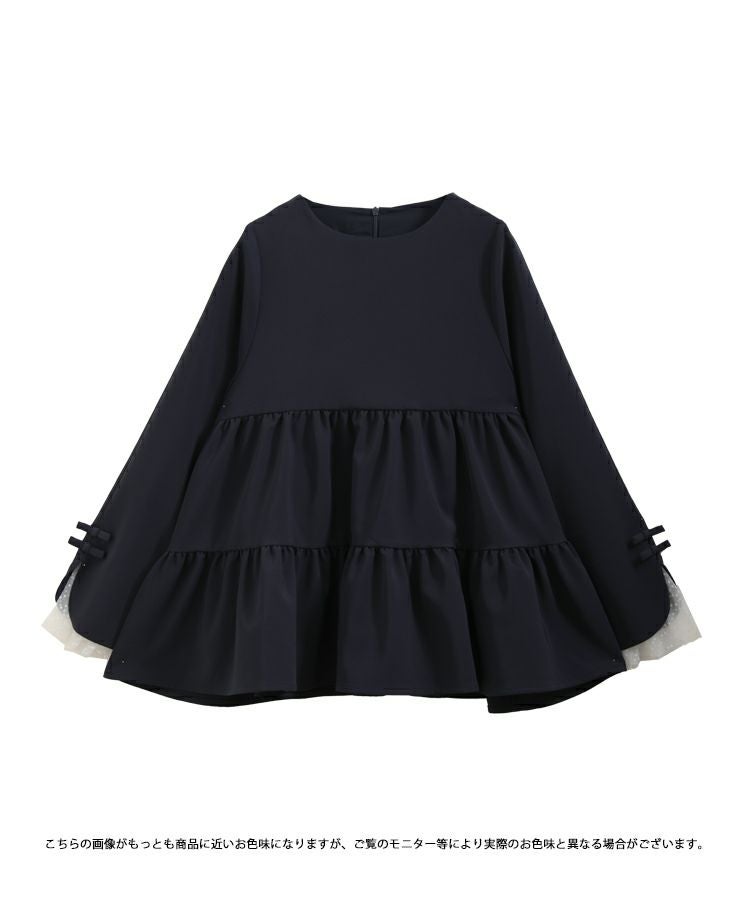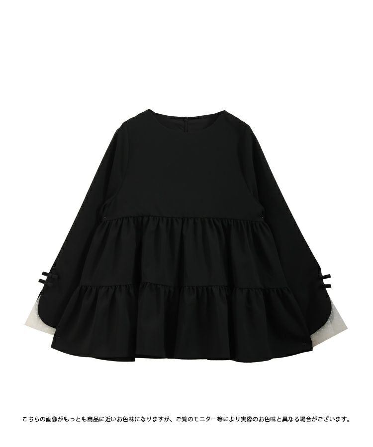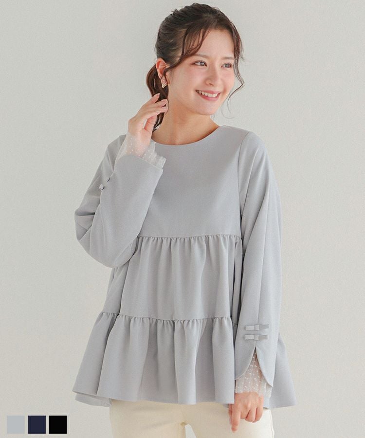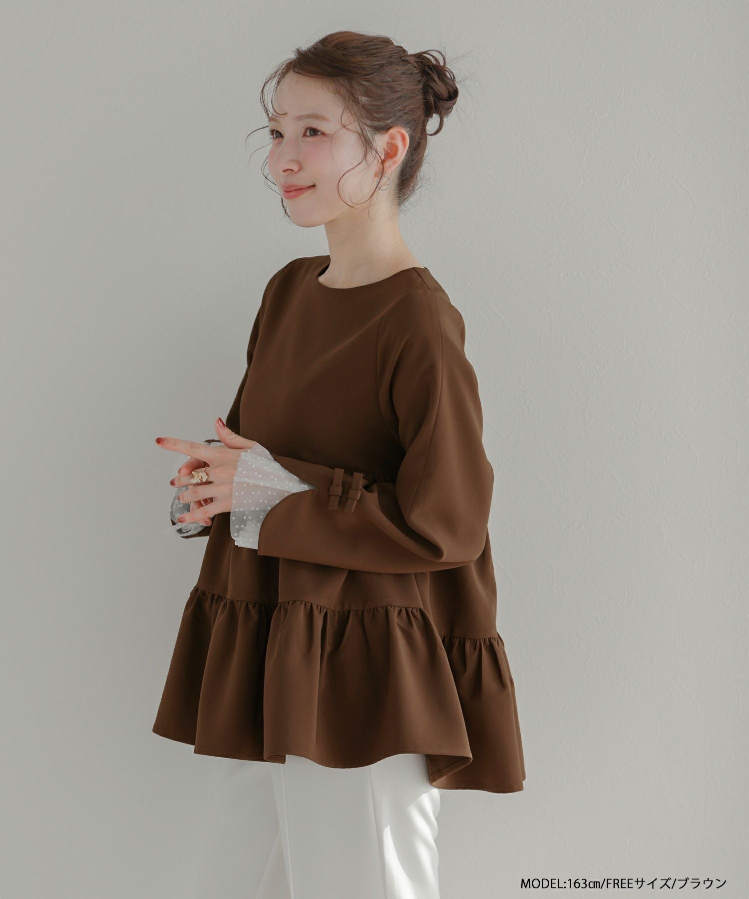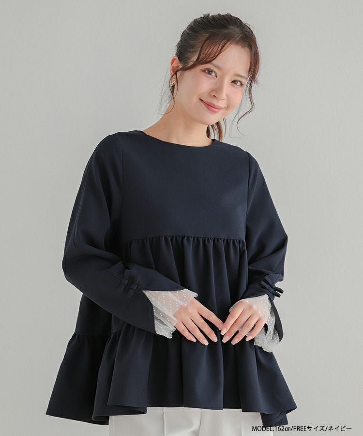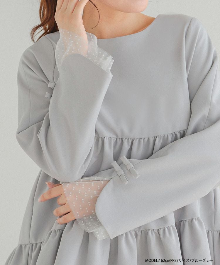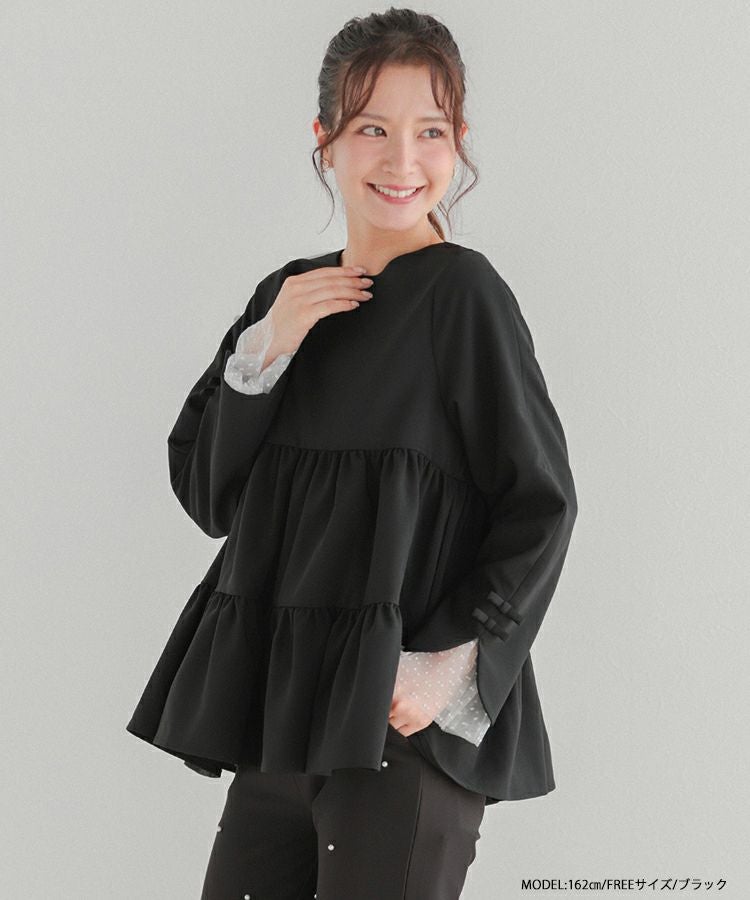 2024aw ドットチュール スリットスリーブ ティアード 袖リボンドットチュールティアードトップス【宅配便】