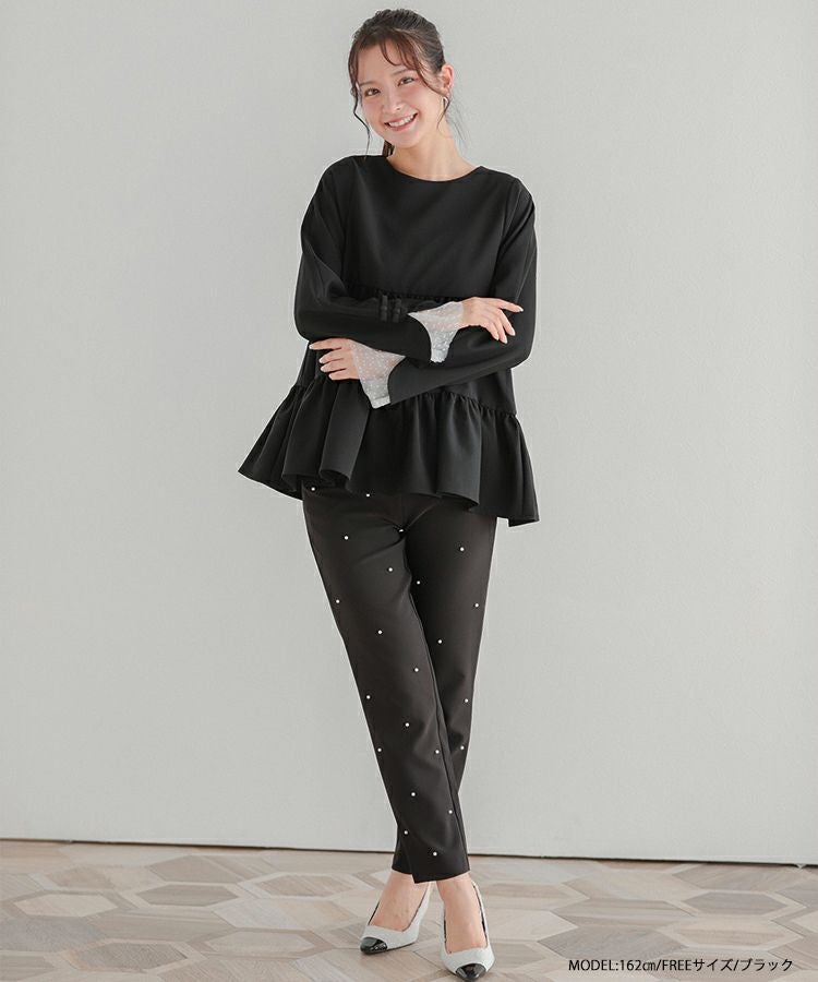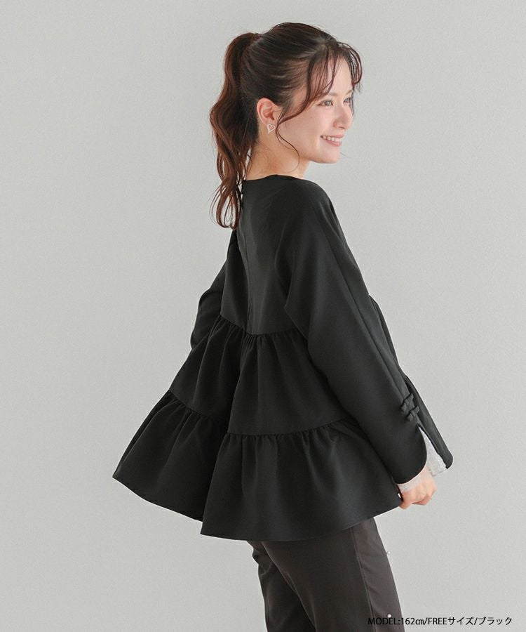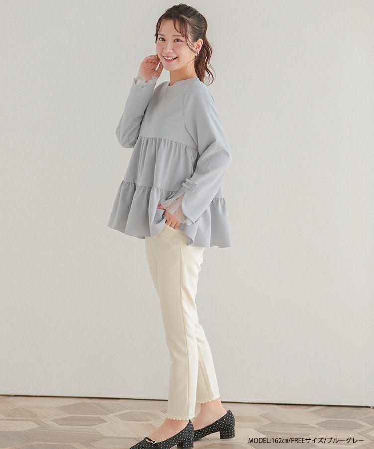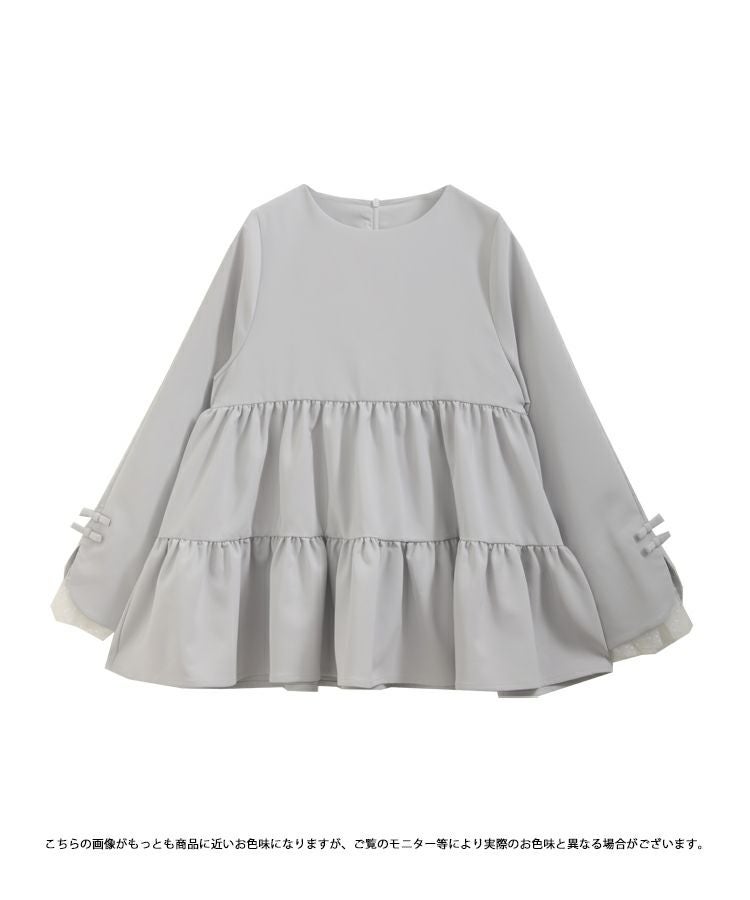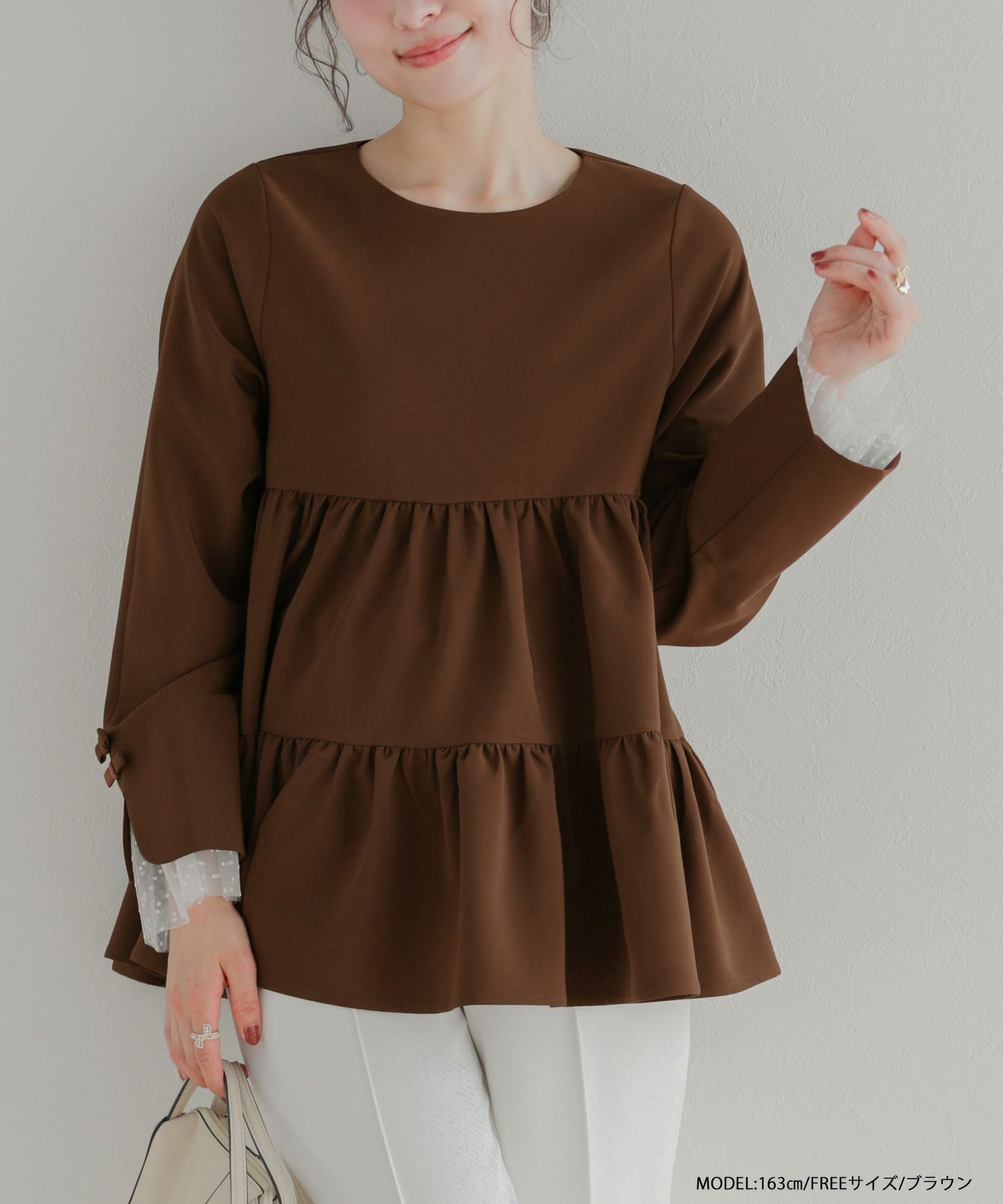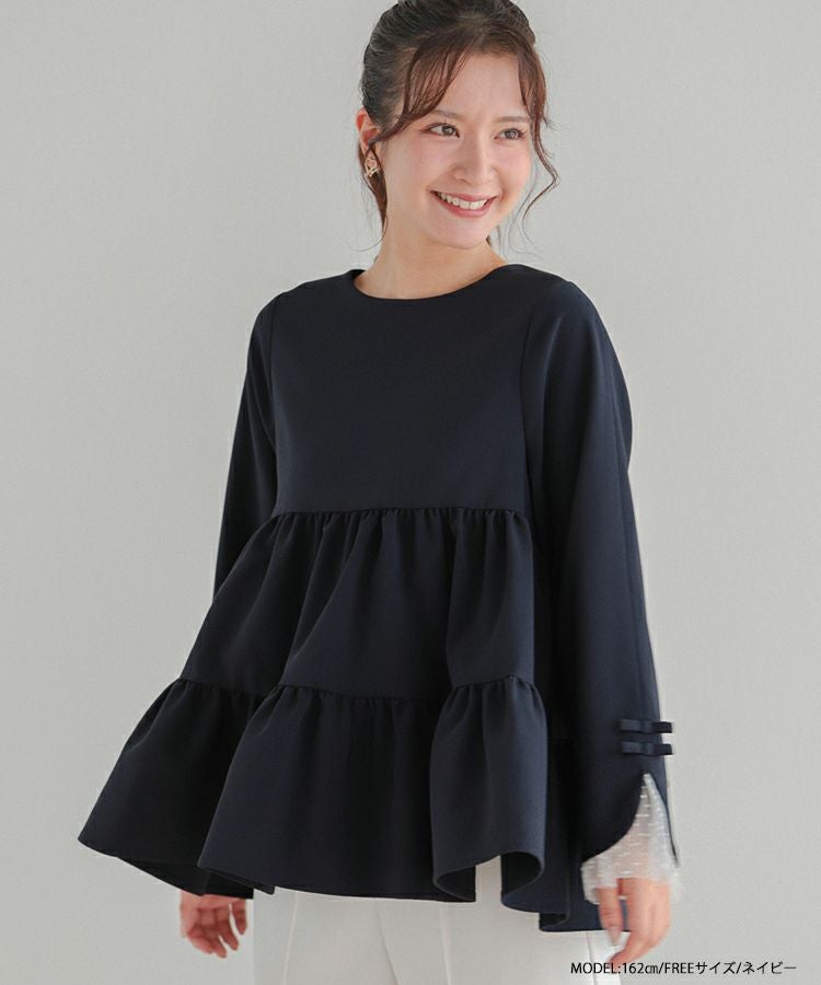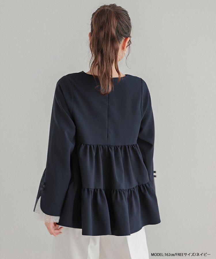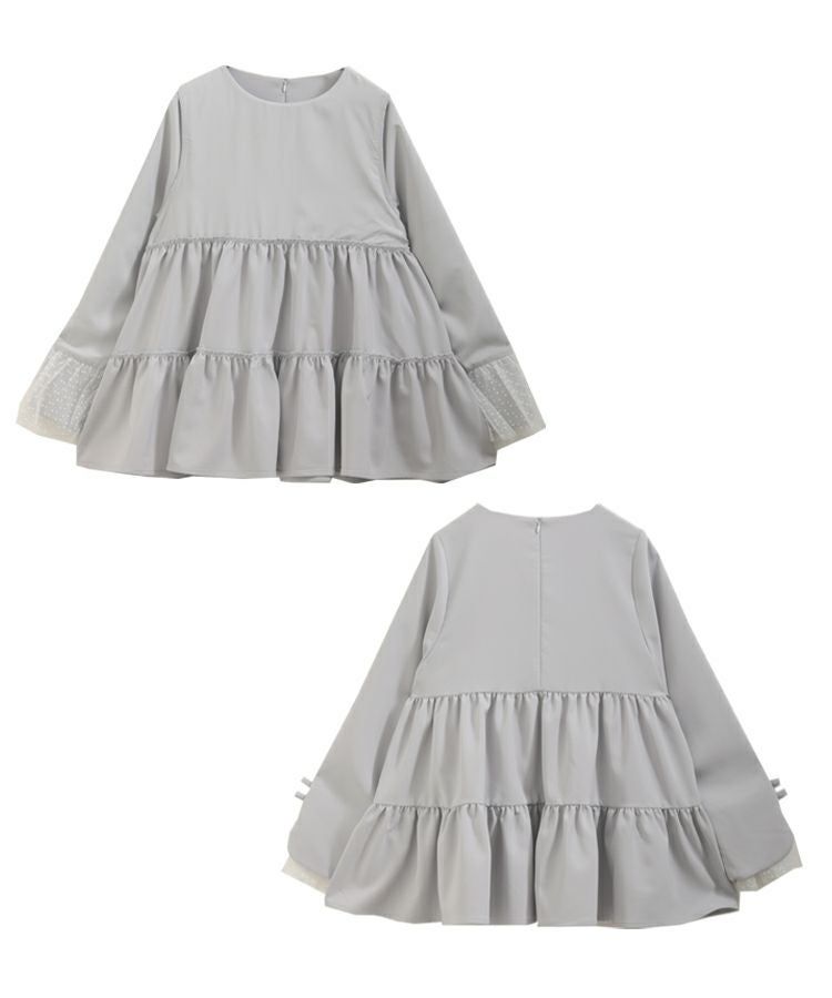 2024aw ドットチュール スリットスリーブ ティアード 袖リボンドットチュールティアードトップス【宅配便】