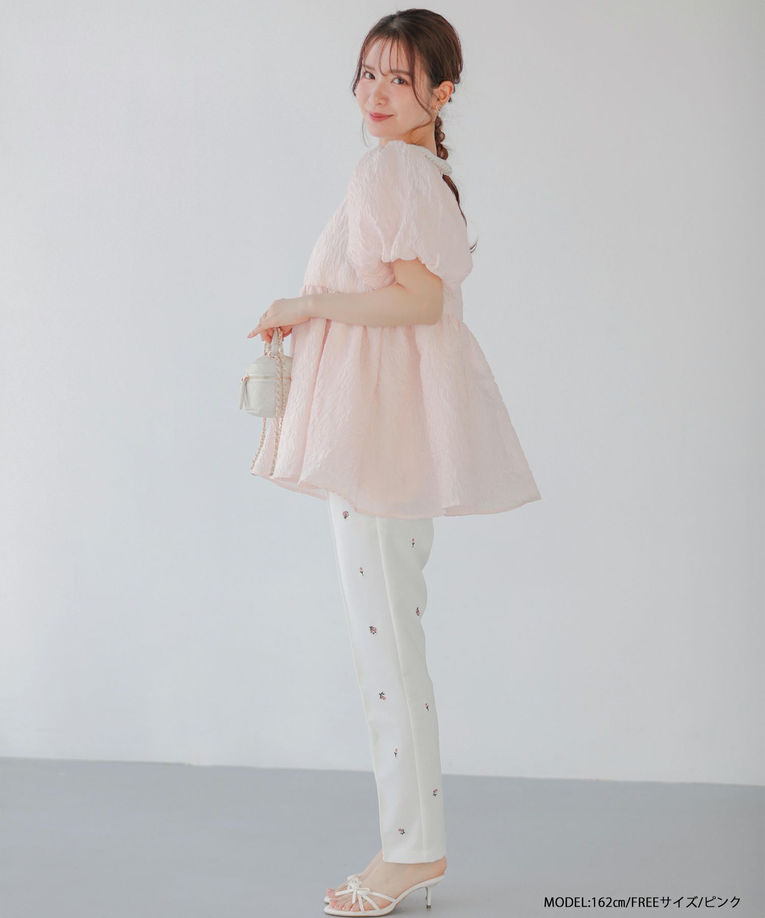 2025ss ジャガード 襟 パール ラウンドカラーペプラム パール襟ジャガードペプラムトップス【宅配便】