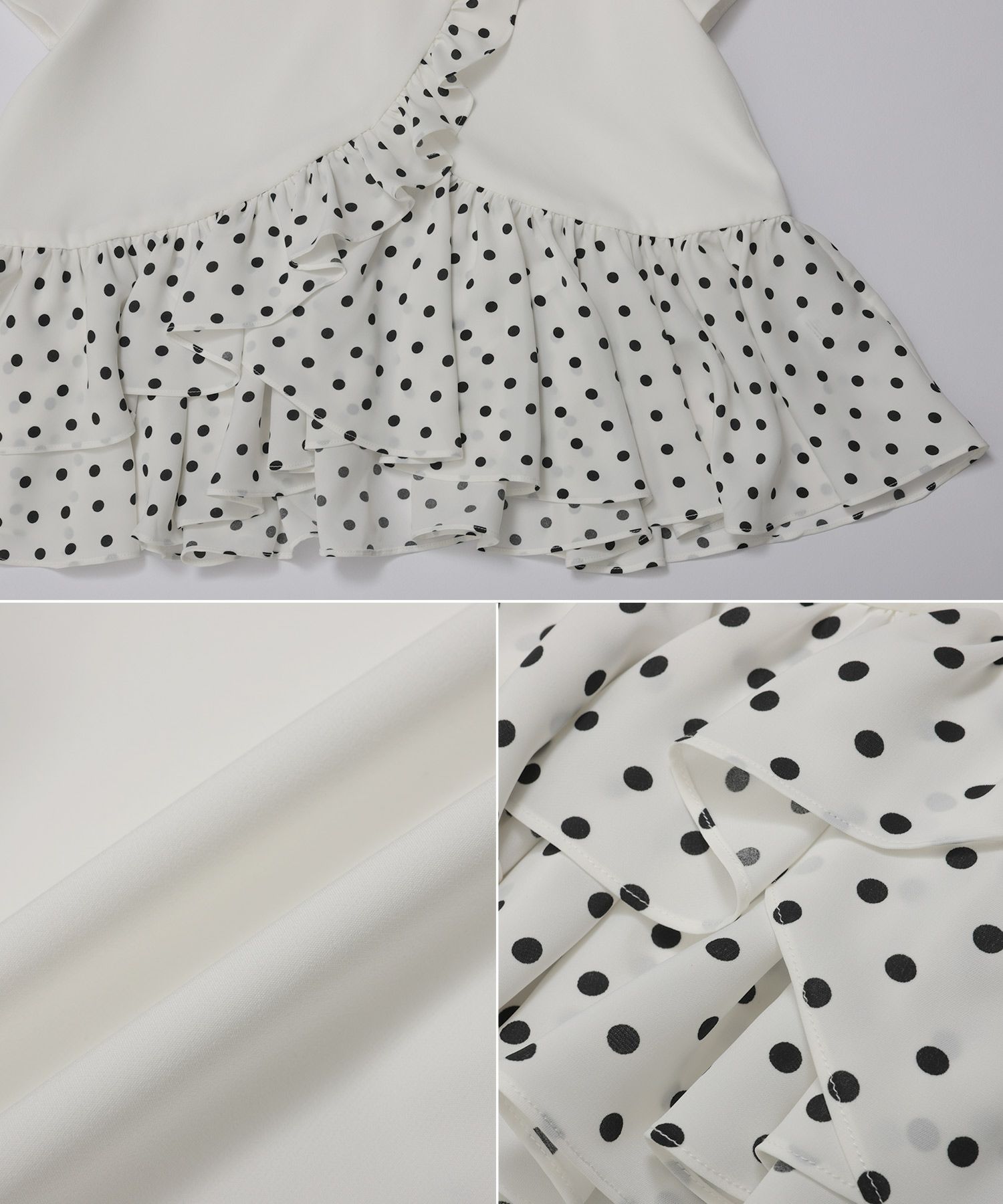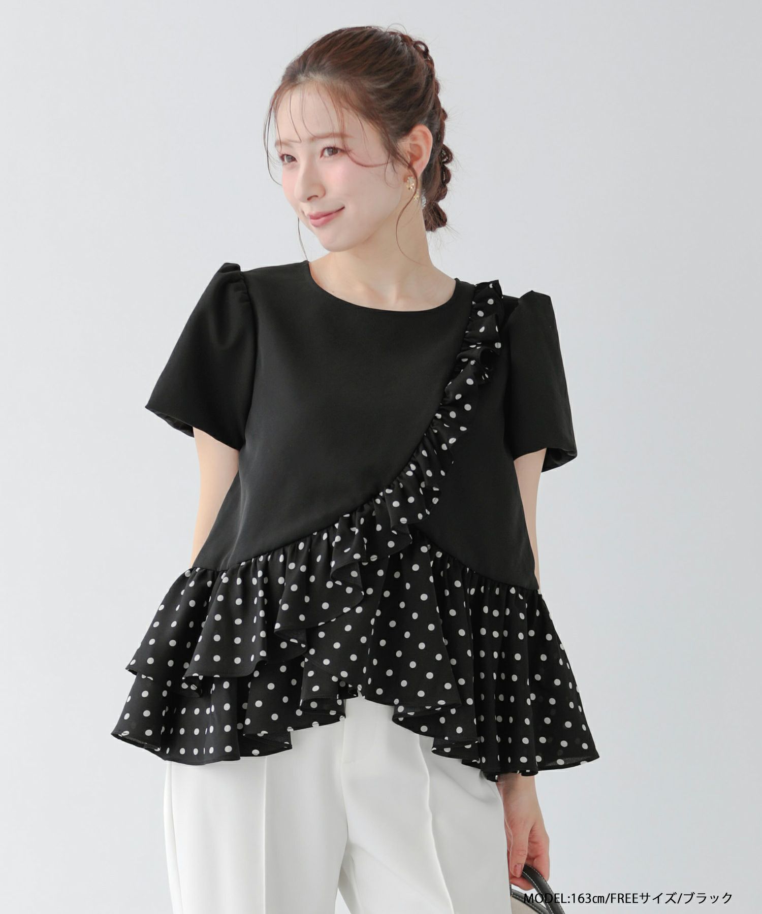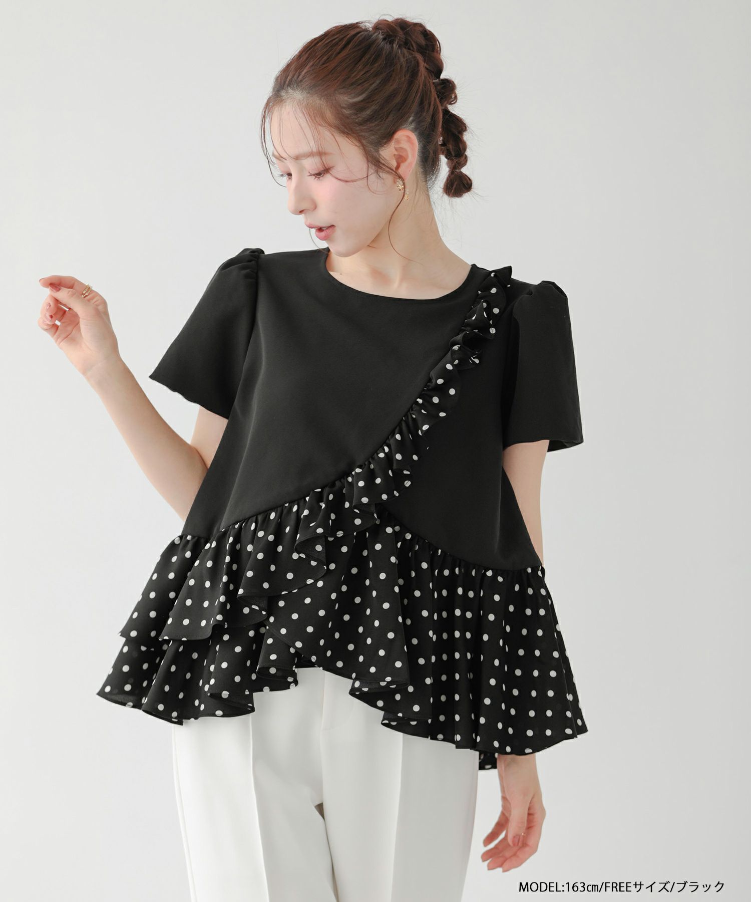 2025ss 水玉 ドット ペプラム 半袖 フリル ギャザー ドットカーブフリルトップス【宅配便】