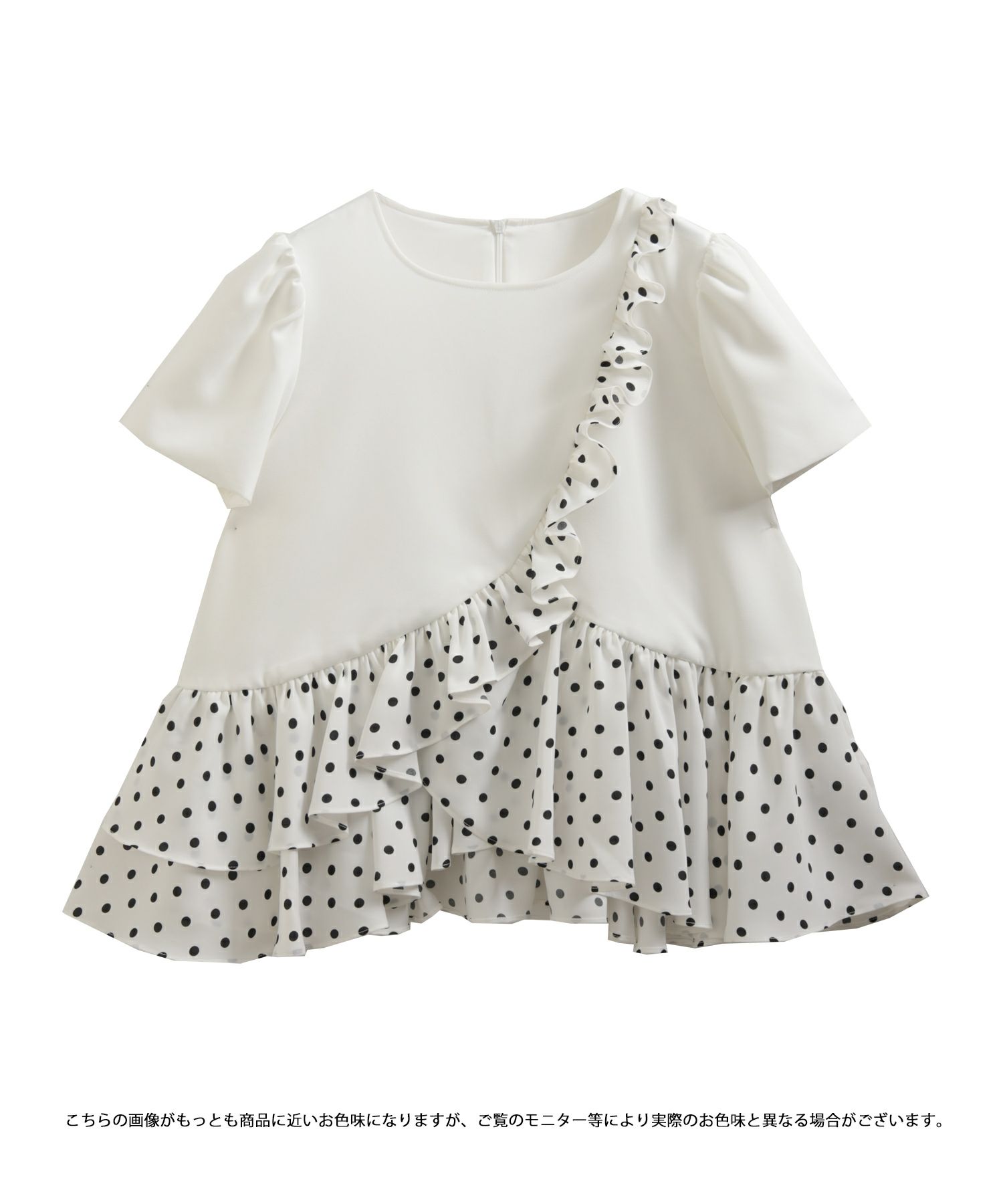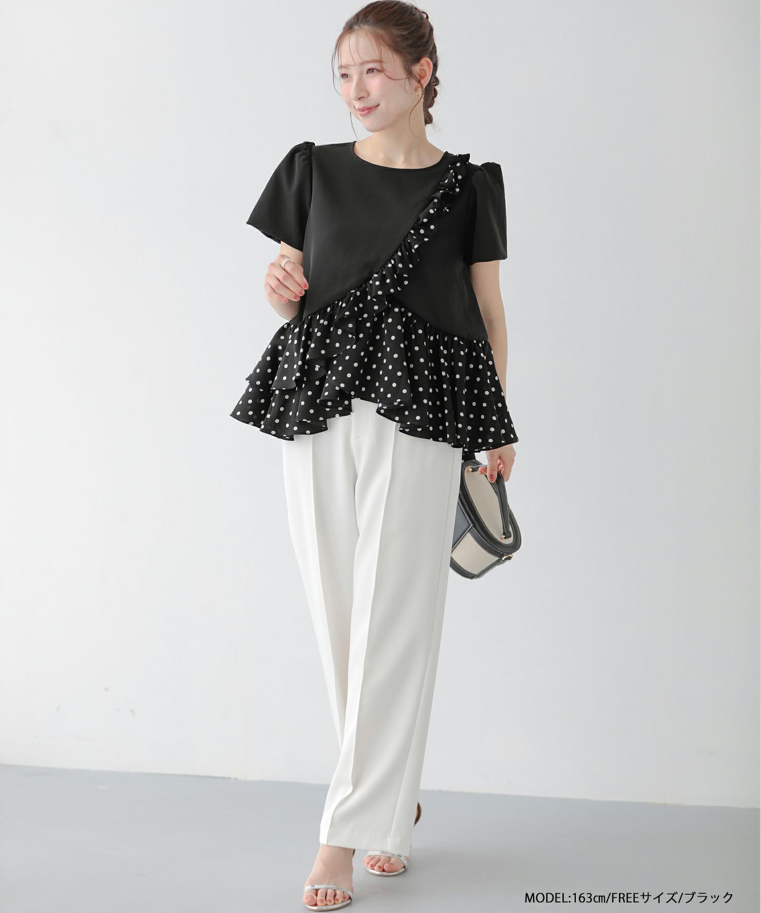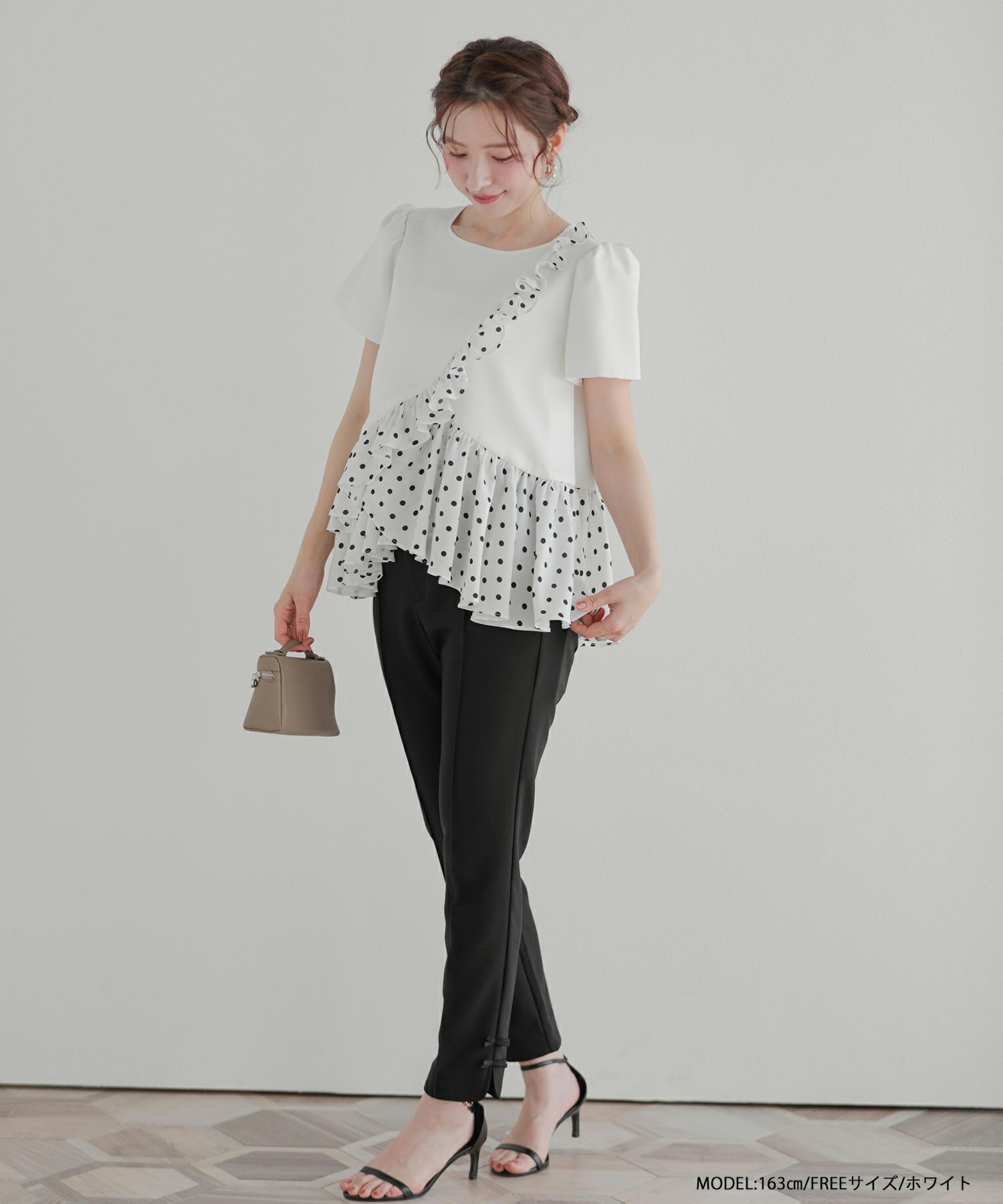 2025ss 水玉 ドット ペプラム 半袖 フリル ギャザー ドットカーブフリルトップス【宅配便】