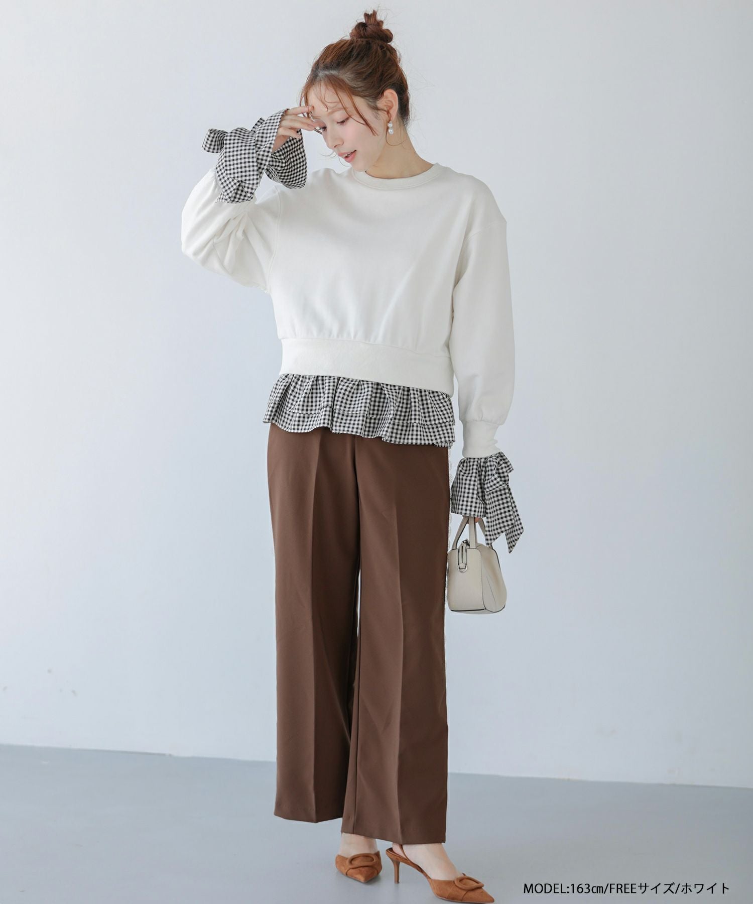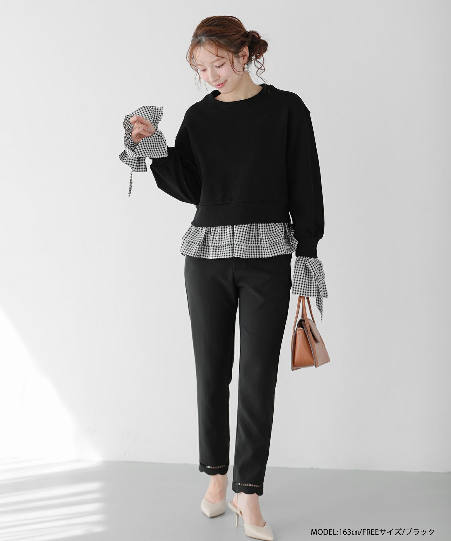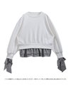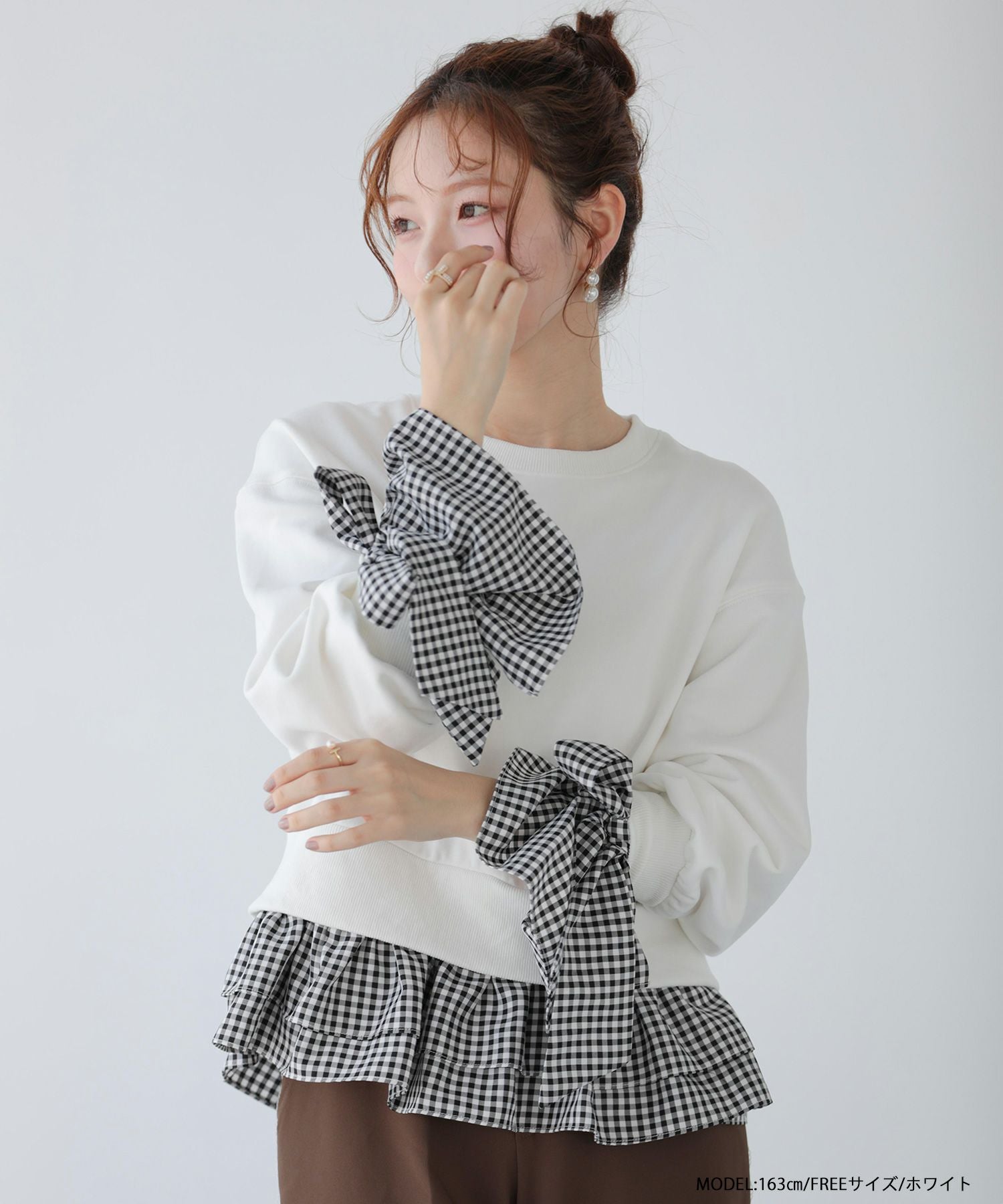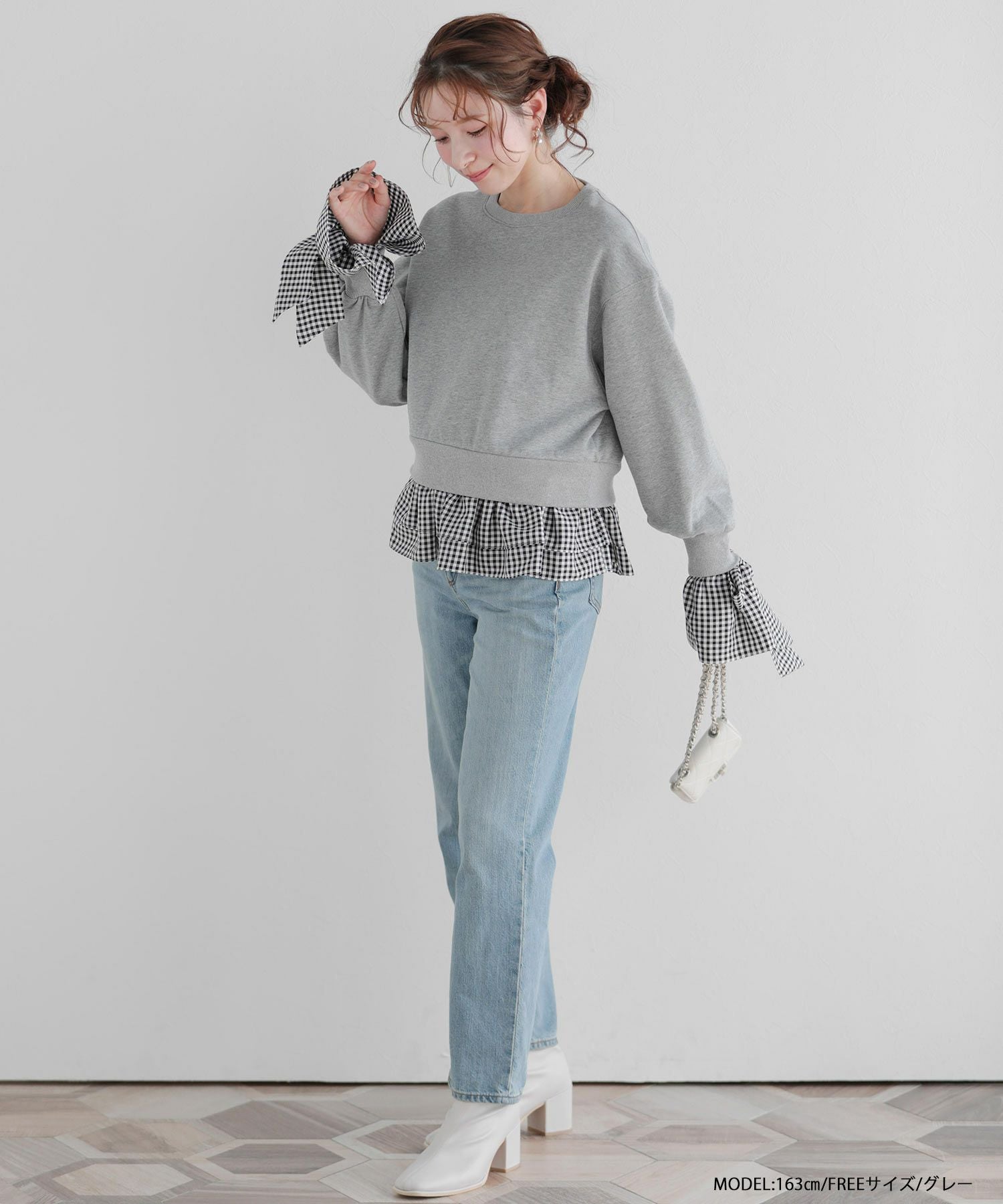 2025aw ギンガムチェック リボン フリル スウェット ギンガムリボンカフススウェットトップス【宅配便】