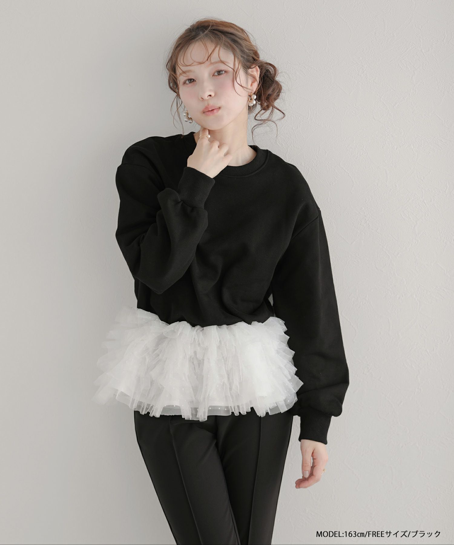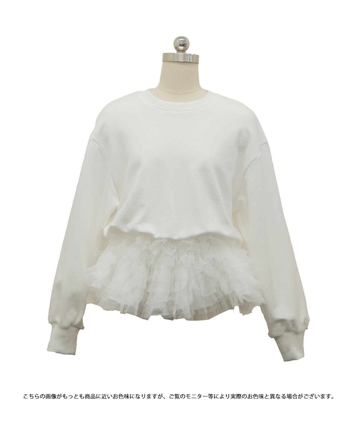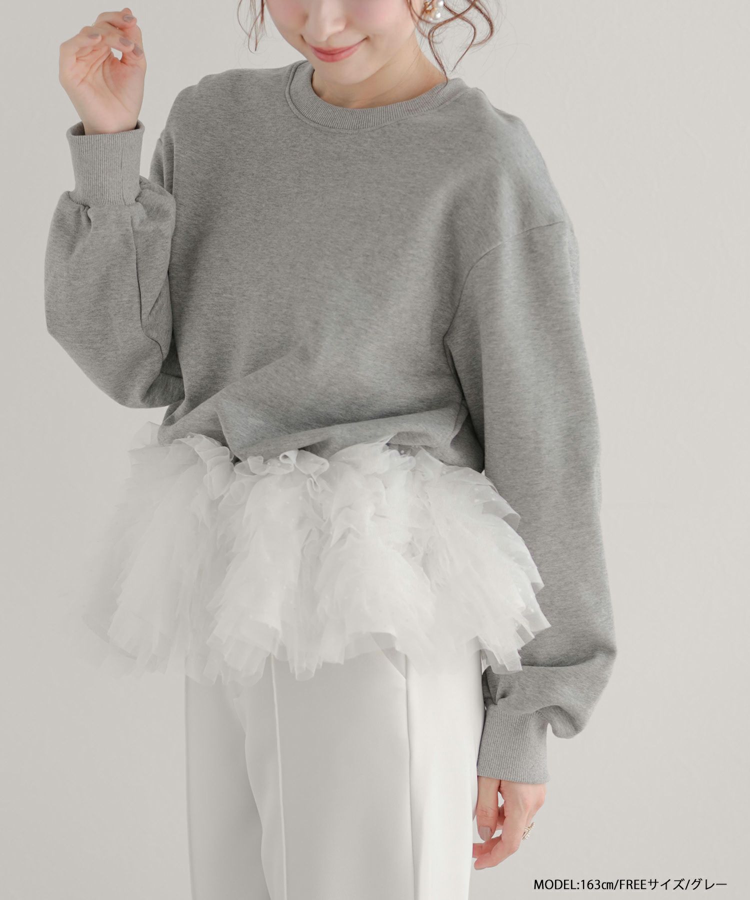 ラフに着られるスウェット素材に、ドット×無地チュールの甘さを重ねた大人可愛いデザインです。