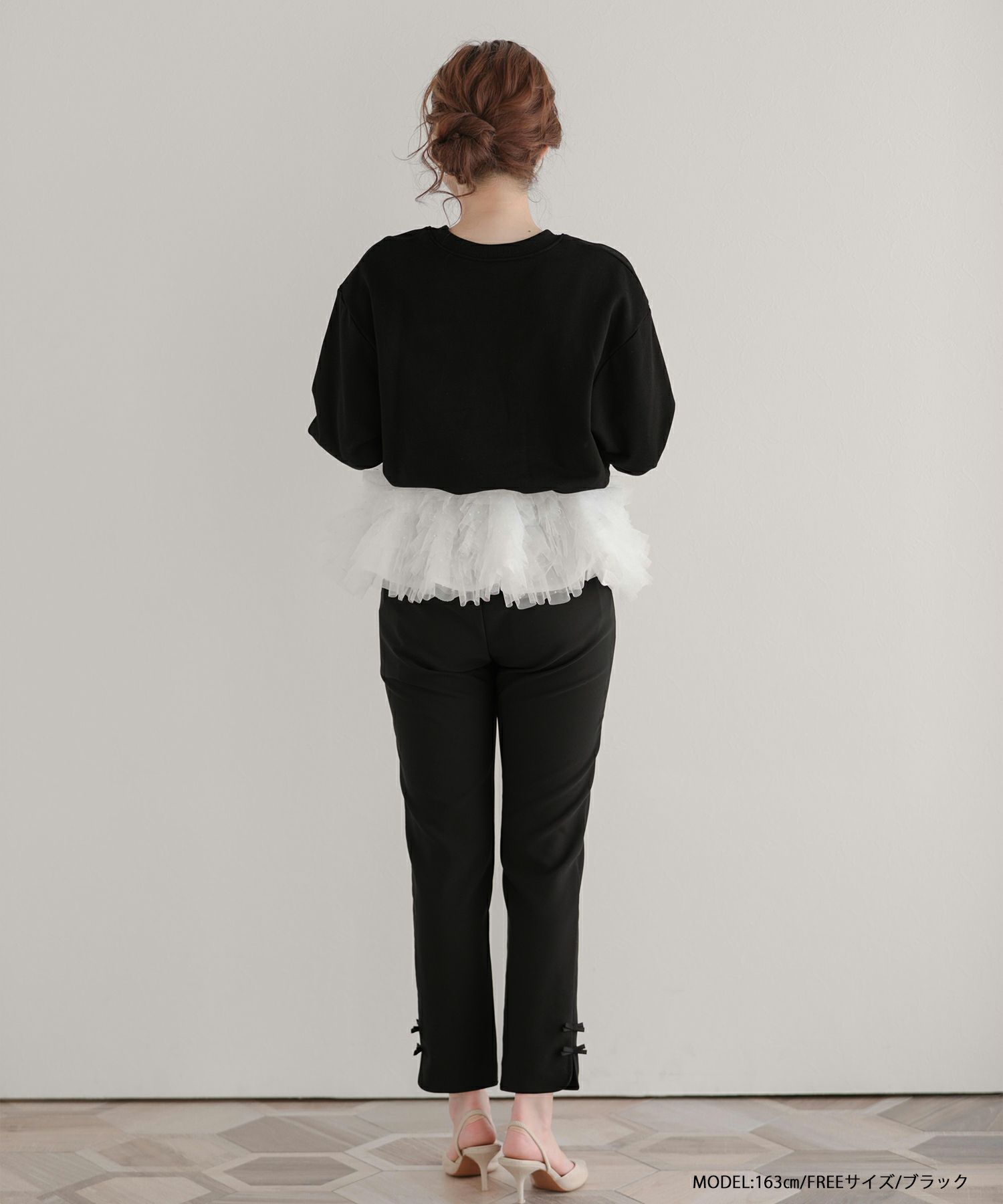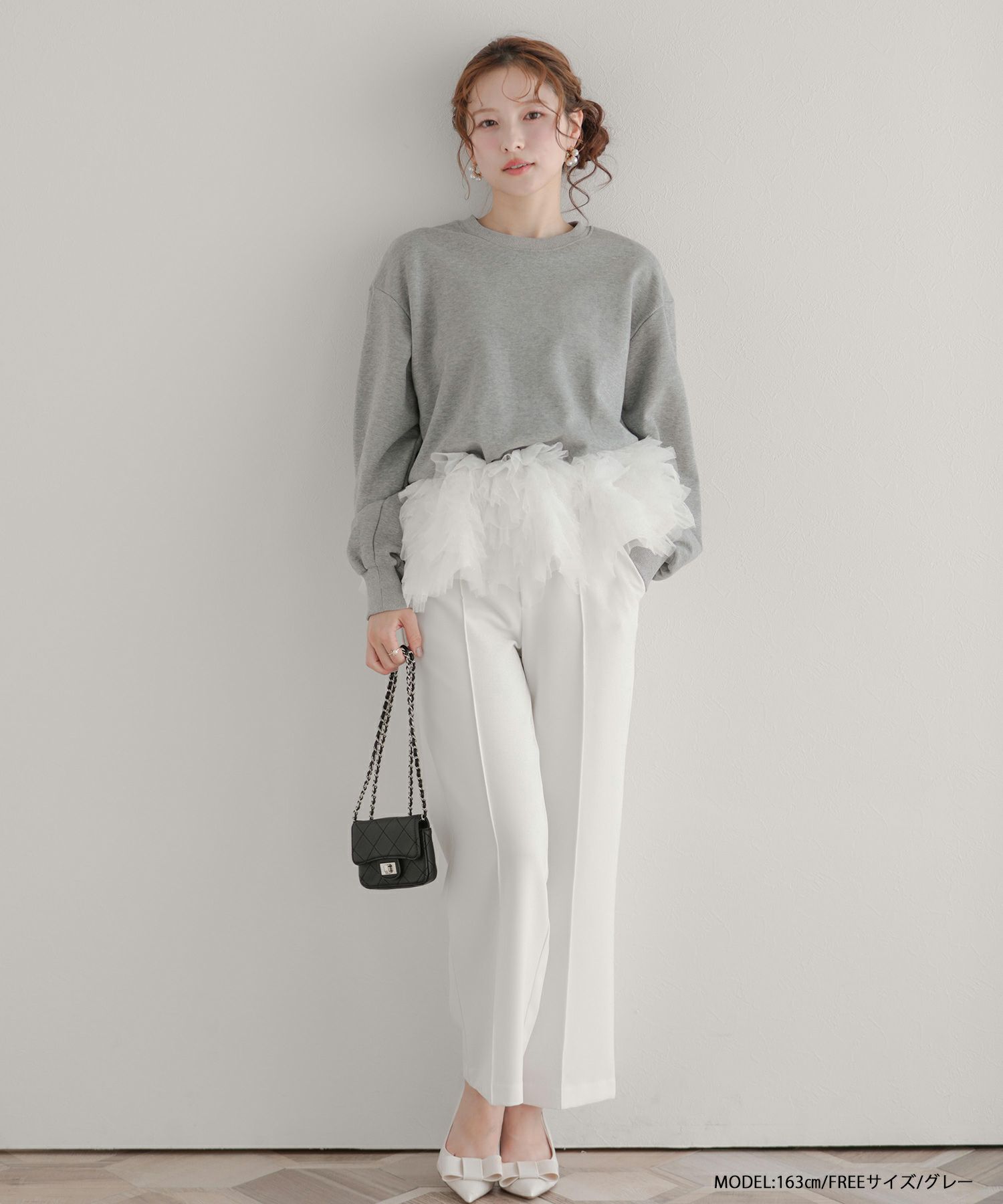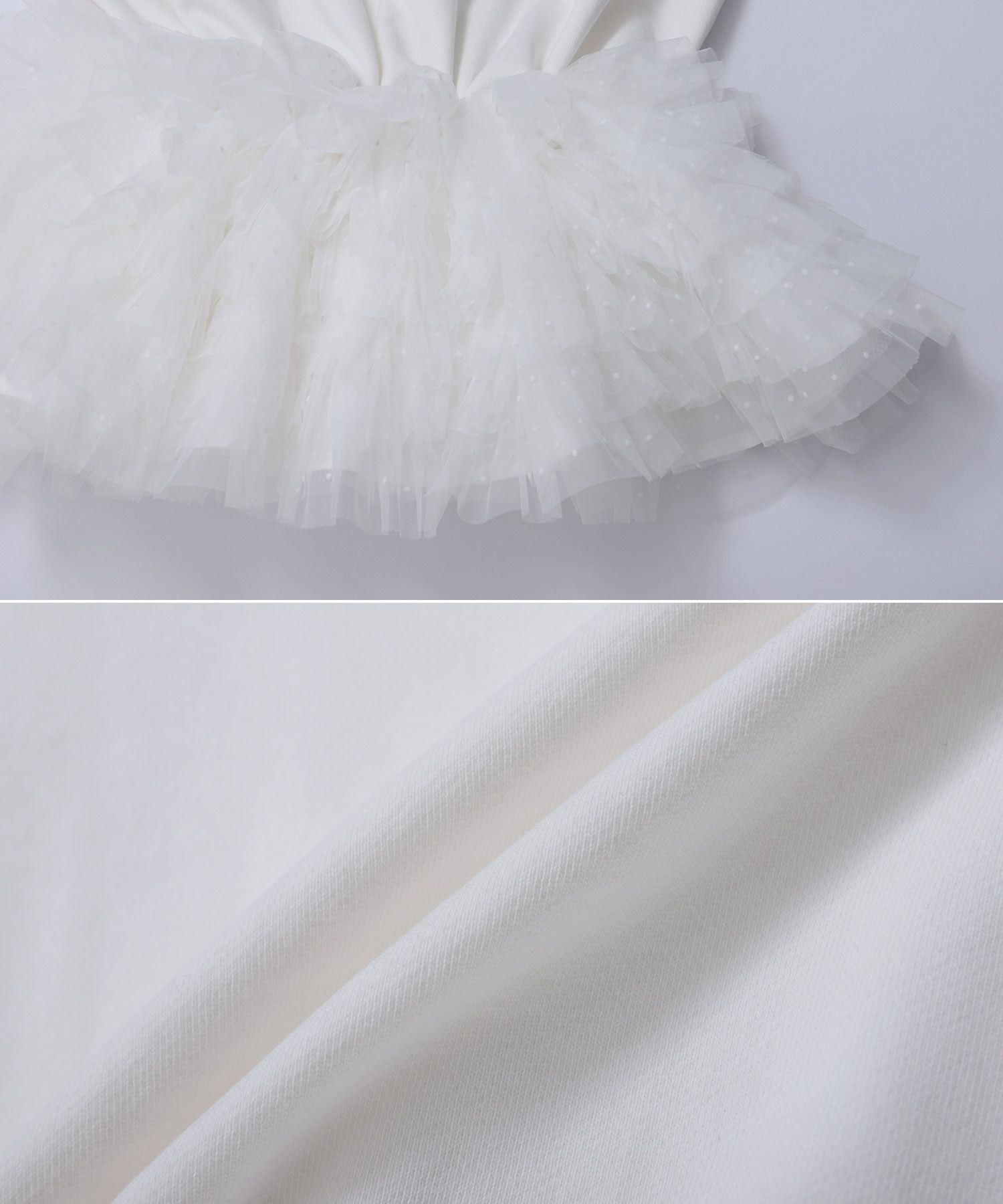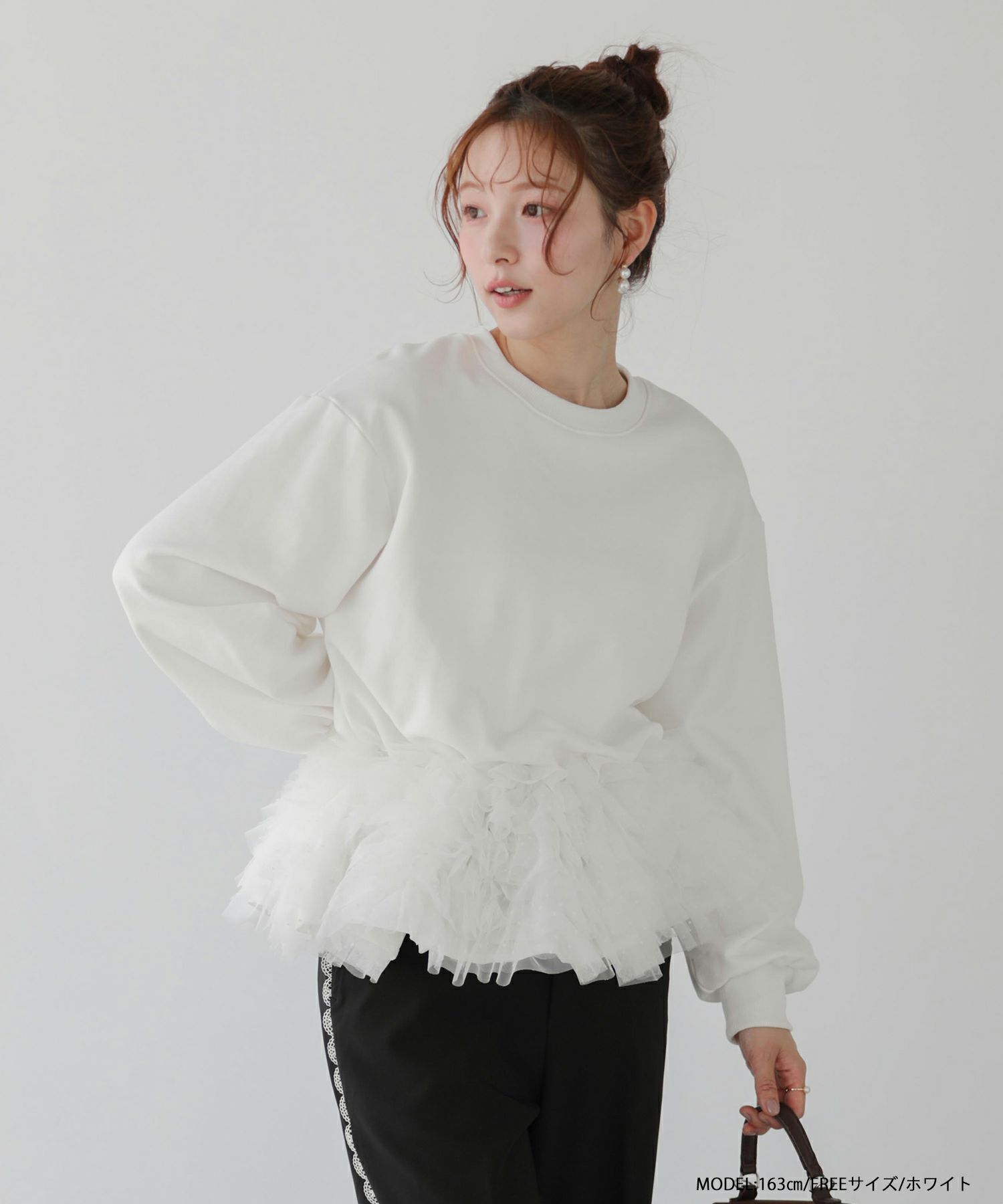 ラフに着られるスウェット素材に、ドット×無地チュールの甘さを重ねた大人可愛いデザインです。