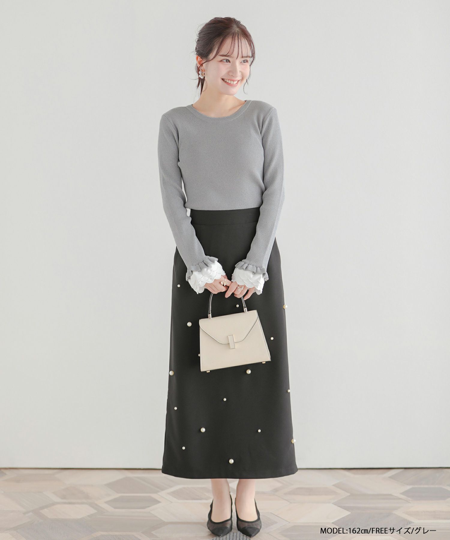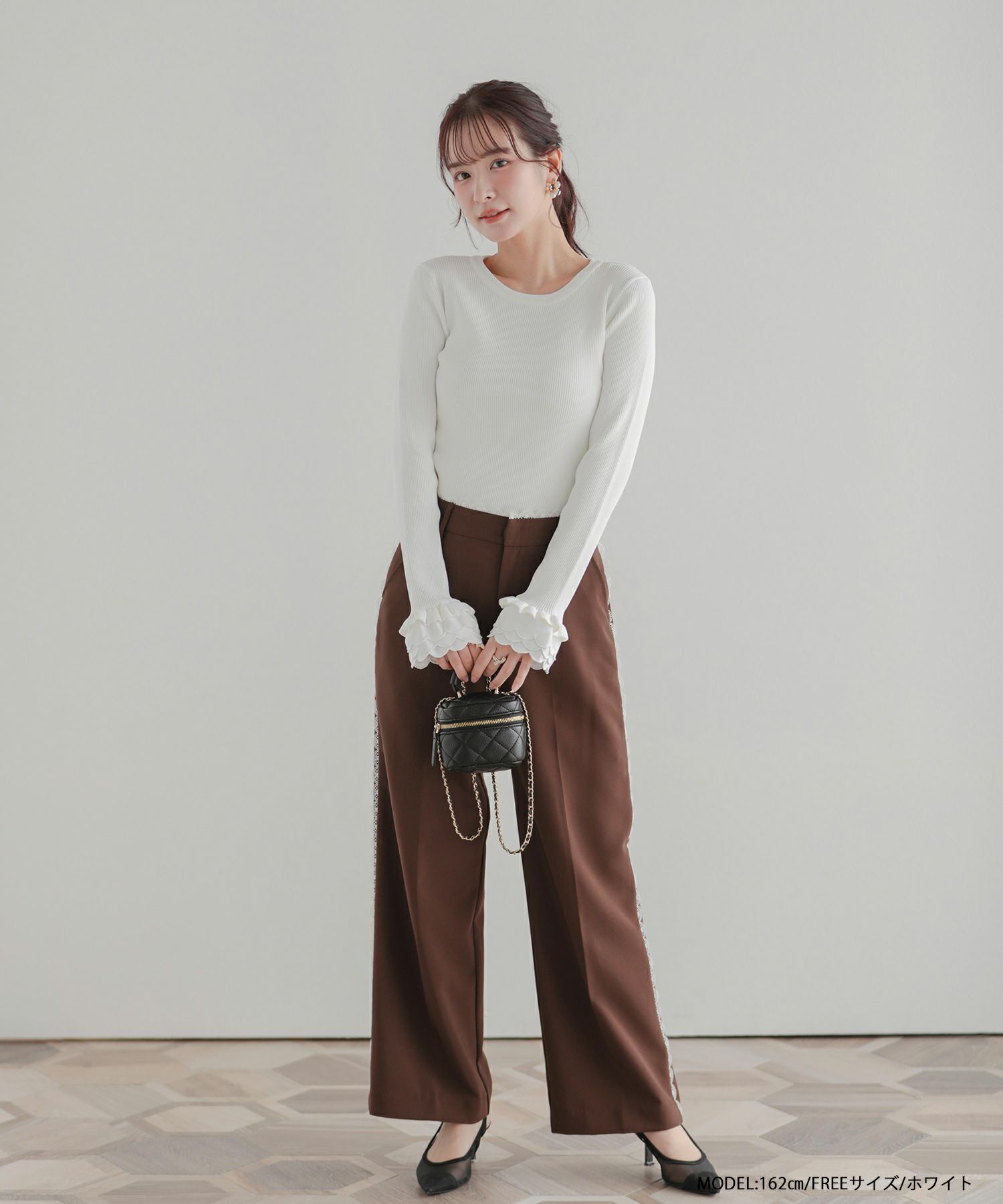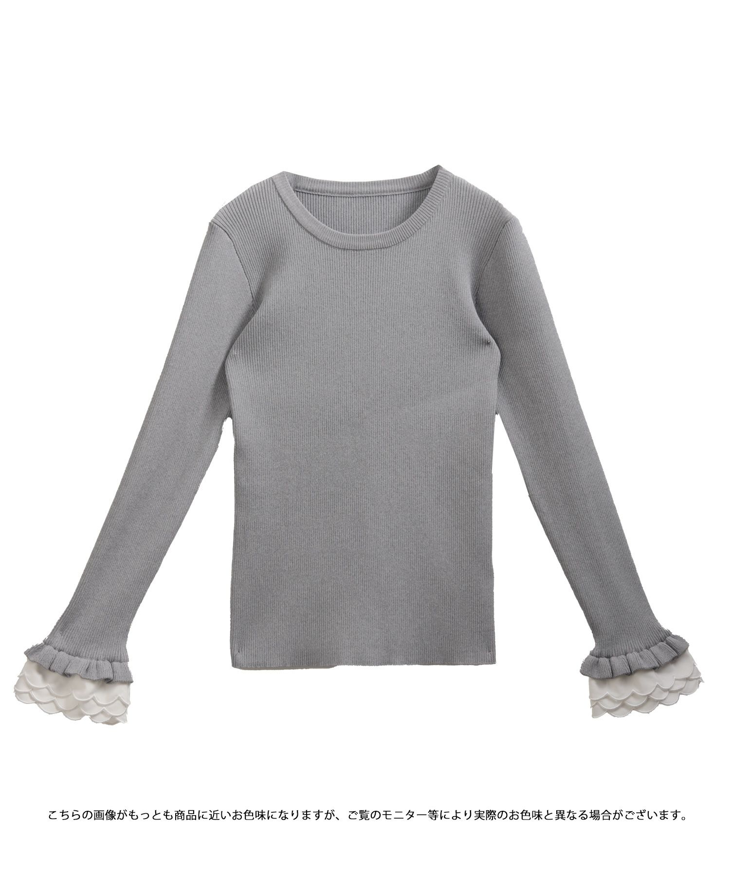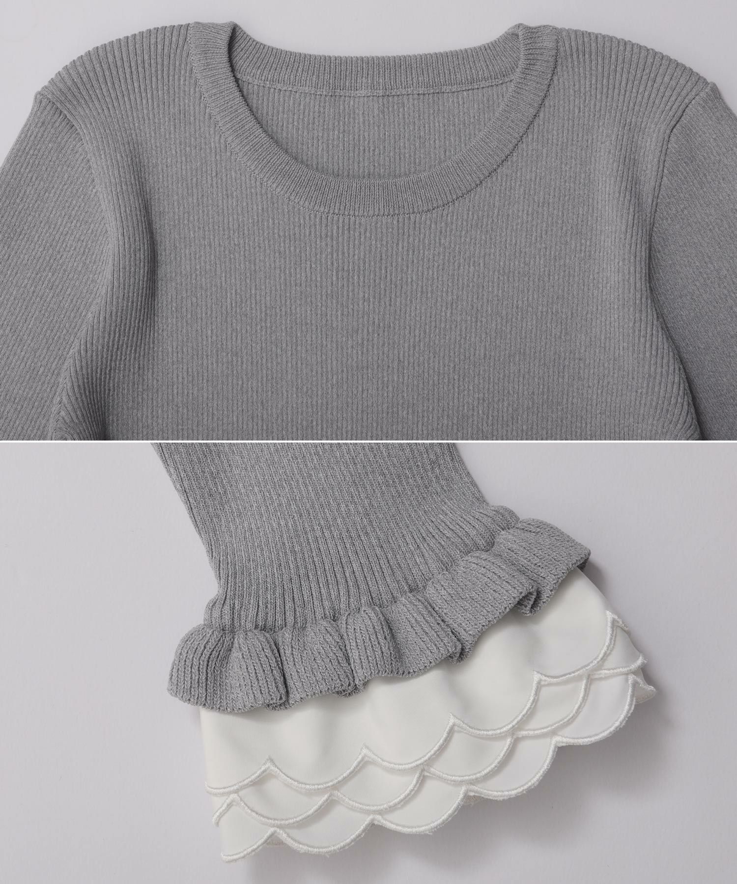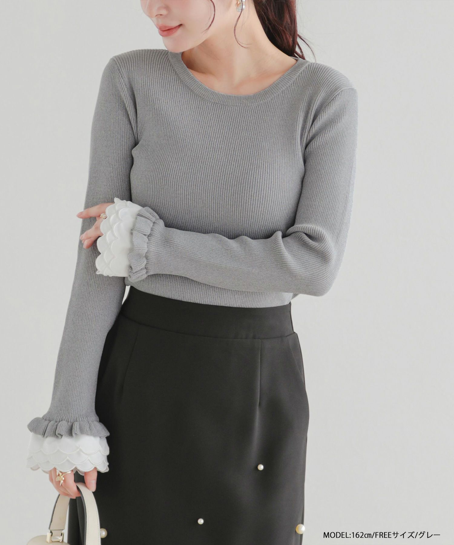 袖口のスカラップフリルが手元に華やかさを添えるリブニットトップス。