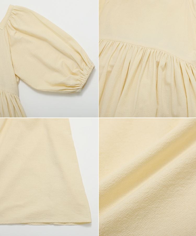 胸下にギャザーで切り替えしをつけ、すらっとスタイルアップ。