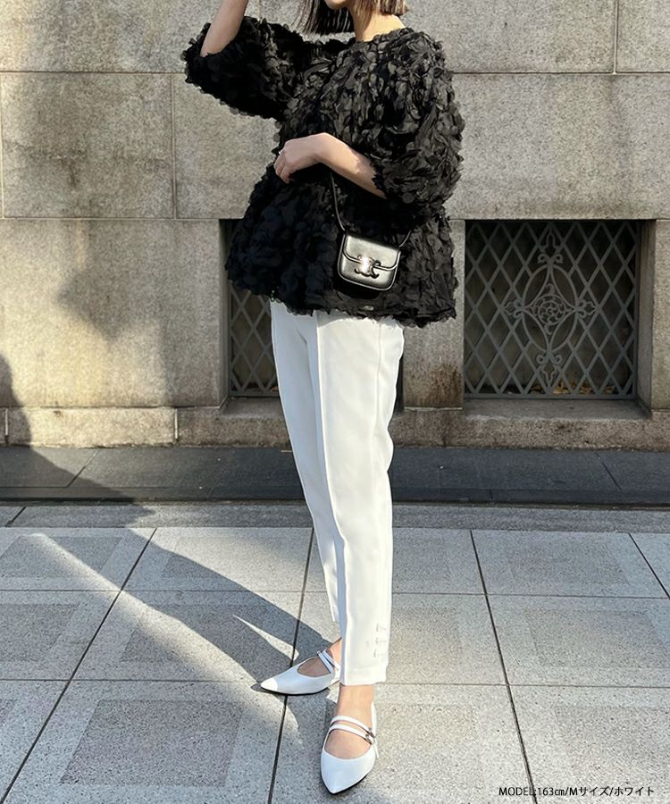 足首が見える少し短めの丈に仕上げて抜け感を演出。