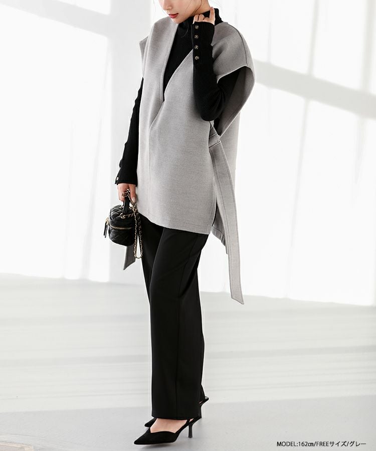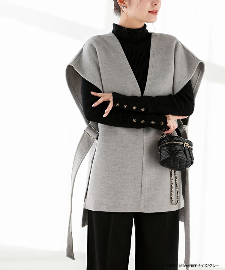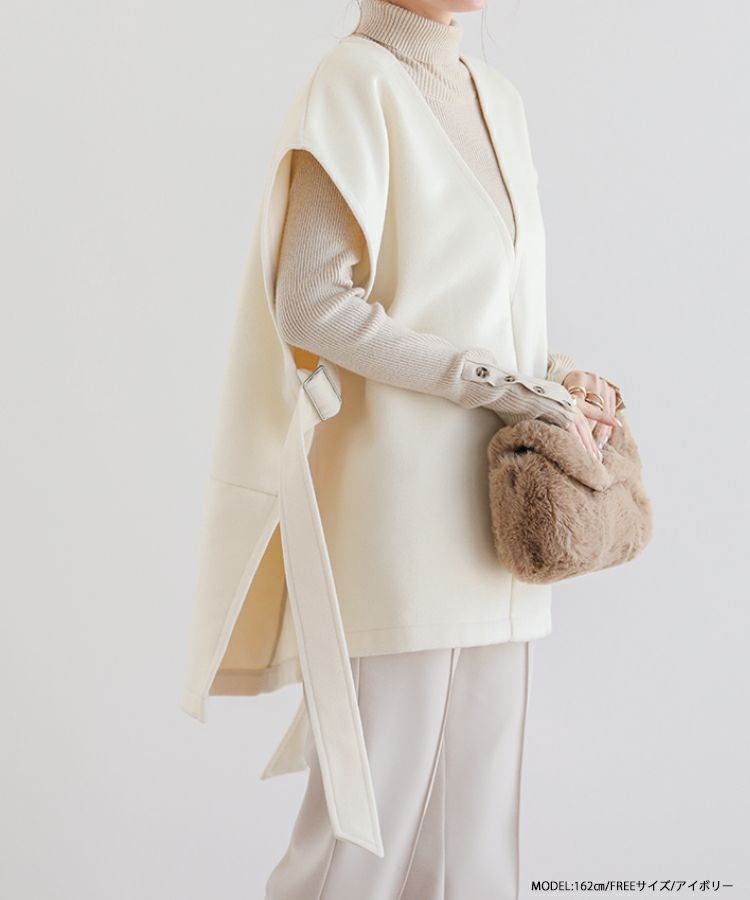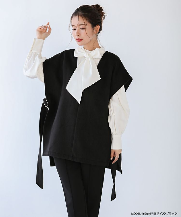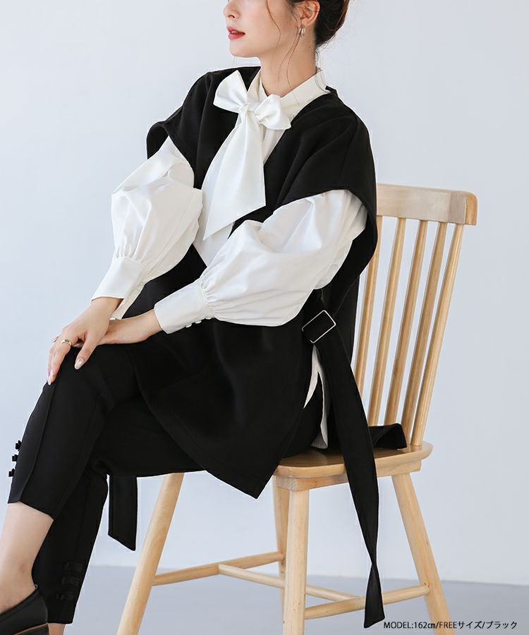2022秋 2022aw  秋新作 ベスト レイヤード ジレ ノーカラー サイドアジャスター サイドリボン サイドベルトウールライクベスト【宅配便】
