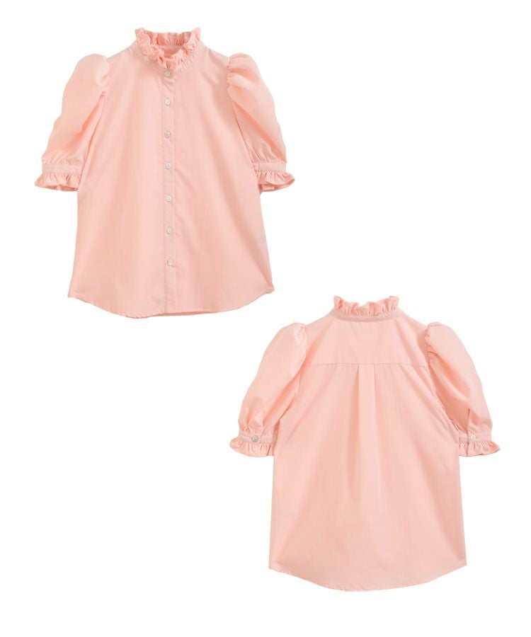 首元と袖口にフリルをあしらいフェミニンなブラウスに仕上げました。