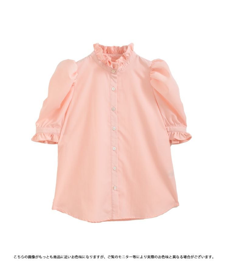 ボリューム感たっぷりパワショルとスタンドカラーのフリルが可愛いブラウス。