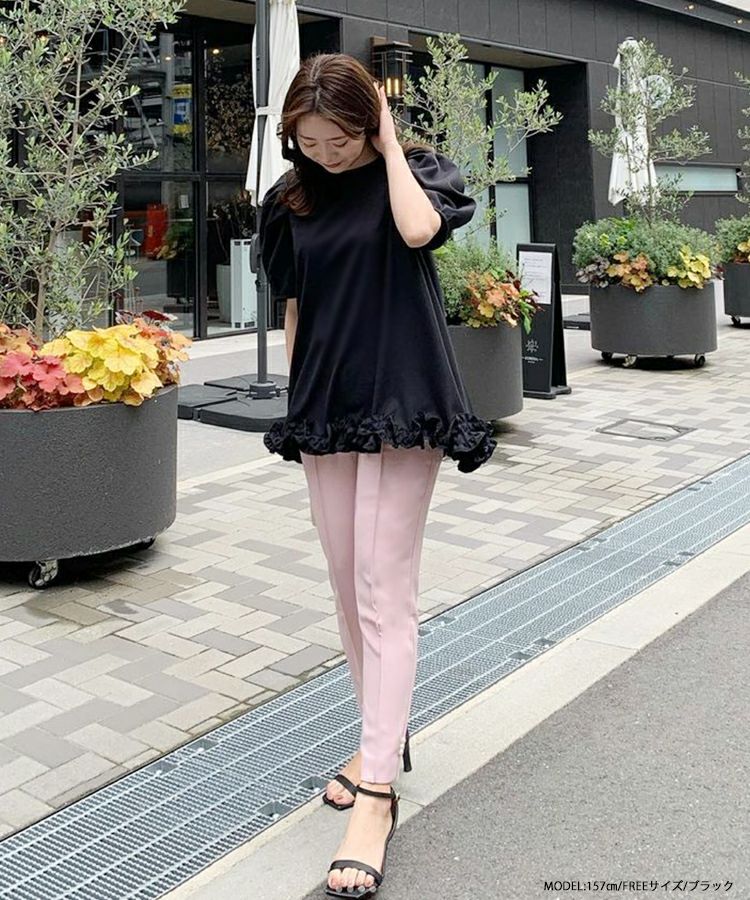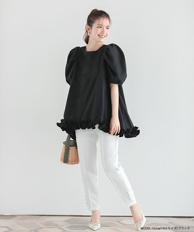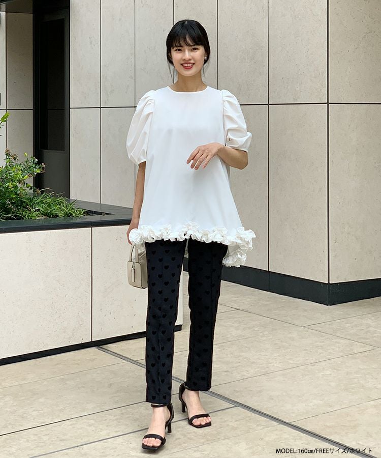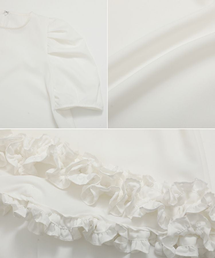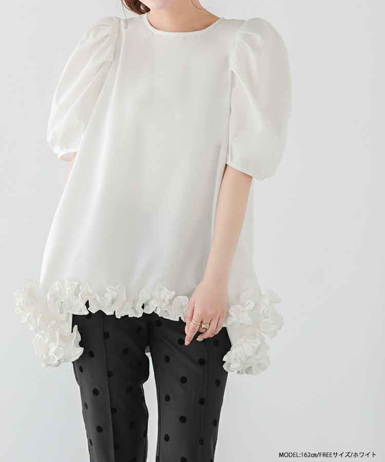 ランダムな立体感のある裾のフリルとボリューム袖が可愛く