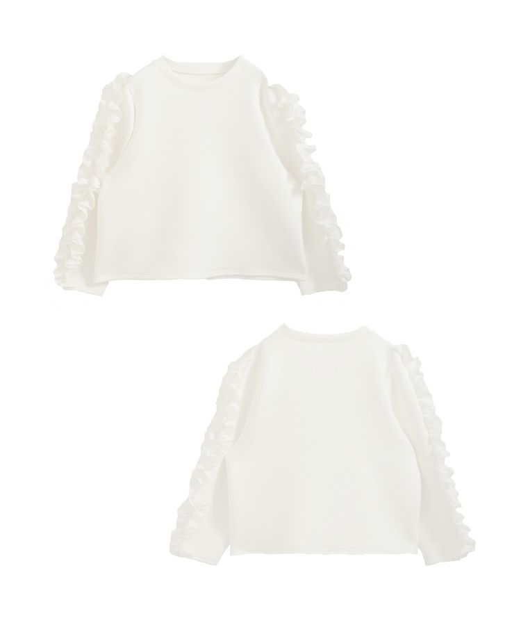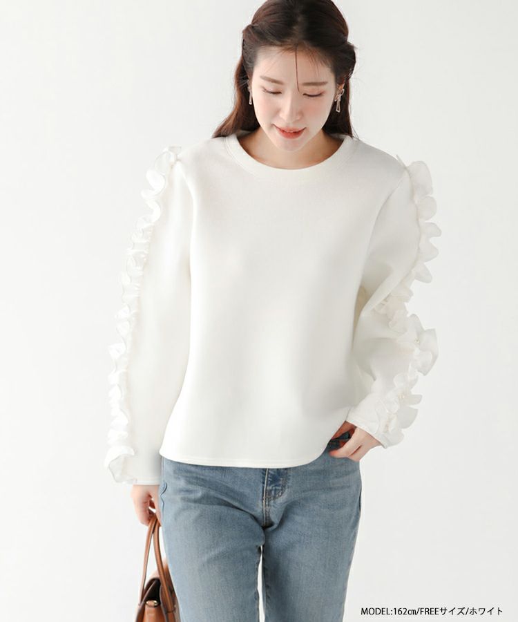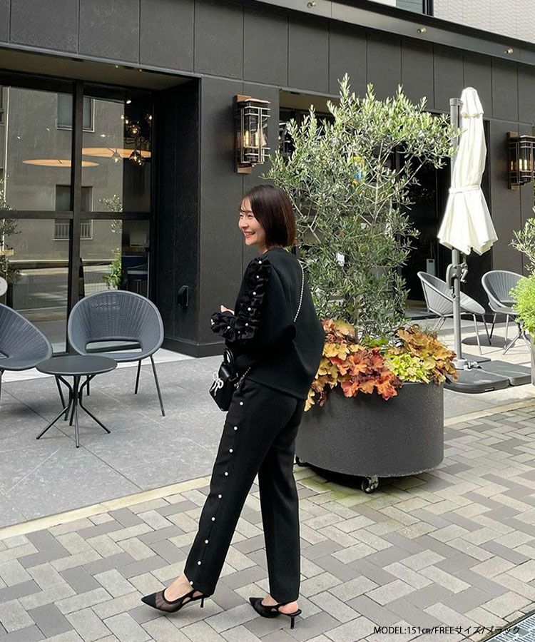 立体的なフリルスリーブとパールが目を引くトップスが登場。