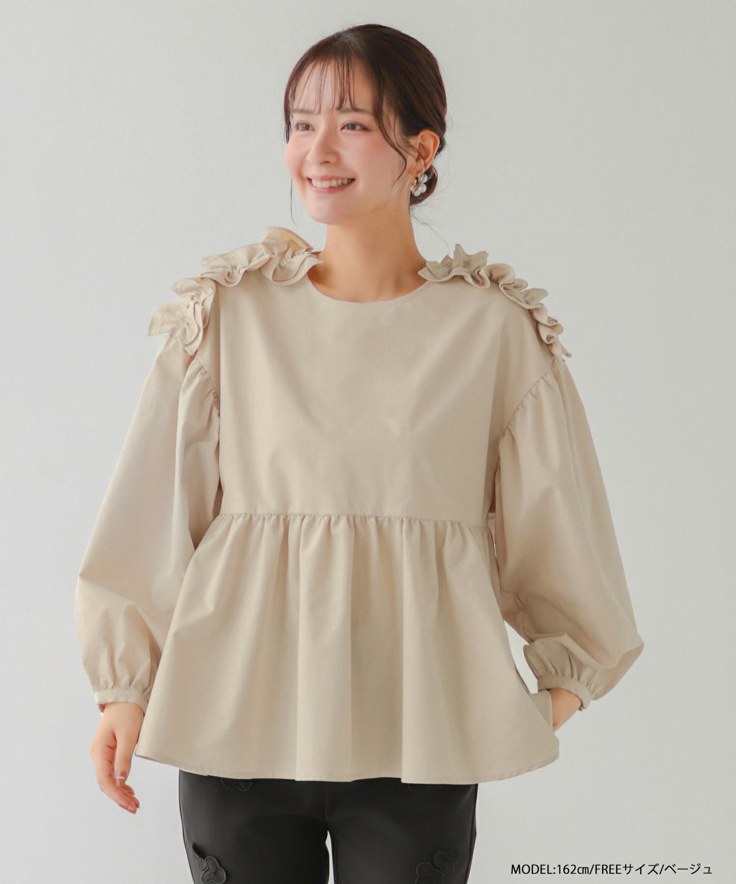 2024aw フリル ブラウス ペプラム バルーンスリーブ ショルダーフリル長袖ペプラムブラウス【宅配便】