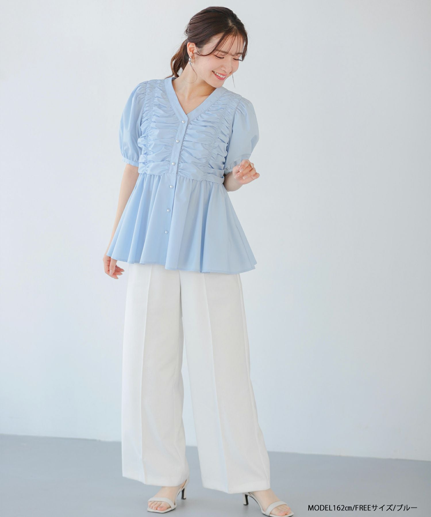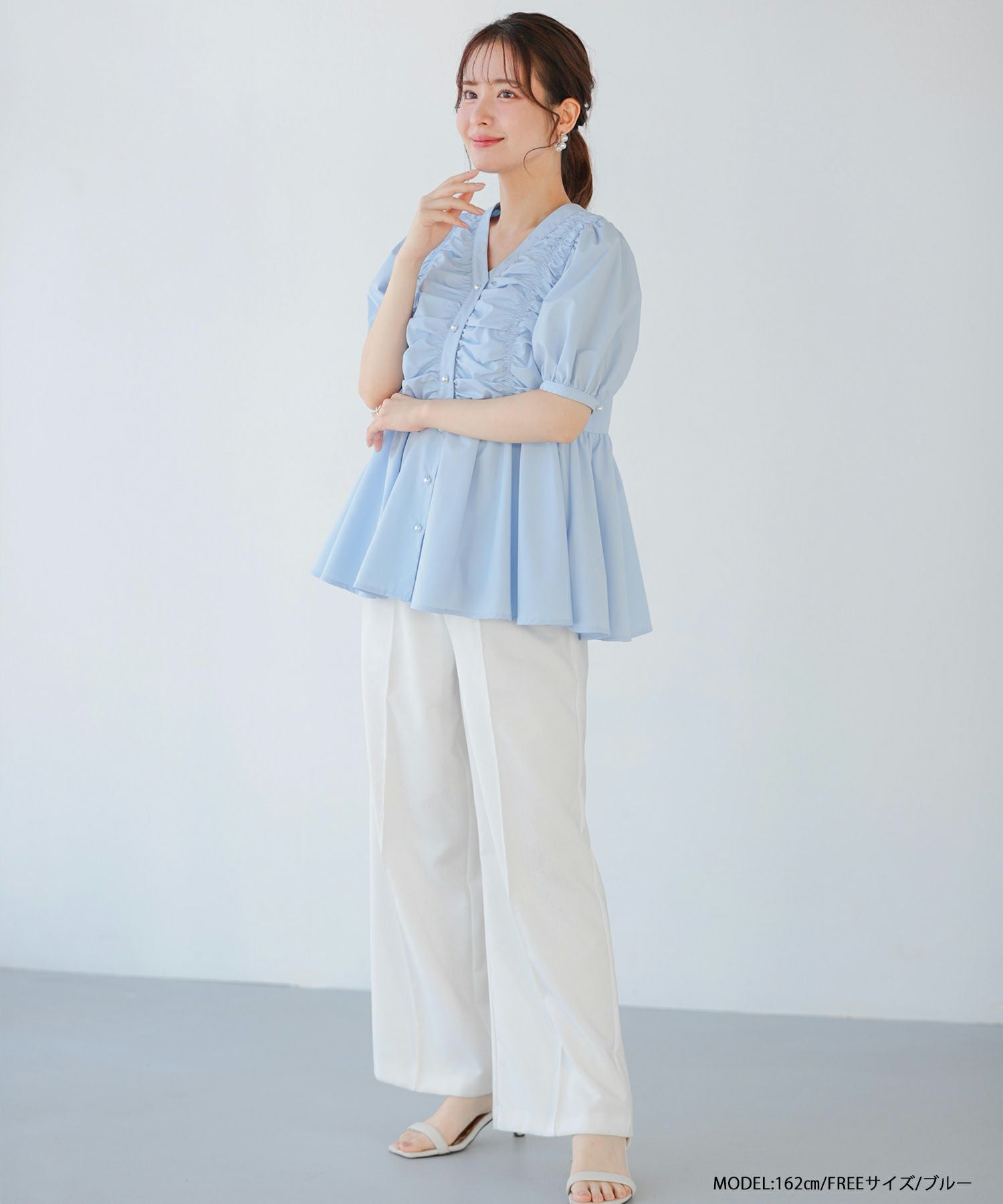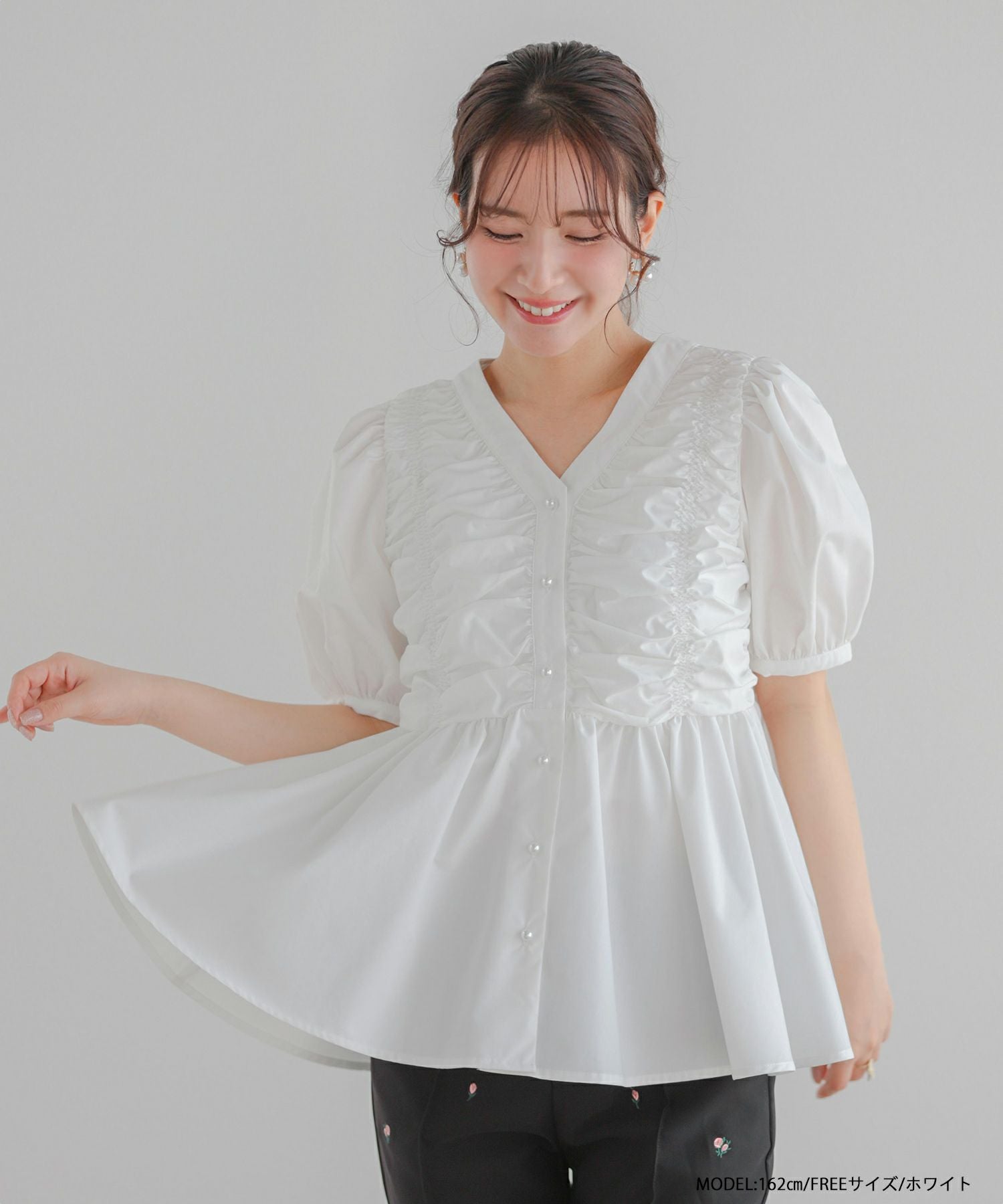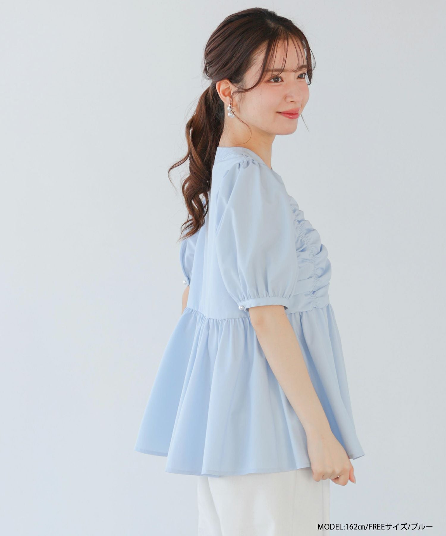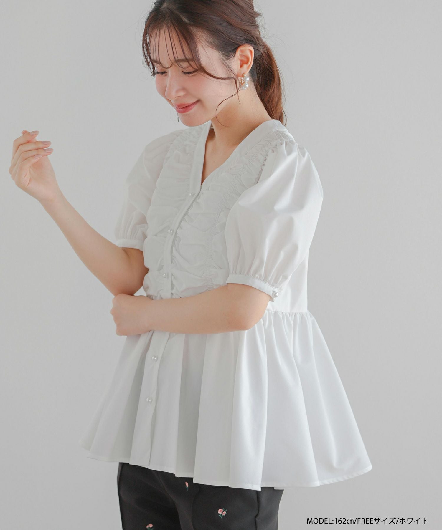 2025ss ブラウス ギャザー パール ペプラム パフスリーブ ギャザーパフスリーブペプラムブラウス【宅配便】