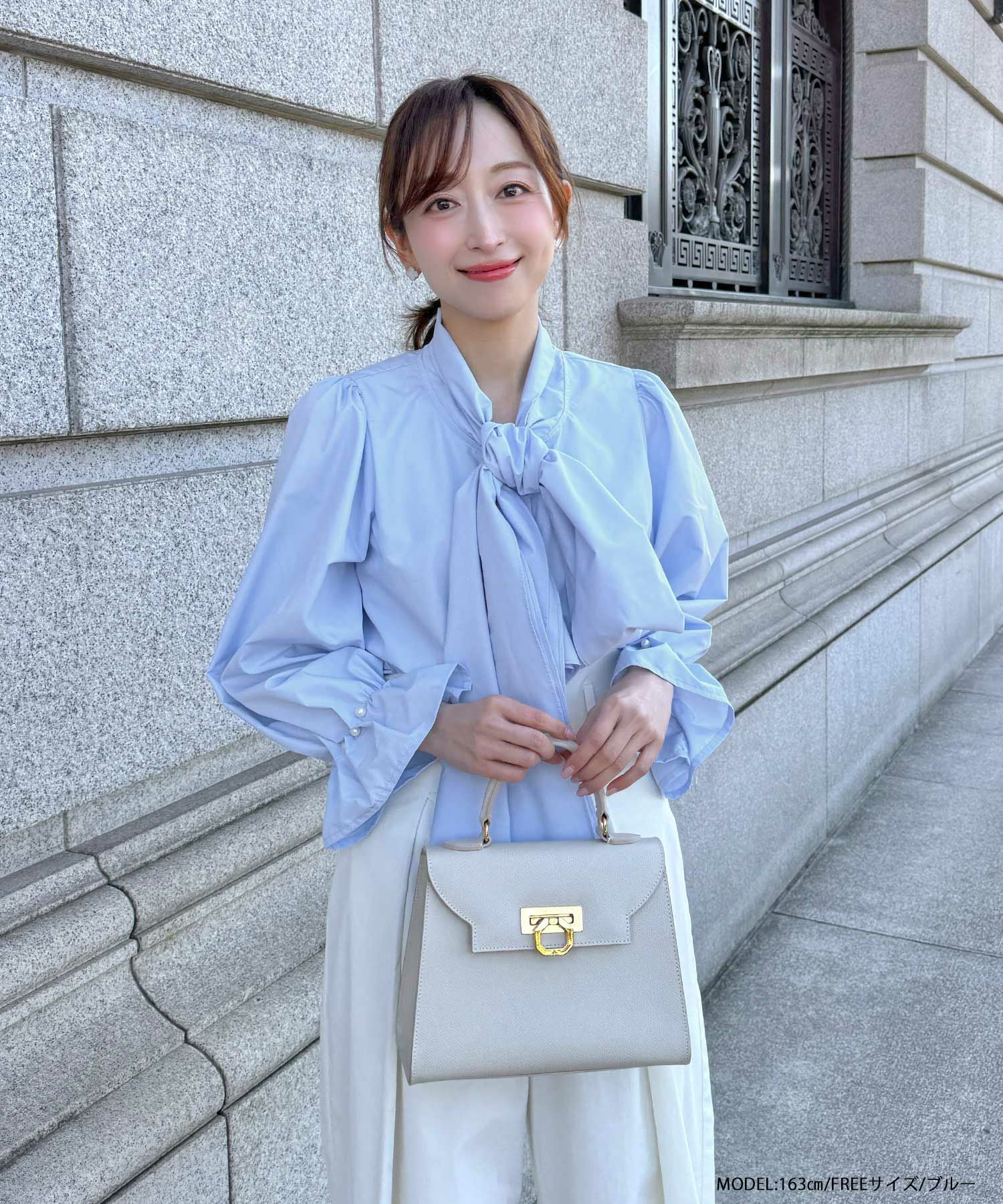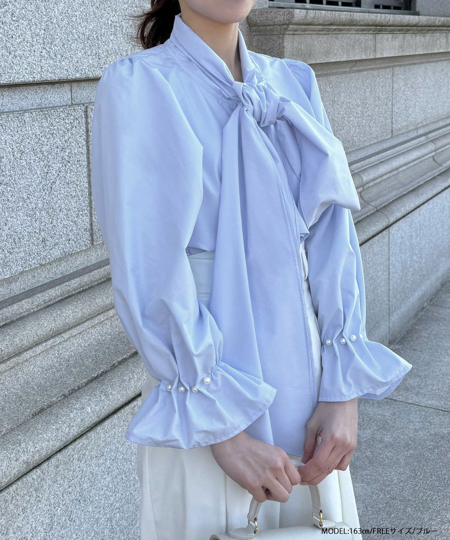 華やかなリボンタイとタックパール袖が華やかなブラウス。