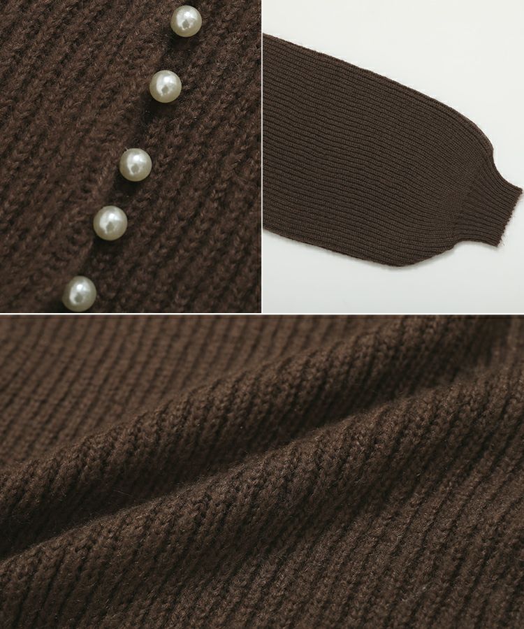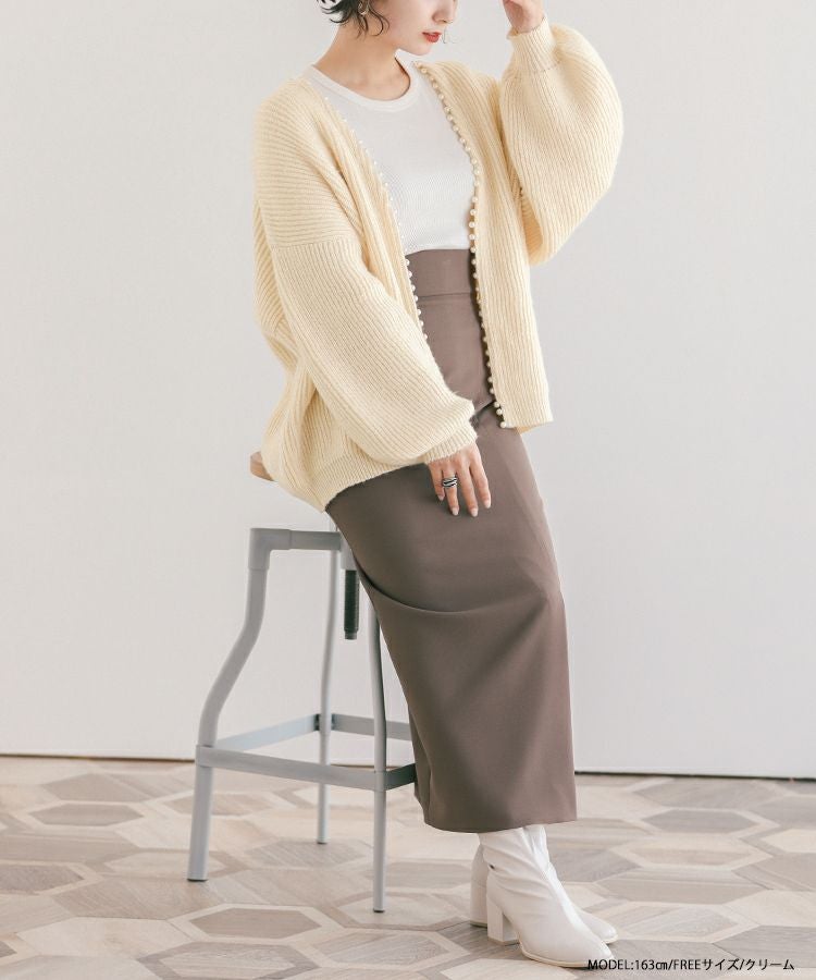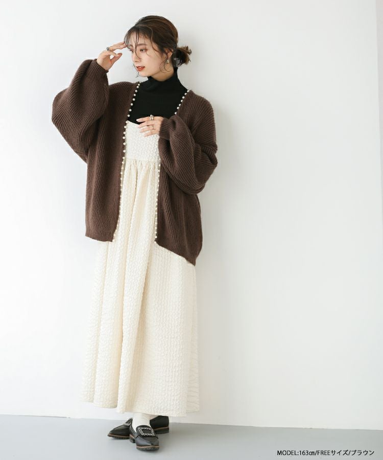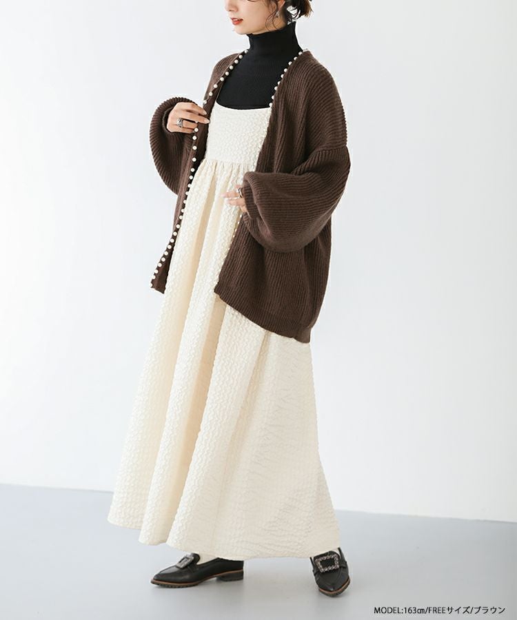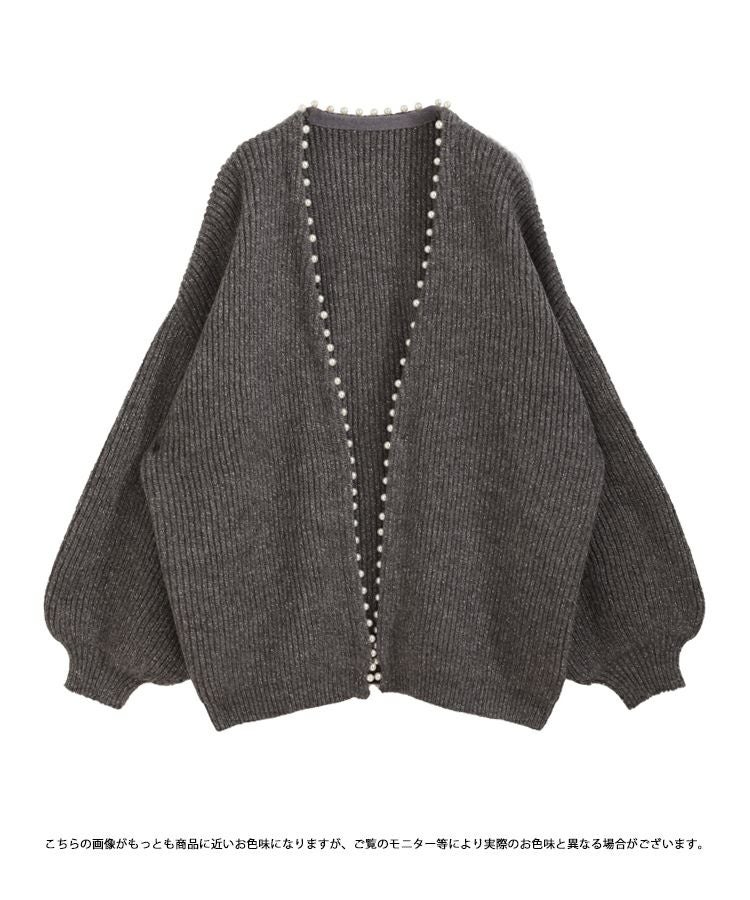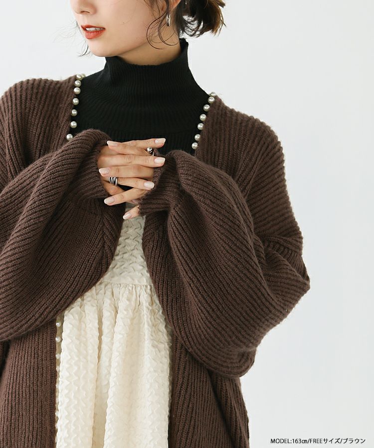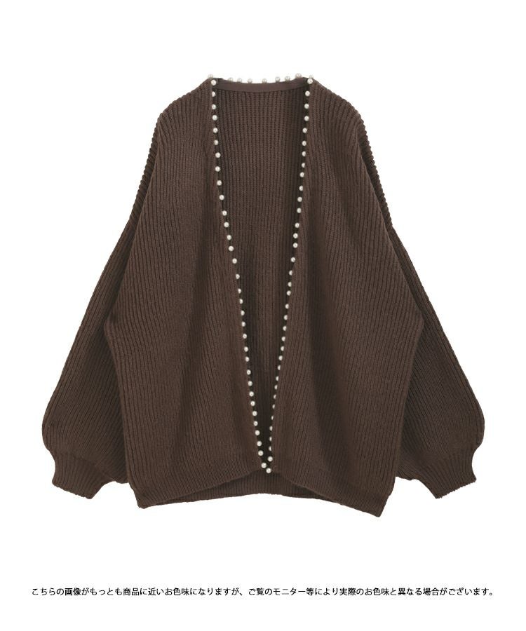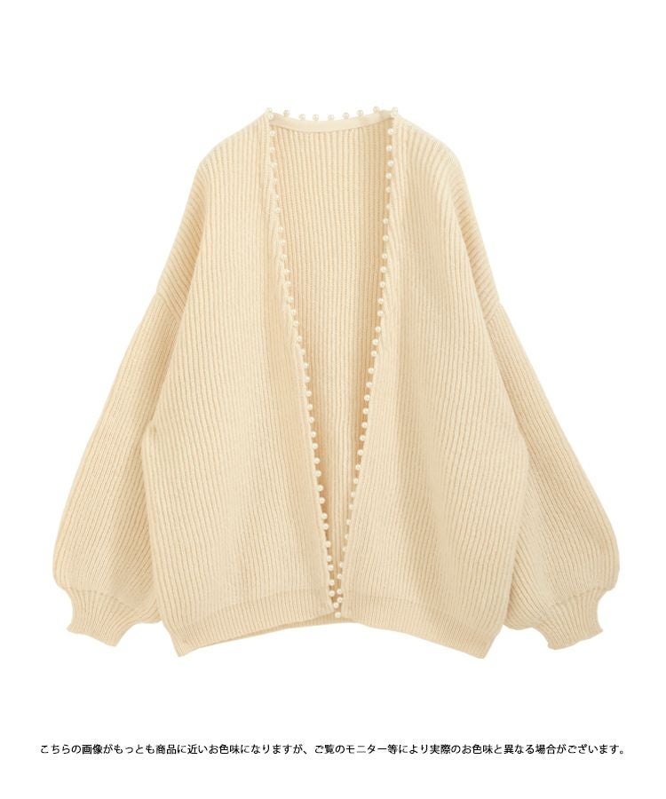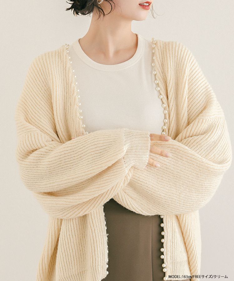 首元から裾にかけてパールをあしらったエレガントなカーディガン。