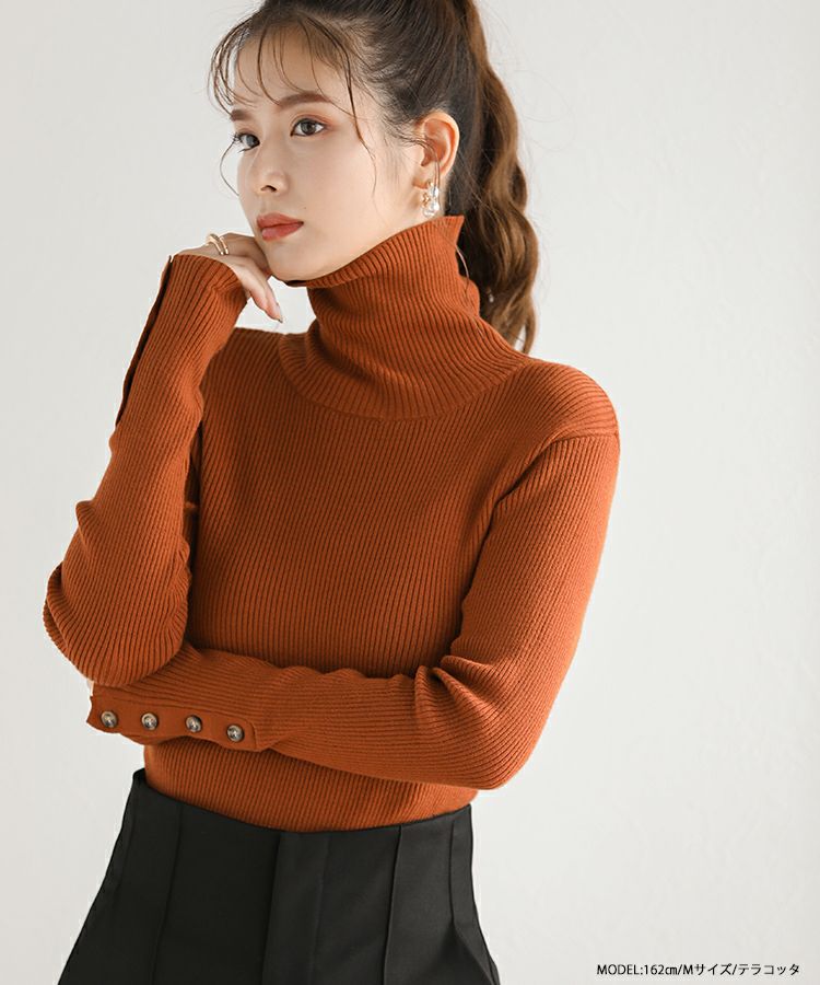 袖口にボタンをあしらったハイネックリブニット。