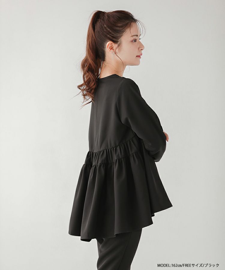 高めのウエスト位置からふんわりと広がるペプラムシルエットで