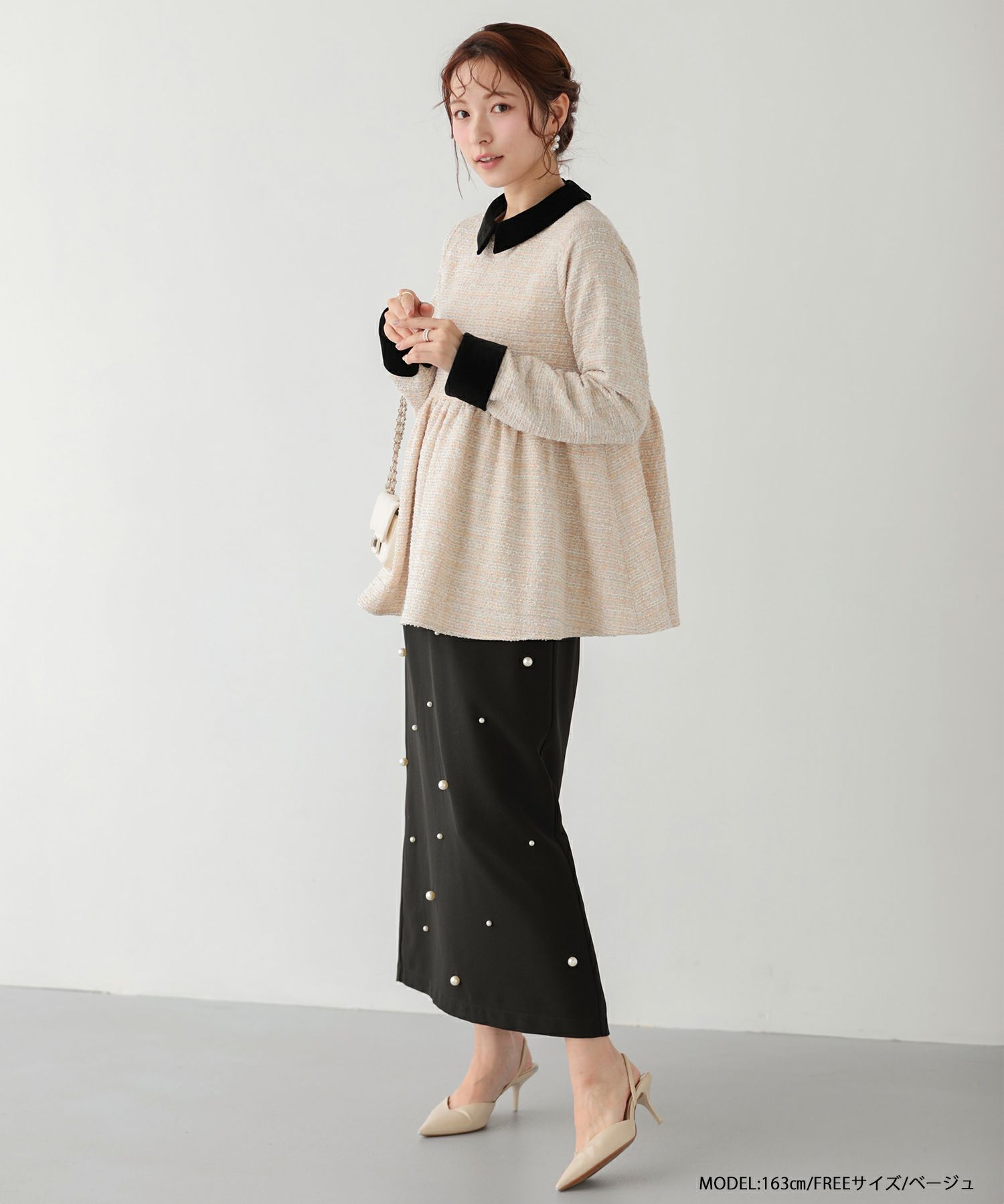 2025aw ベロア ツイード ペプラム ツイードベロアカラーペプラムトップス【ベージュ予約10/21~順次発送】【グレー・ピンク予約10/30~順次発送】【宅配便】