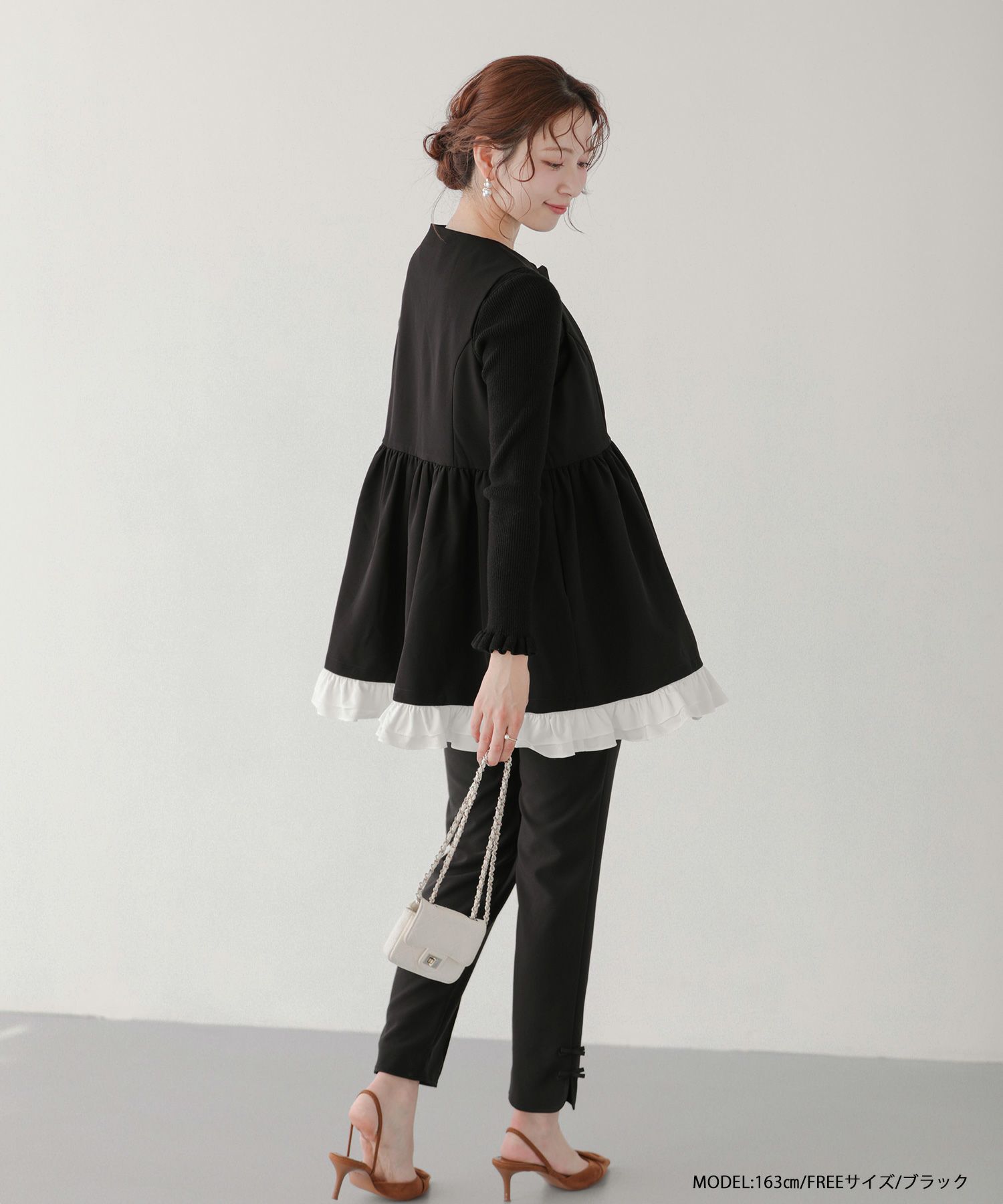 裾にはふわっと広がるフリルをあしらい、スタイリングにさりげない華やかさをプラス。