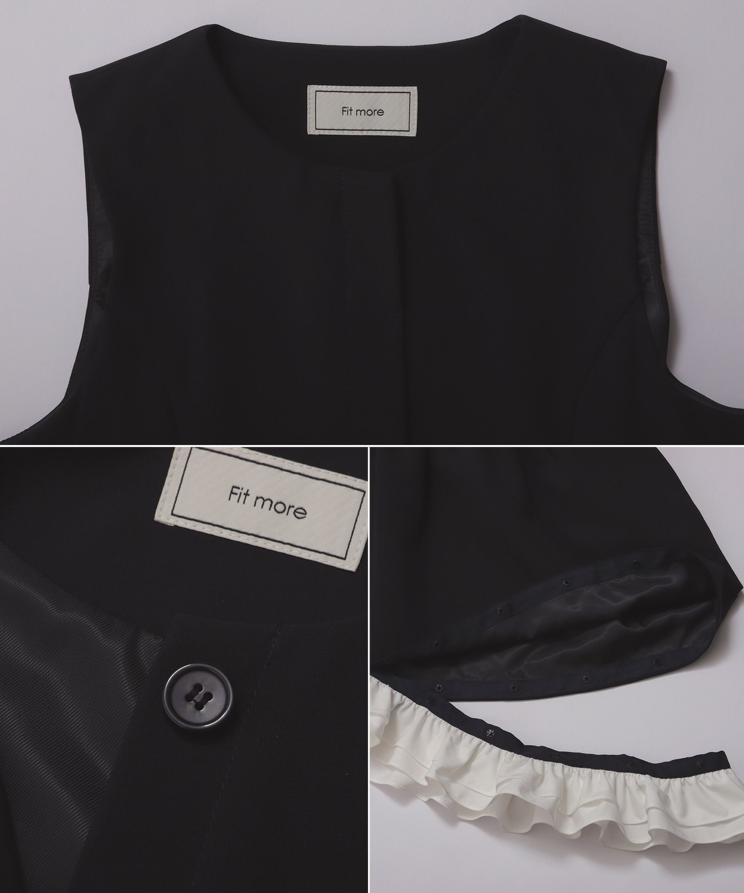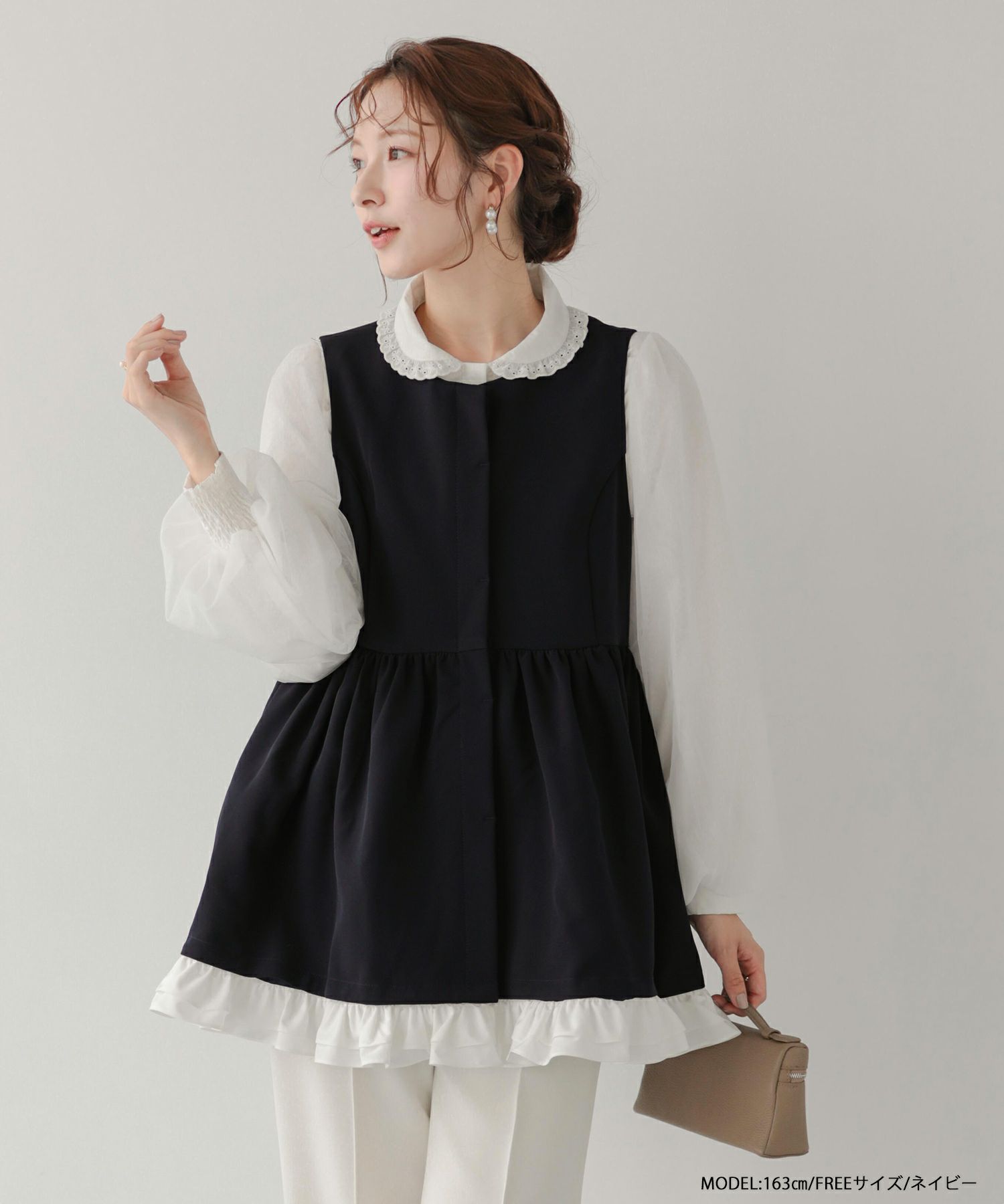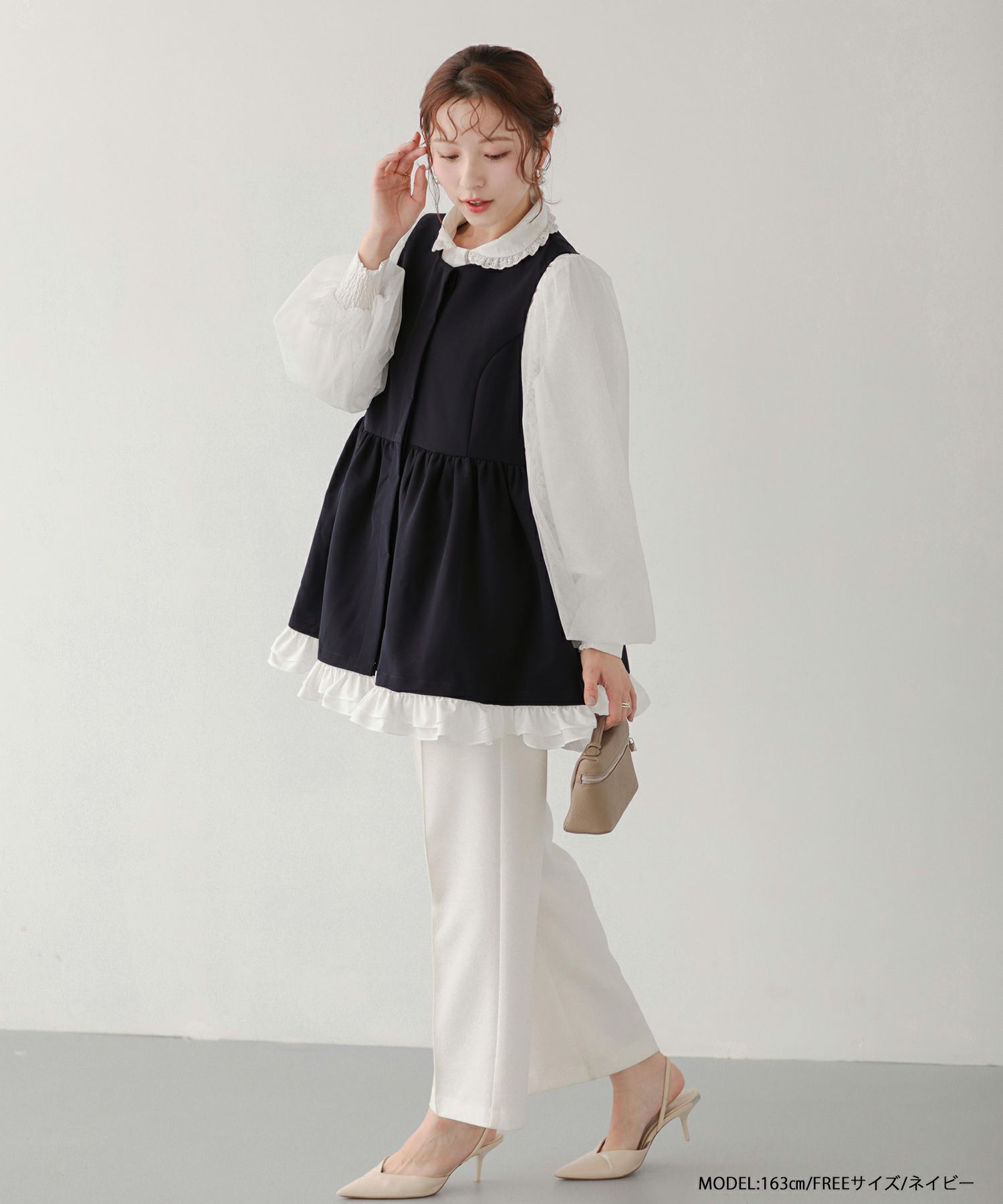 フリルは取り外し可能で、シーンに合わせてシンプルにもフェミニンにも着こなせる2WAY仕様です。