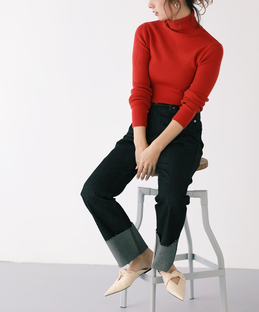 トップス/指穴付きタートルリブニット