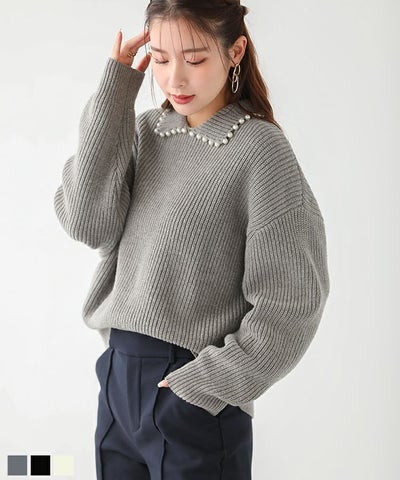 パールをあしらった襟のデザインが可愛いです。生地も毛足が長いニットとかではないので、毛玉も気になりません。しっかり肉厚です。