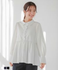 首元の一つぶだけのパールボタンが上品に見えます。それ以下はスナップボタンなのも助かります! -