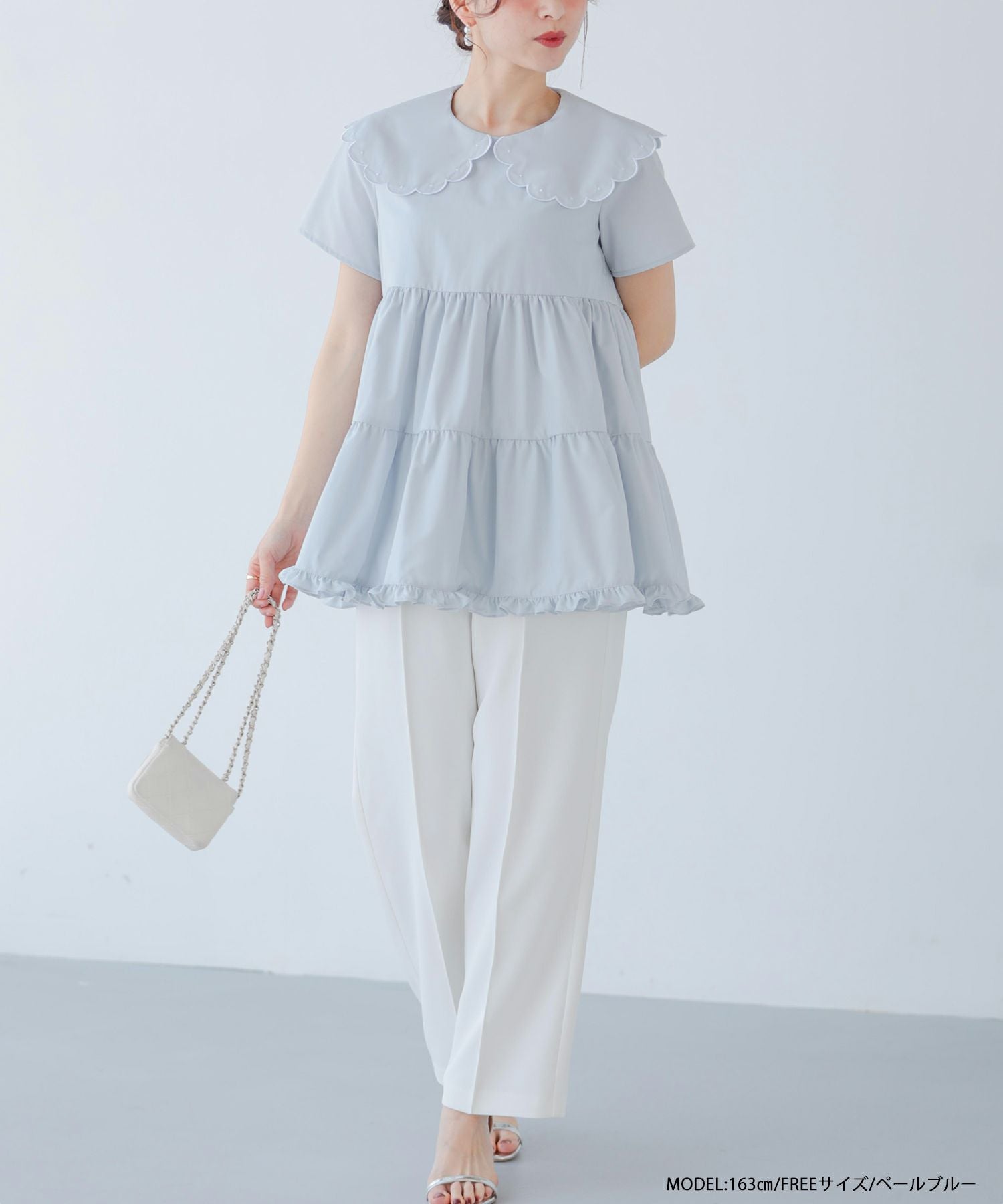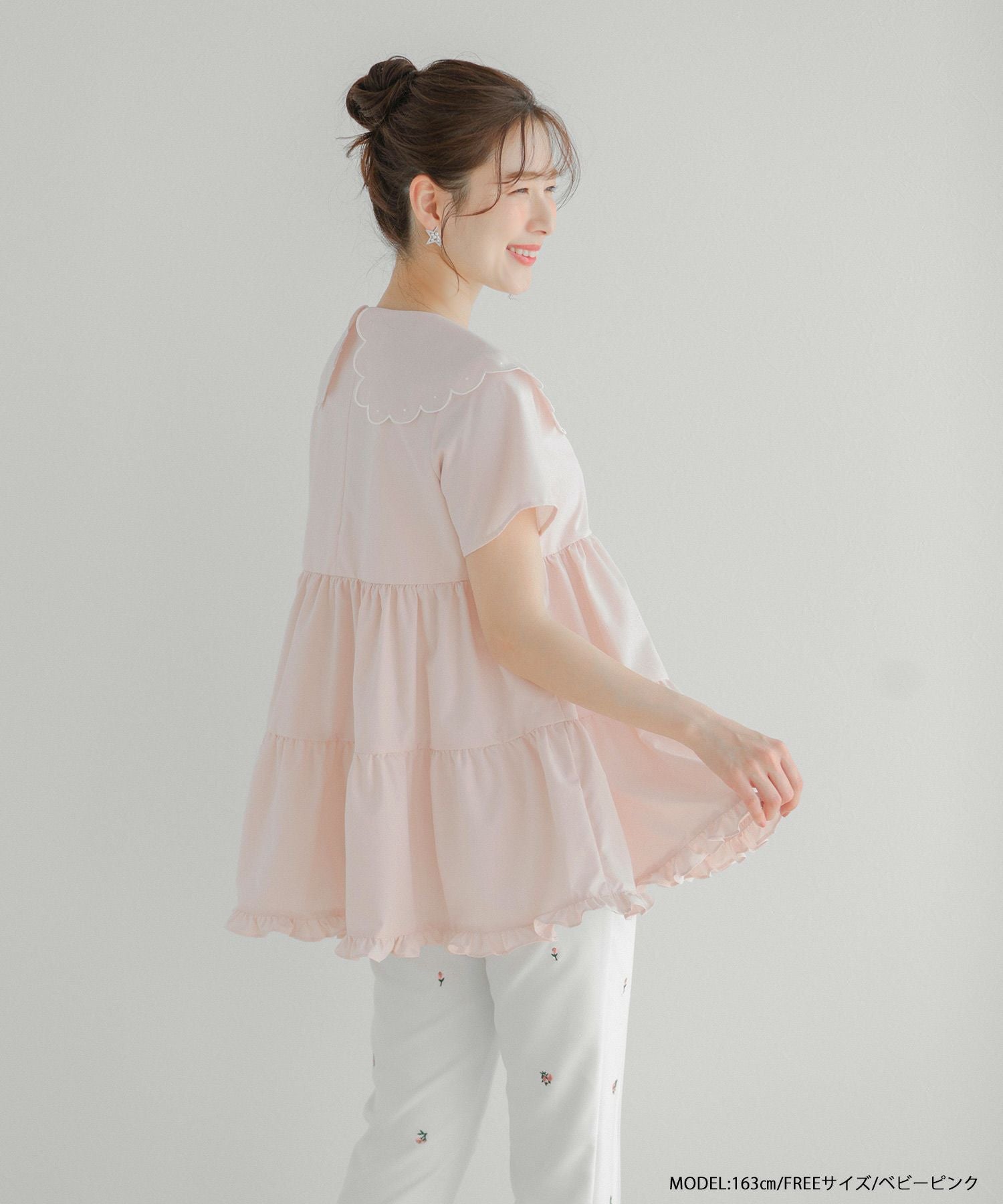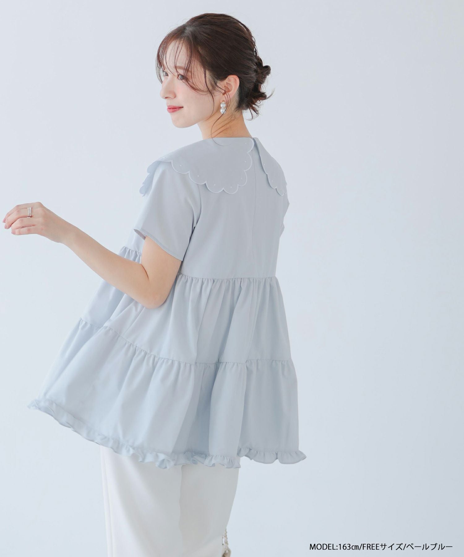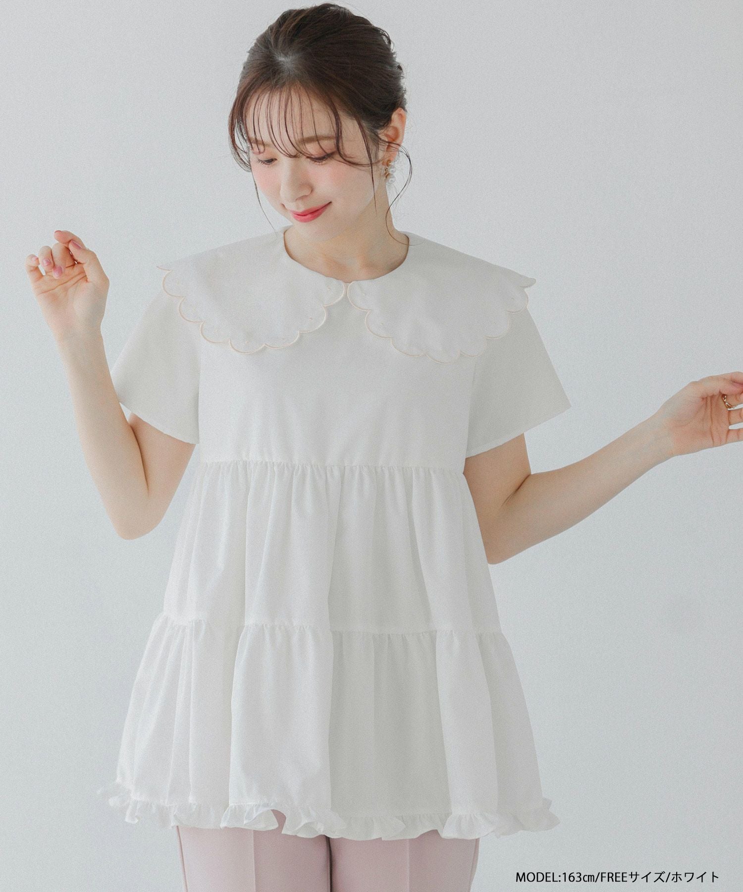 他の画像を見る 2025ss ブラウス 刺繍 スカラップ フリル ティアード ギャザー トップス ドット刺繍スカラップカラーギャザートップス【宅配便】 価格 ¥ 11,900 税込 お気に入りに登録する